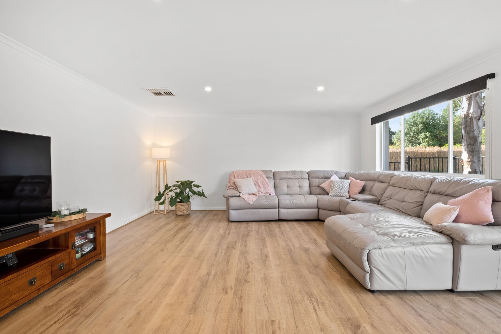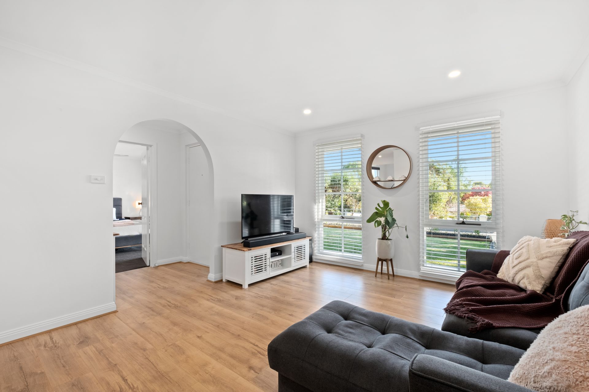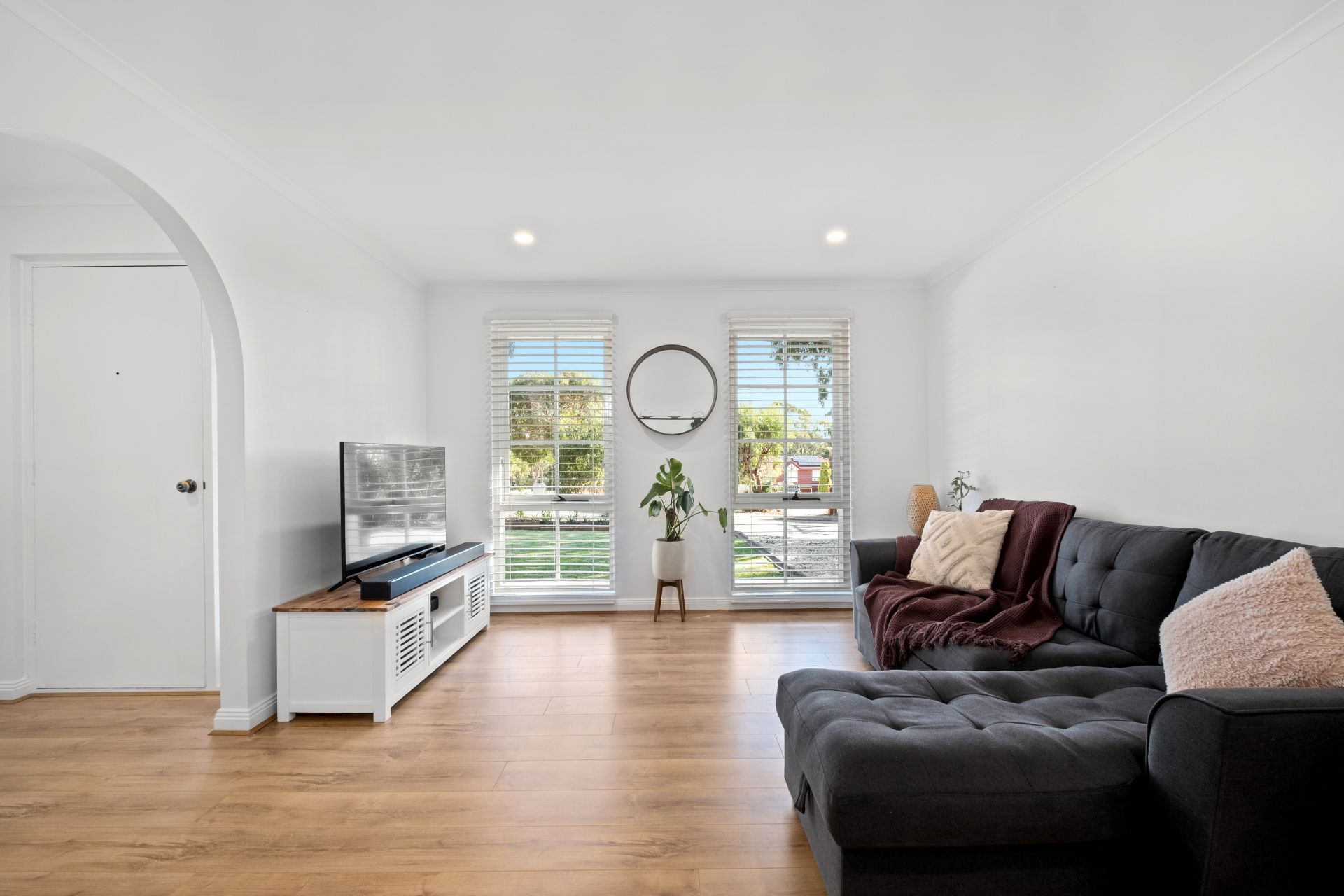 Upon entrance to the home, you are welcomed by a neat entryway that flows past a formal lounge, featuring picture windows showcasing a lovely view through the modern Venetian blinds of the front garden and allowing plenty of natural light to shine through.