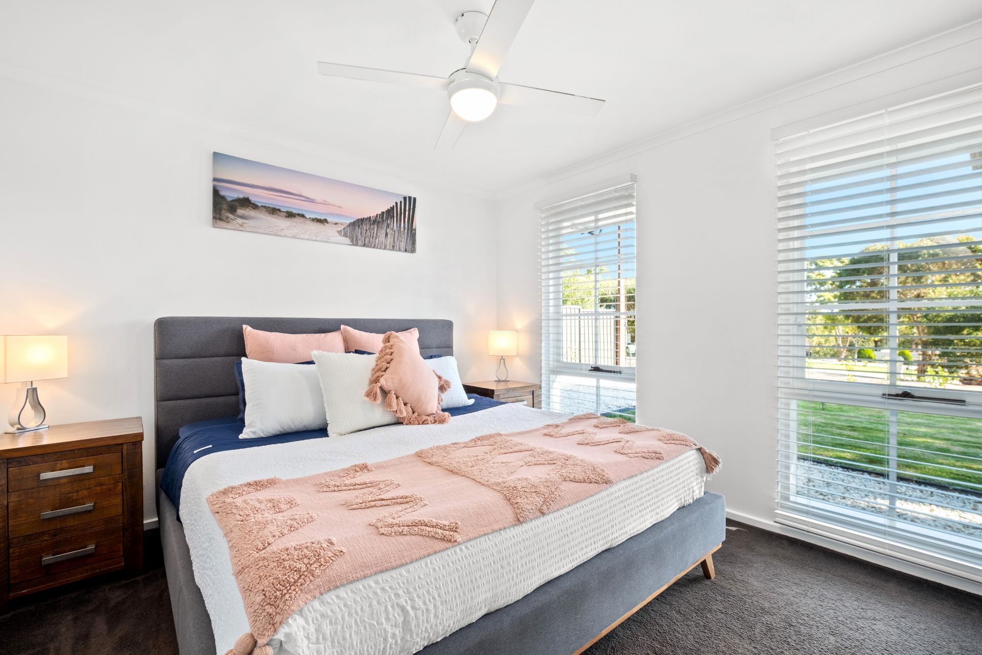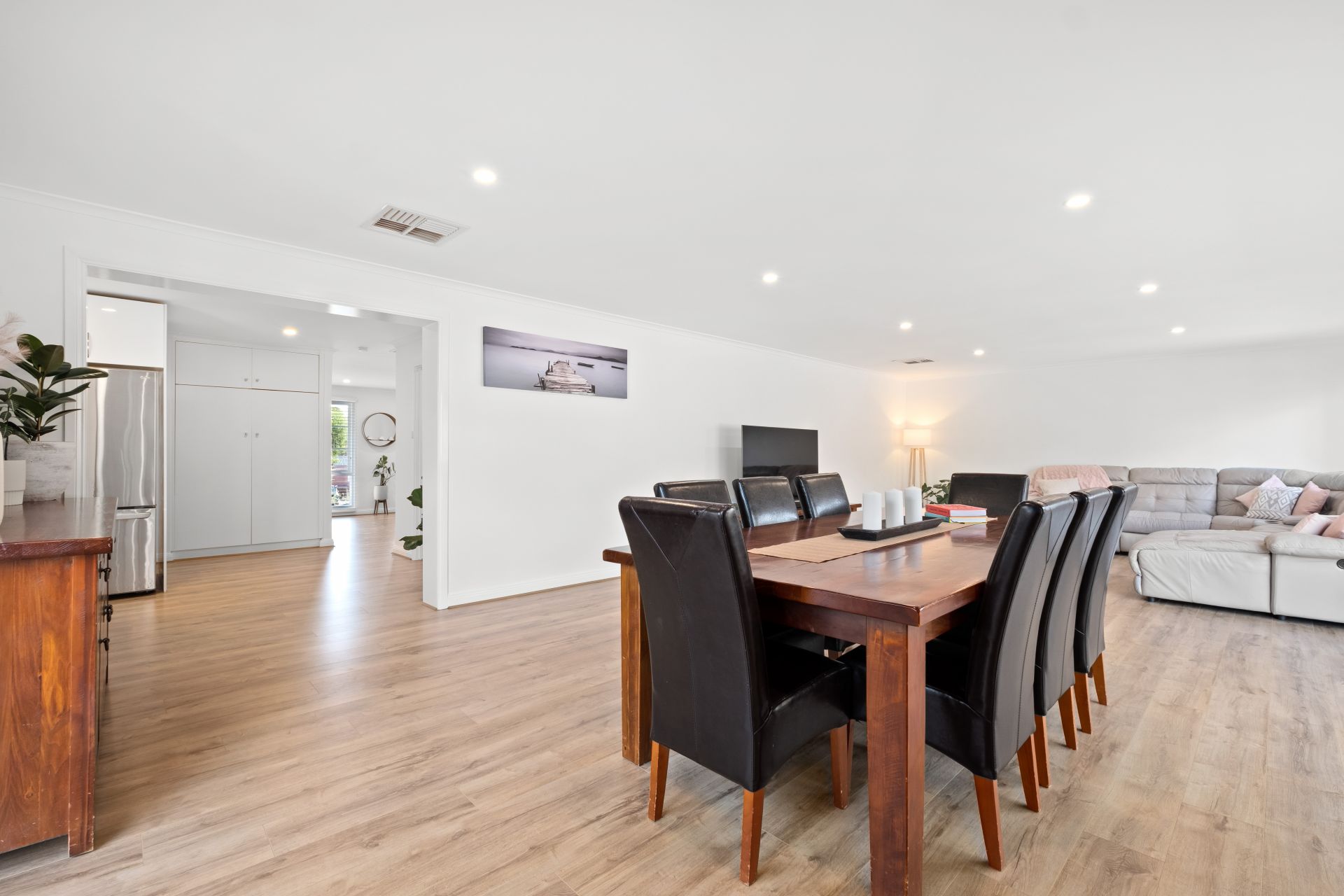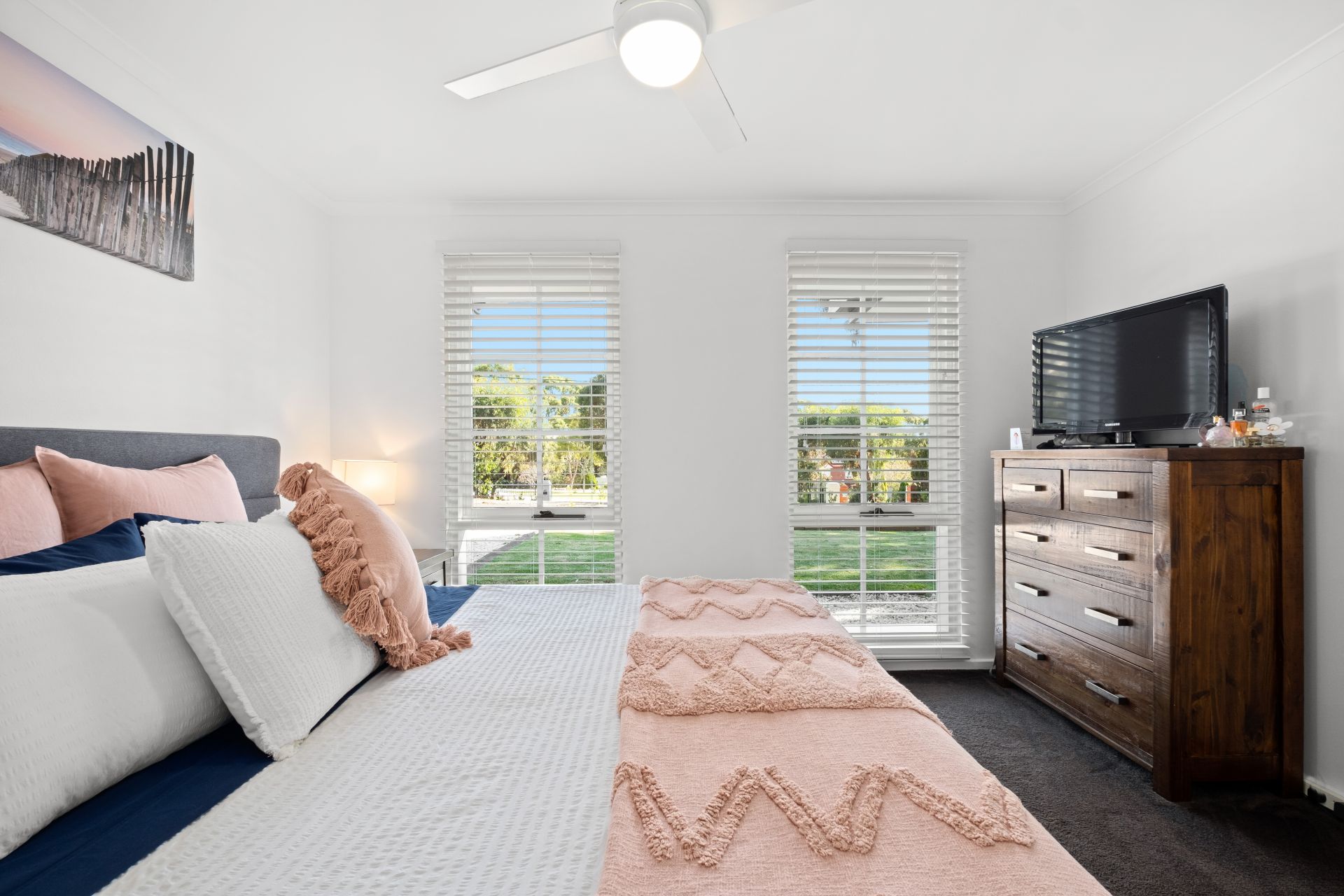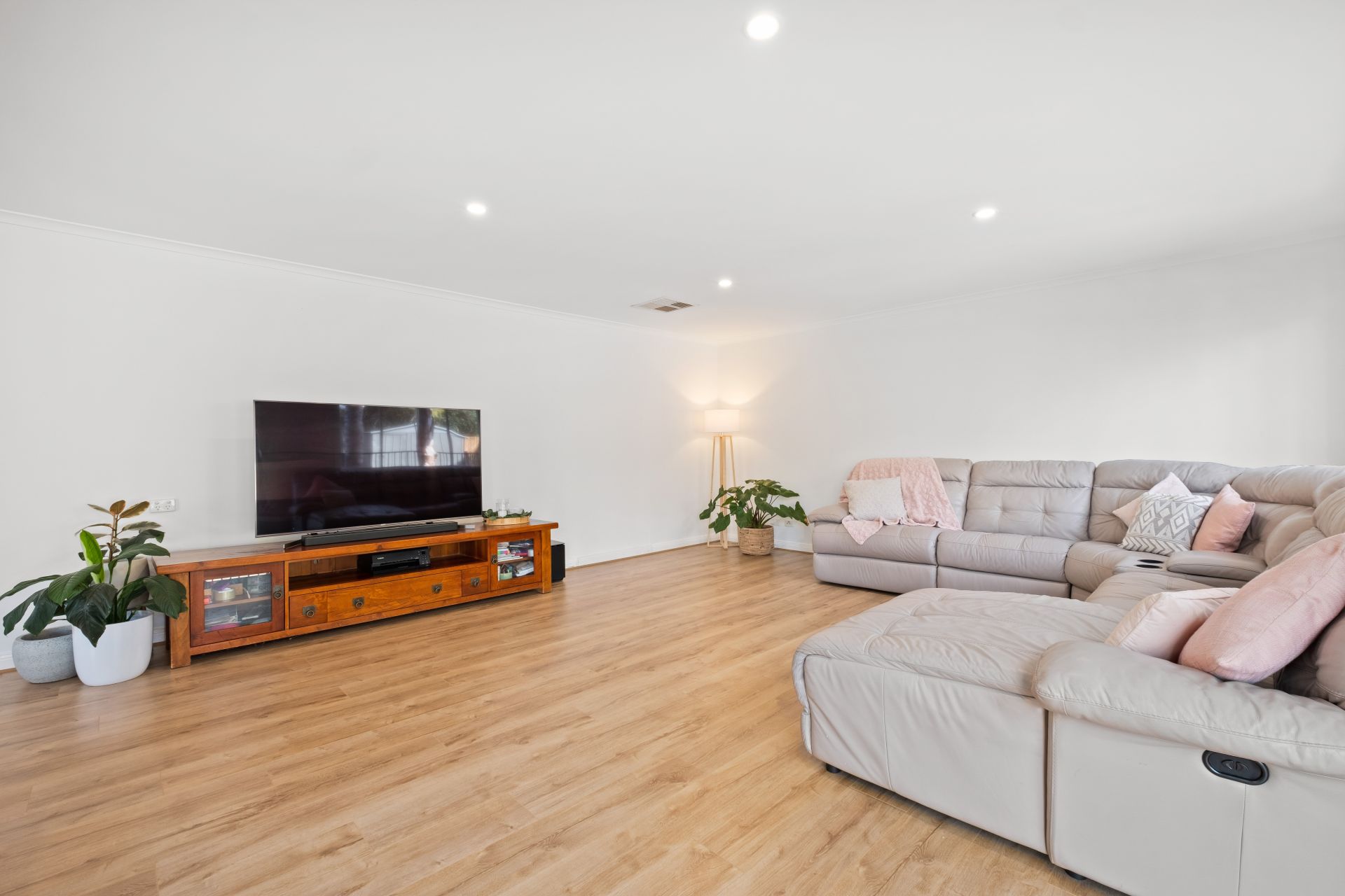 Upon entrance to the home, you are welcomed by a neat entryway that flows past a formal lounge, featuring picture windows showcasing a lovely view through the modern Venetian blinds of the front garden and allowing plenty of natural light to shine through.