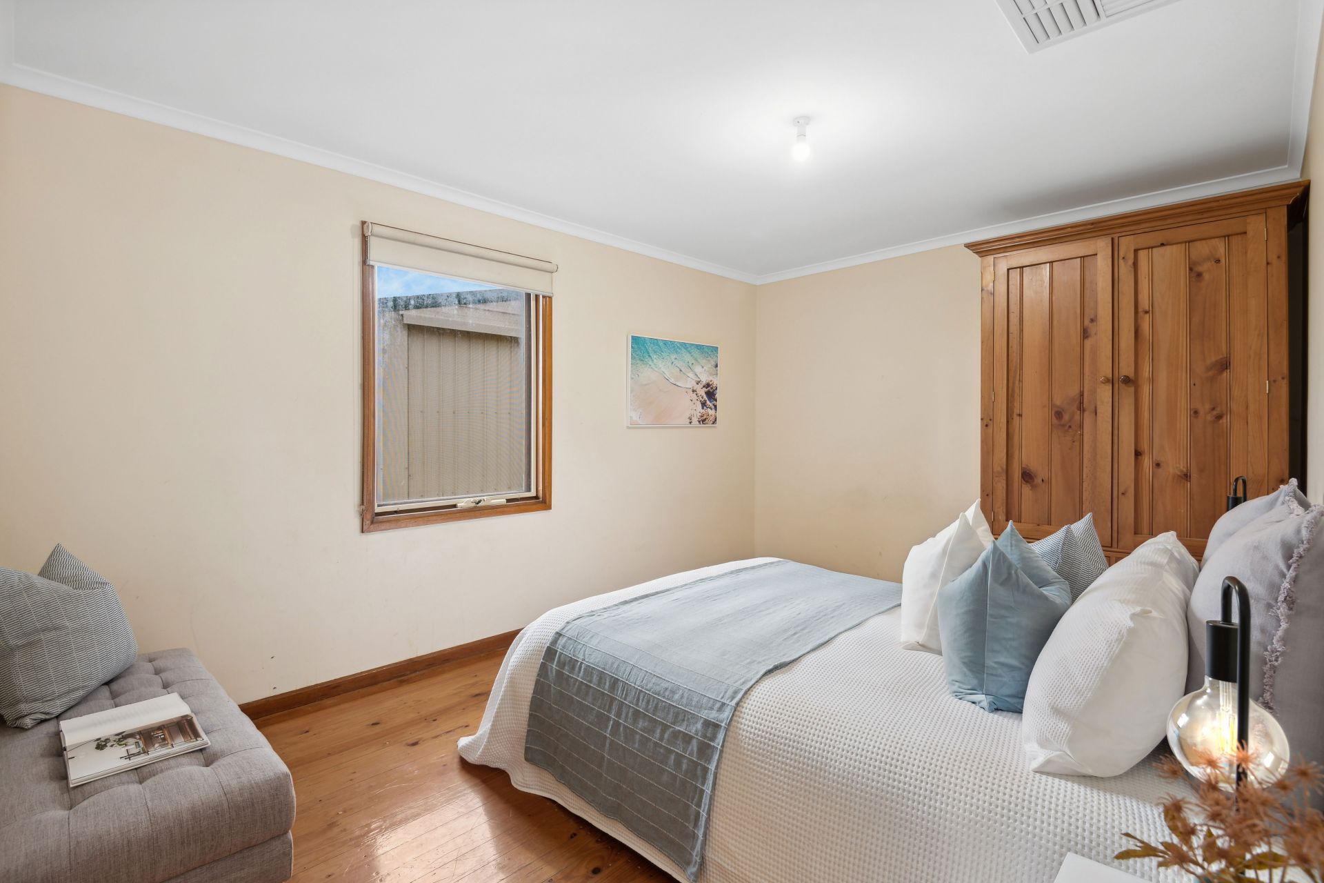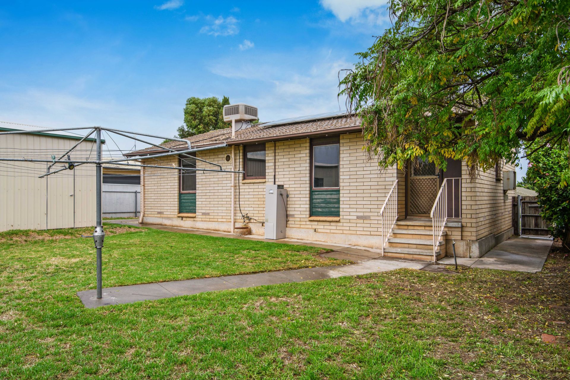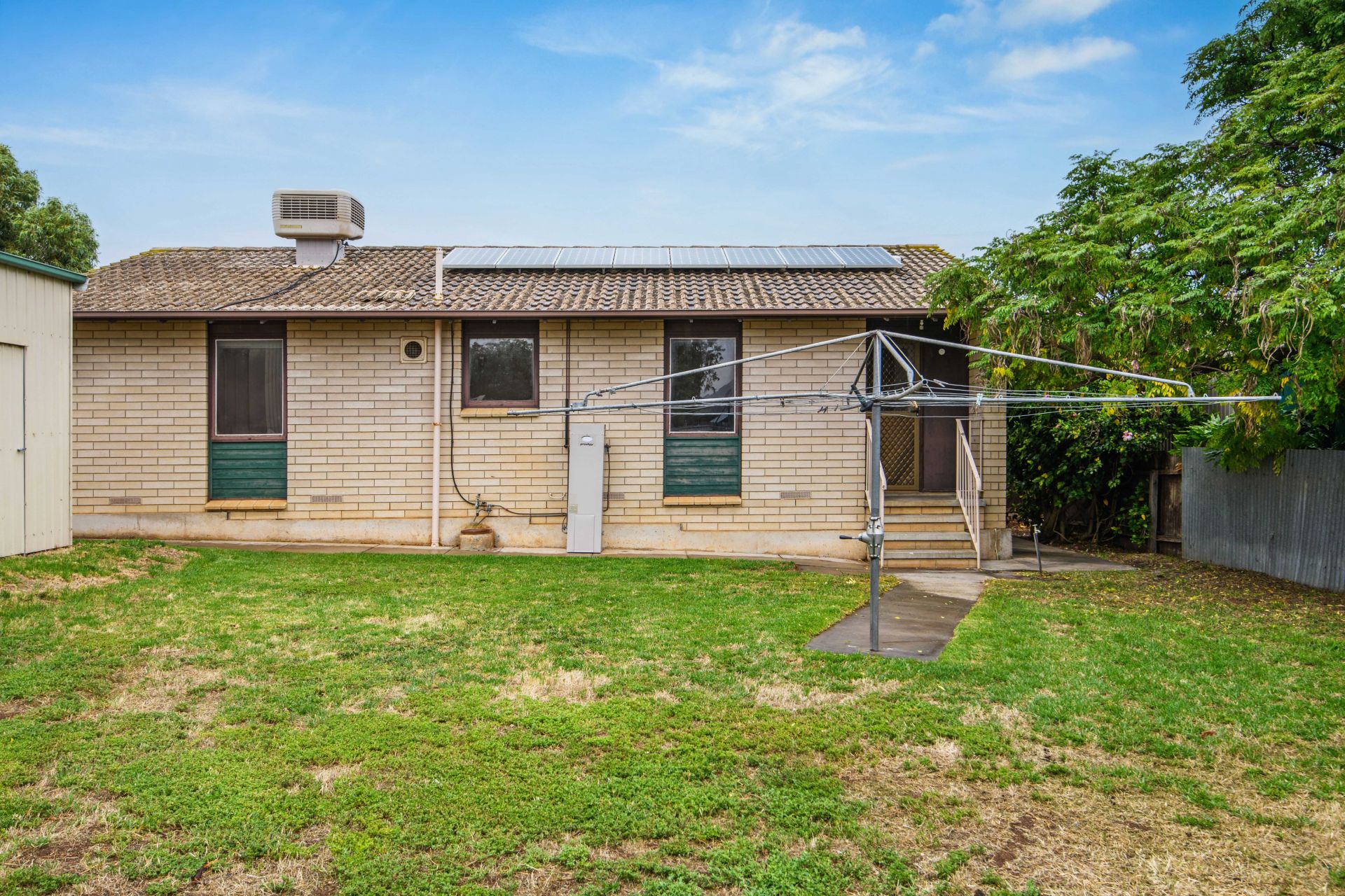 A front porch welcomes you inside, revealing a spacious lounge room which is large enough to relax with the whole family or play host to your beloved guests, featuring polished timber floors and a split system air-conditioner that will keep it comfortable year-round. The light and bright kitchen is designed with both functionality and style in mind boasting an electric cooktop and oven, ample bench space and storage allowing you to effortlessly whip up culinary delights. Natural light pours in through the windows, creating an airy and welcoming atmosphere. All three bedrooms have polished timber floors and easy access to the central bathroom with step-in shower, bath, vanity and a separate toilet to accommodate busy households. Additional features include ducted evaporative cooling throughout, a separate laundry, multiple storage cupboards and solar panels.
