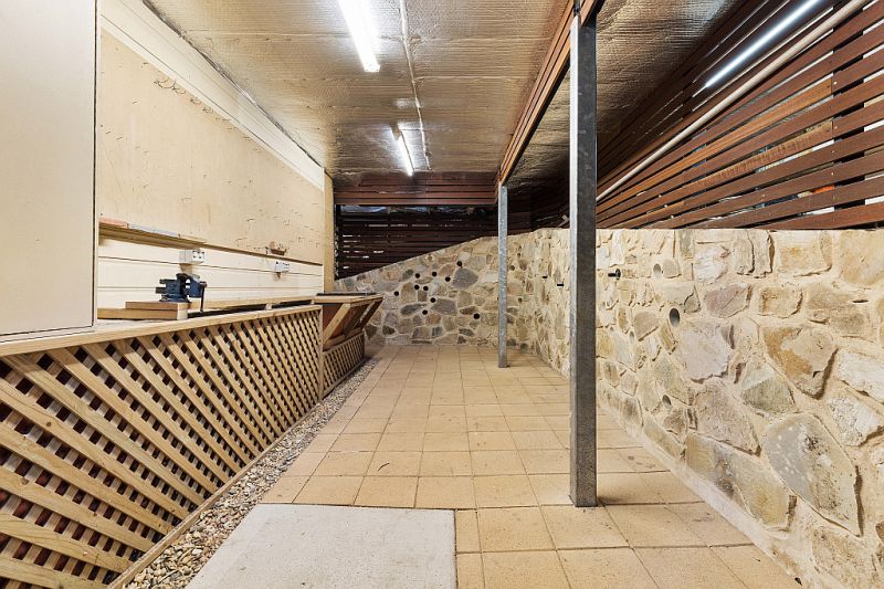 A large under house storage area / workshop has benches and power, plus extra storage around the corner. This area has been paved and has a feature stone wall with wine storage, it can be accessed internally or there is door on the outside so you can store the bikes or kayaks here and take them in and out without going through the home.