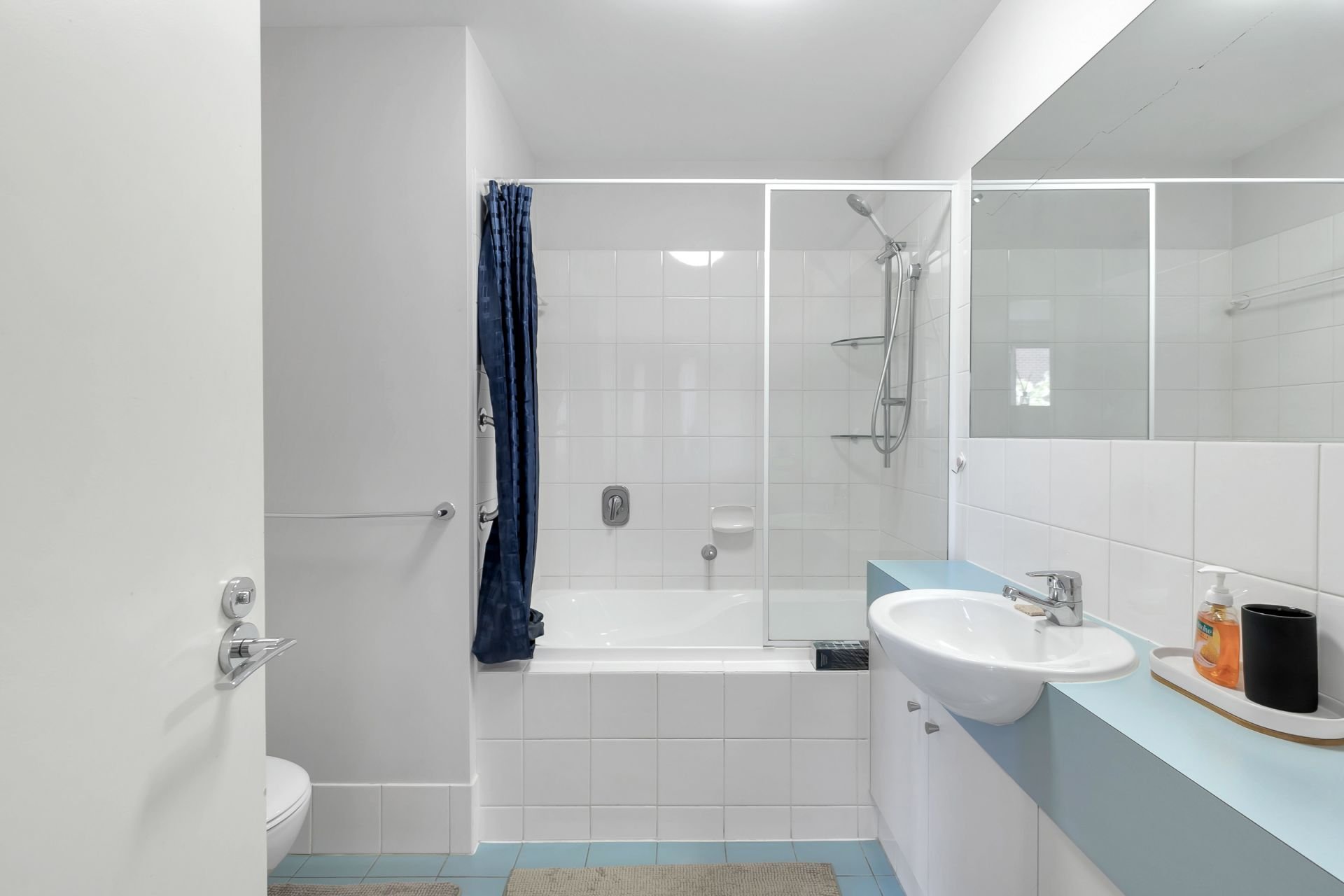 > Bathroom has combined bath and shower for relaxation.