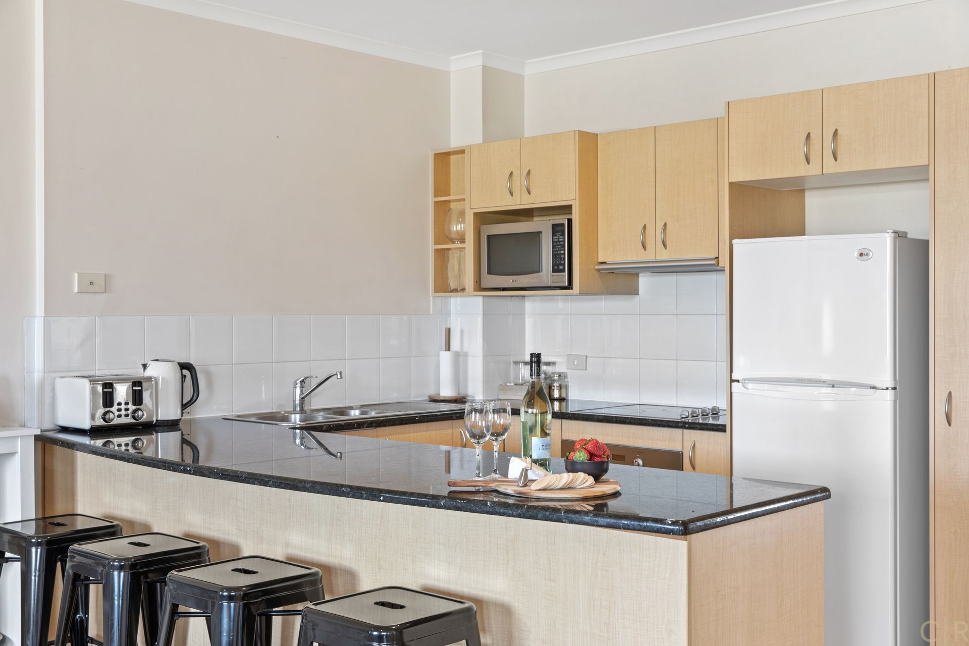 Modern kitchen with granite benchtops overlooks living area