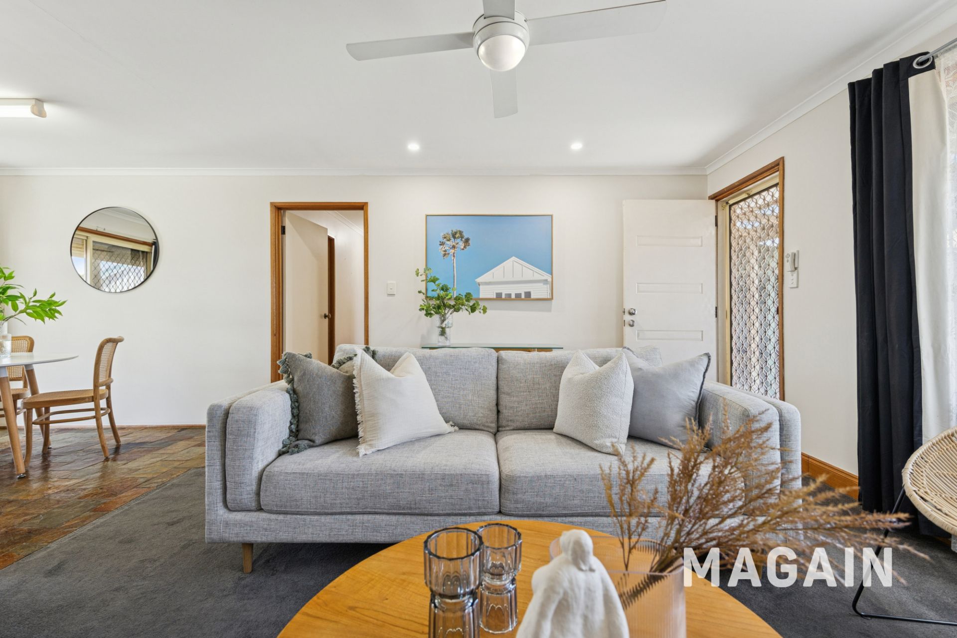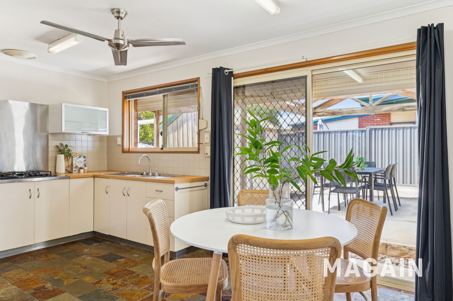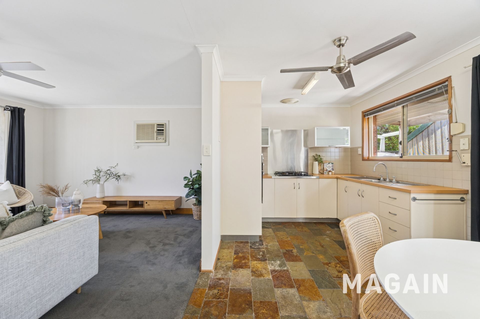 The cottage style façade creates an immediate sense of warmth and welcome, leading inside to an open plan living and dining area enhanced by beautiful slate flooring at the entry. The living zone is cosy and comfortable, featuring soft carpet underfoot, air conditioning and a ceiling fan-perfect for everyday family living.