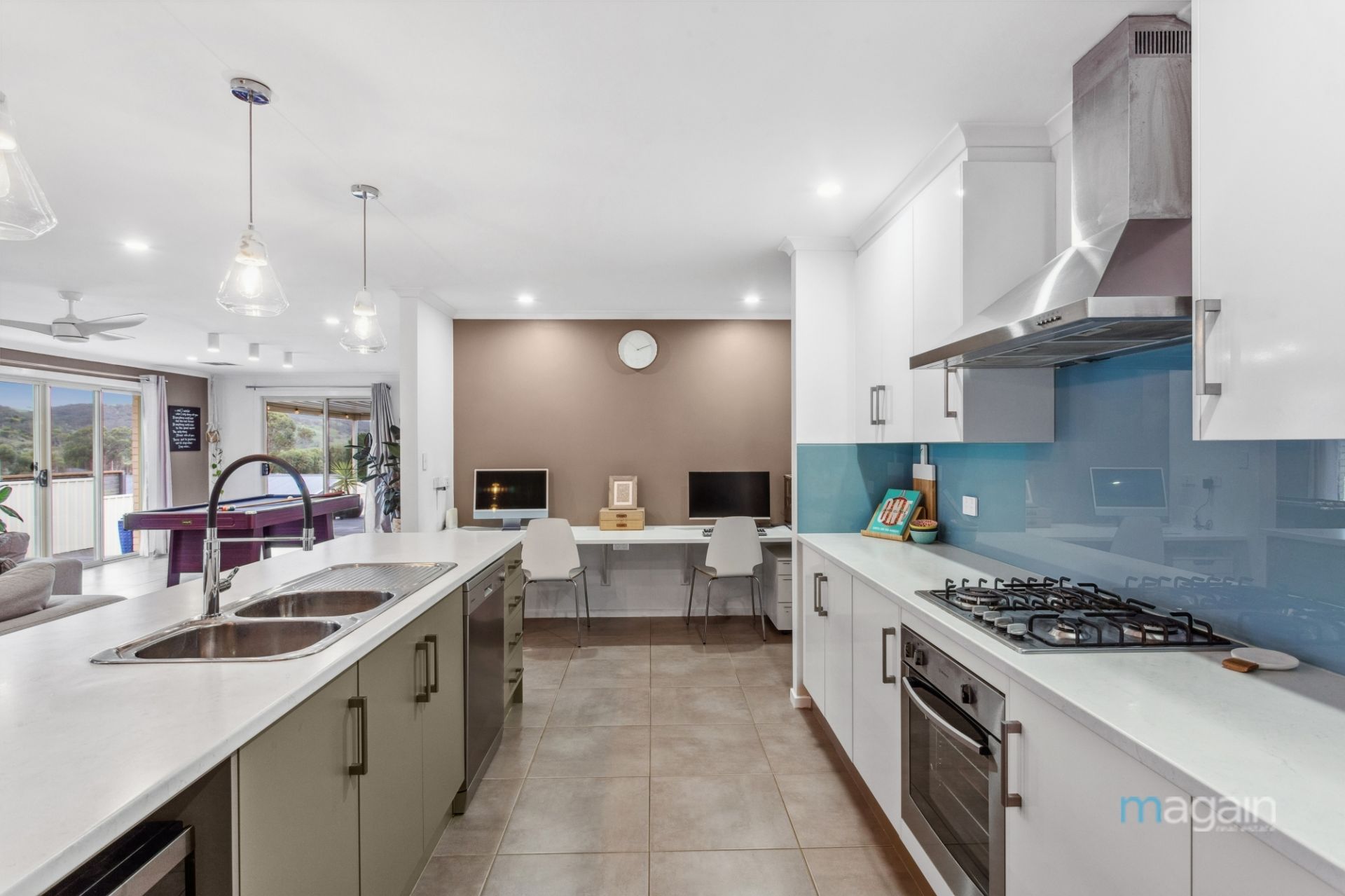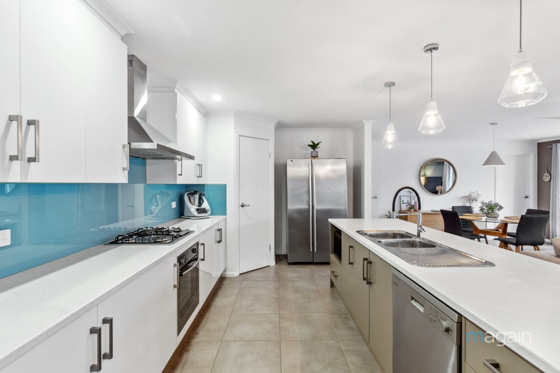 The heart of the home opens to a bright and airy open-plan kitchen, living, and dining area, seamlessly extending to the expansive backyard through two separate sliding doors. The modern kitchen boasts a large island bench, gas cooktop, stainless steel appliances, a walk-in pantry, and ample storage space. A nearby computer nook adds functionality to the space.