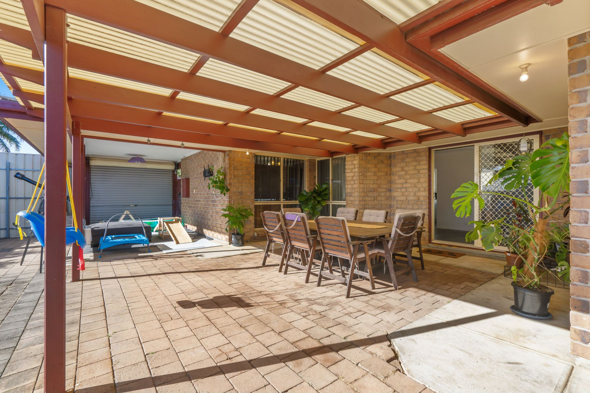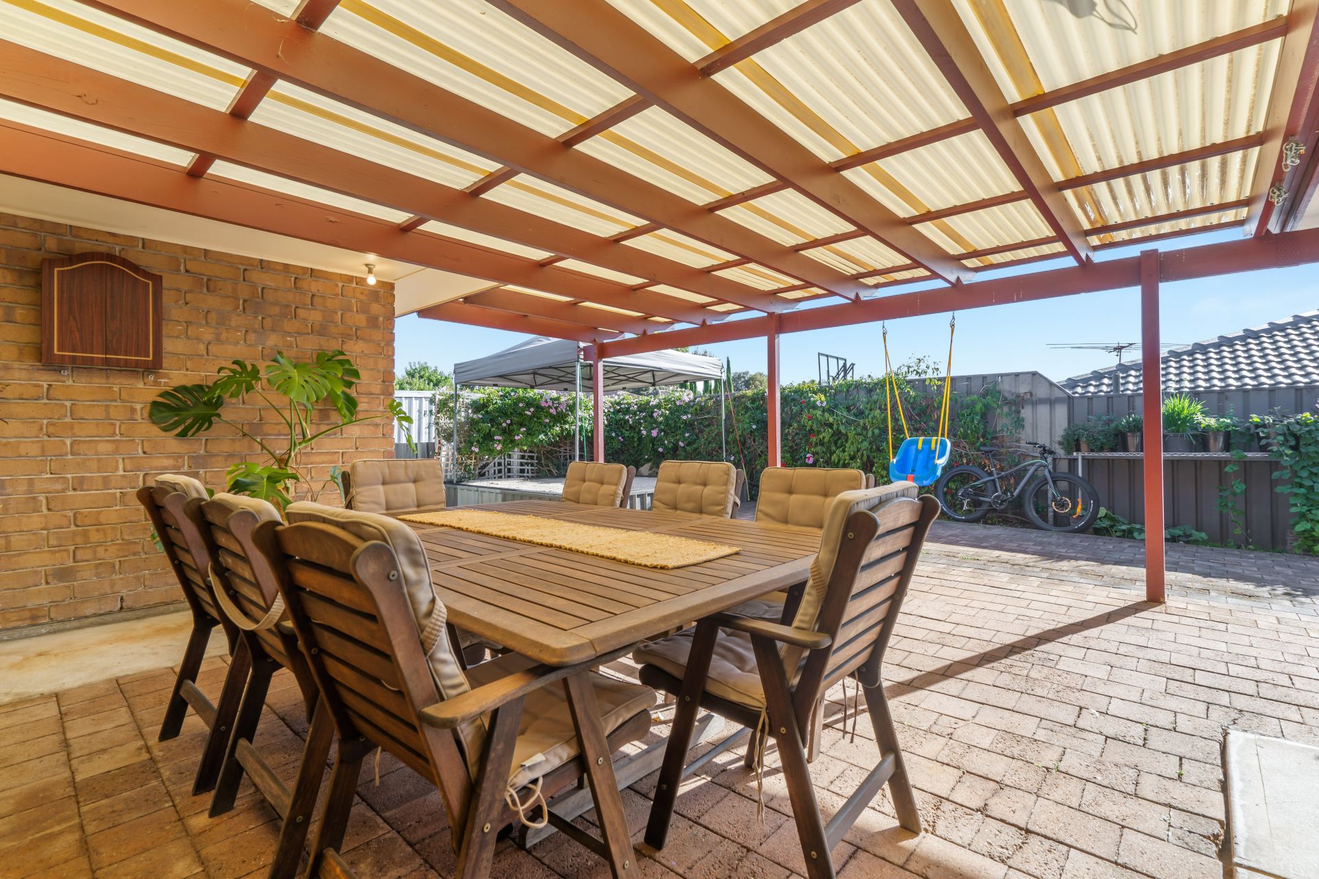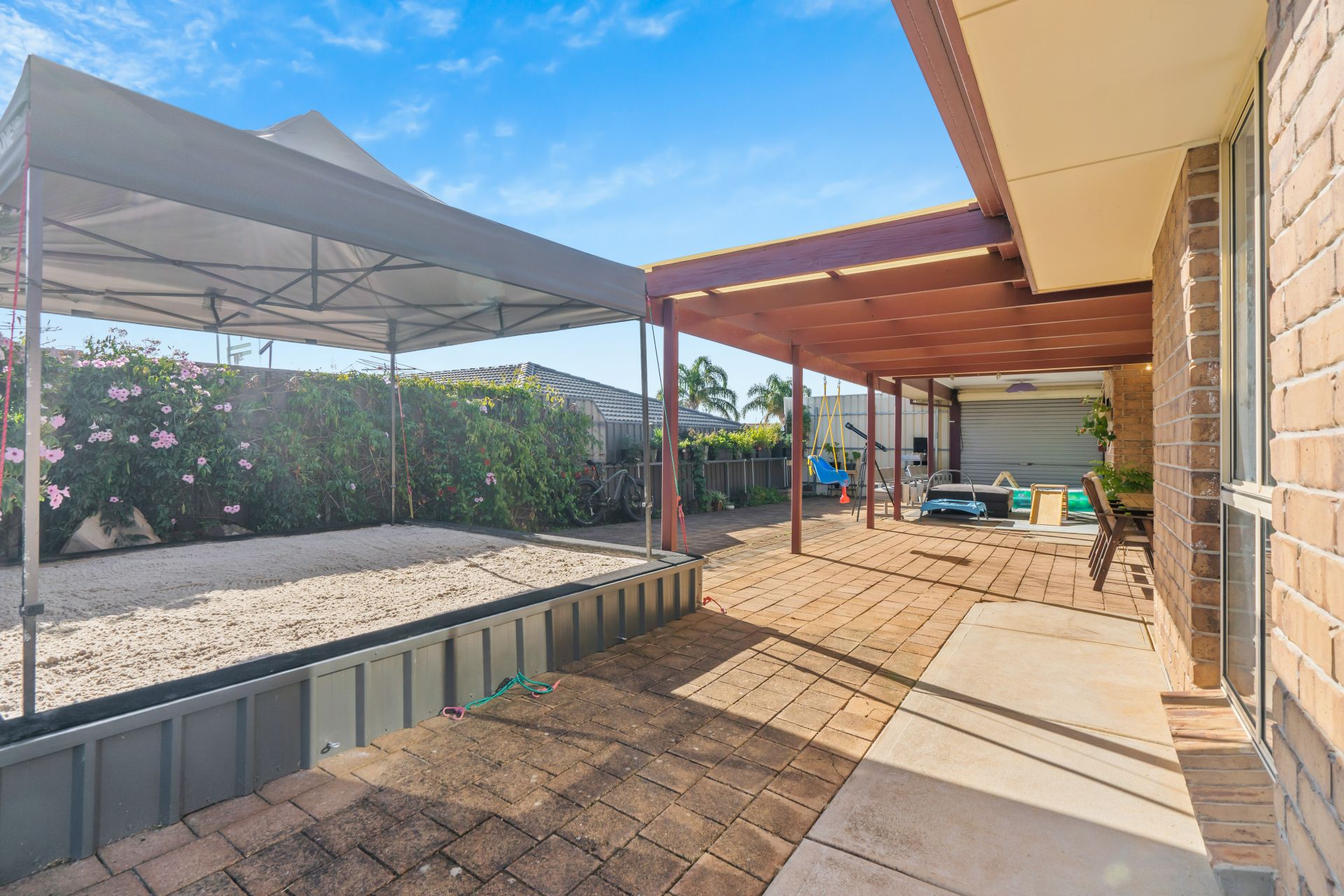 As you step outside you will find a spacious undercover entertaining area, perfect for relaxing year round with friends & family. This awesome space is fully paved and overlooks the beautiful garden as well as carpeted kids play area to the right and built in 10x10ft Sand pit to the left.