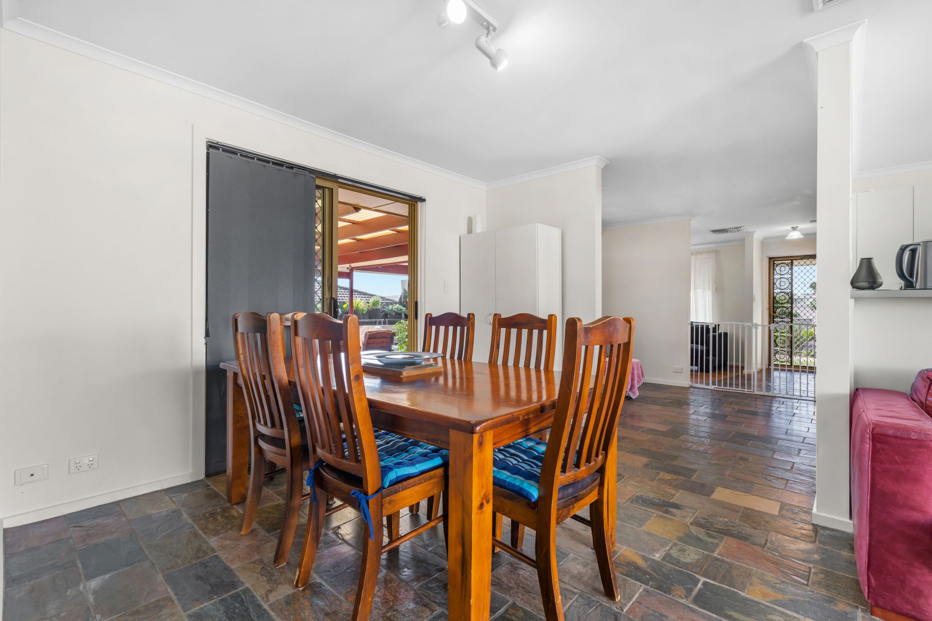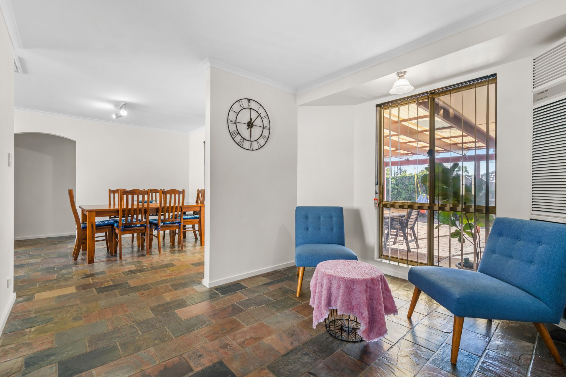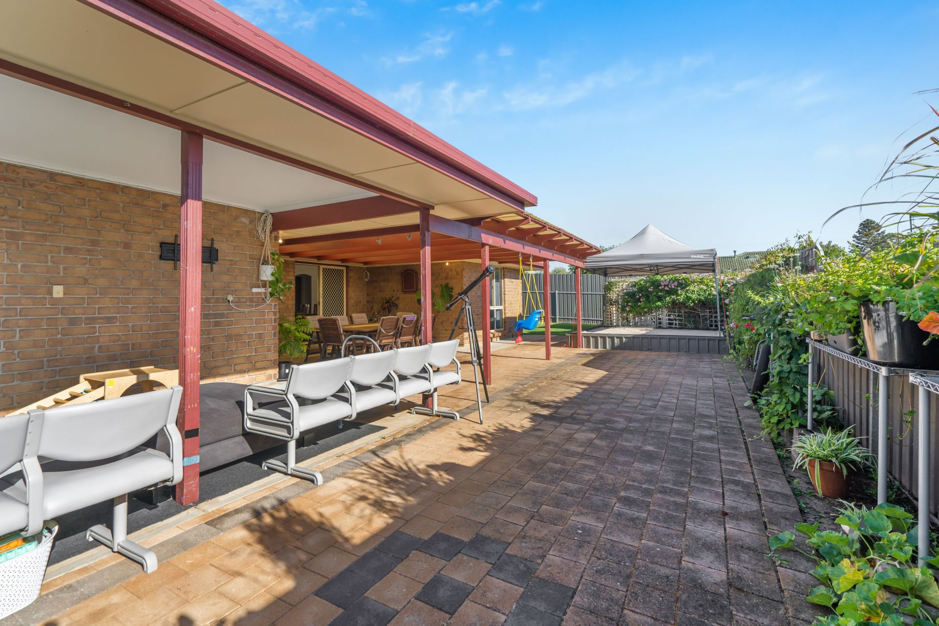 As you step outside you will find a spacious undercover entertaining area, perfect for relaxing year round with friends & family. This awesome space is fully paved and overlooks the beautiful garden as well as carpeted kids play area to the right and built in 10x10ft Sand pit to the left.