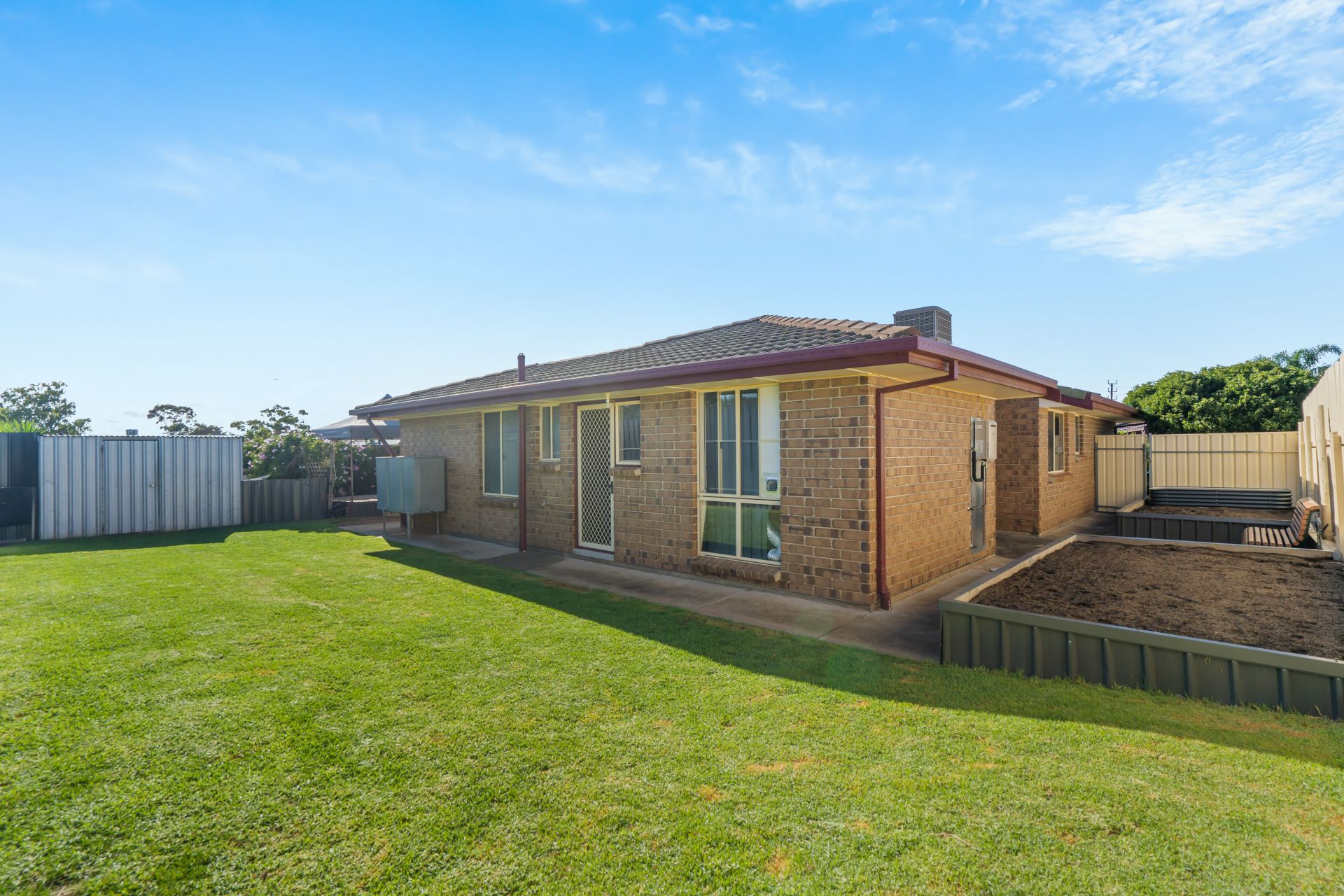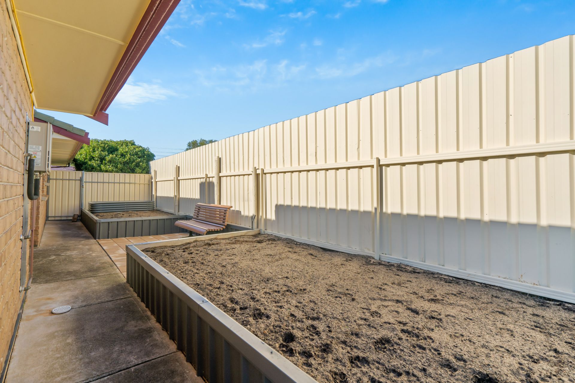 The side of the house has a quaint sitting area situated between 2 Large raised garden beds just begging to be filled with fruit trees, veggies and anything else you want to grow!