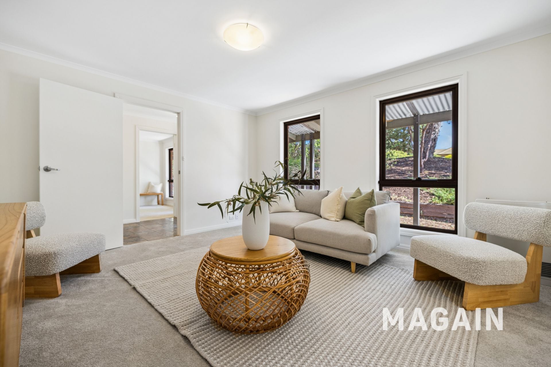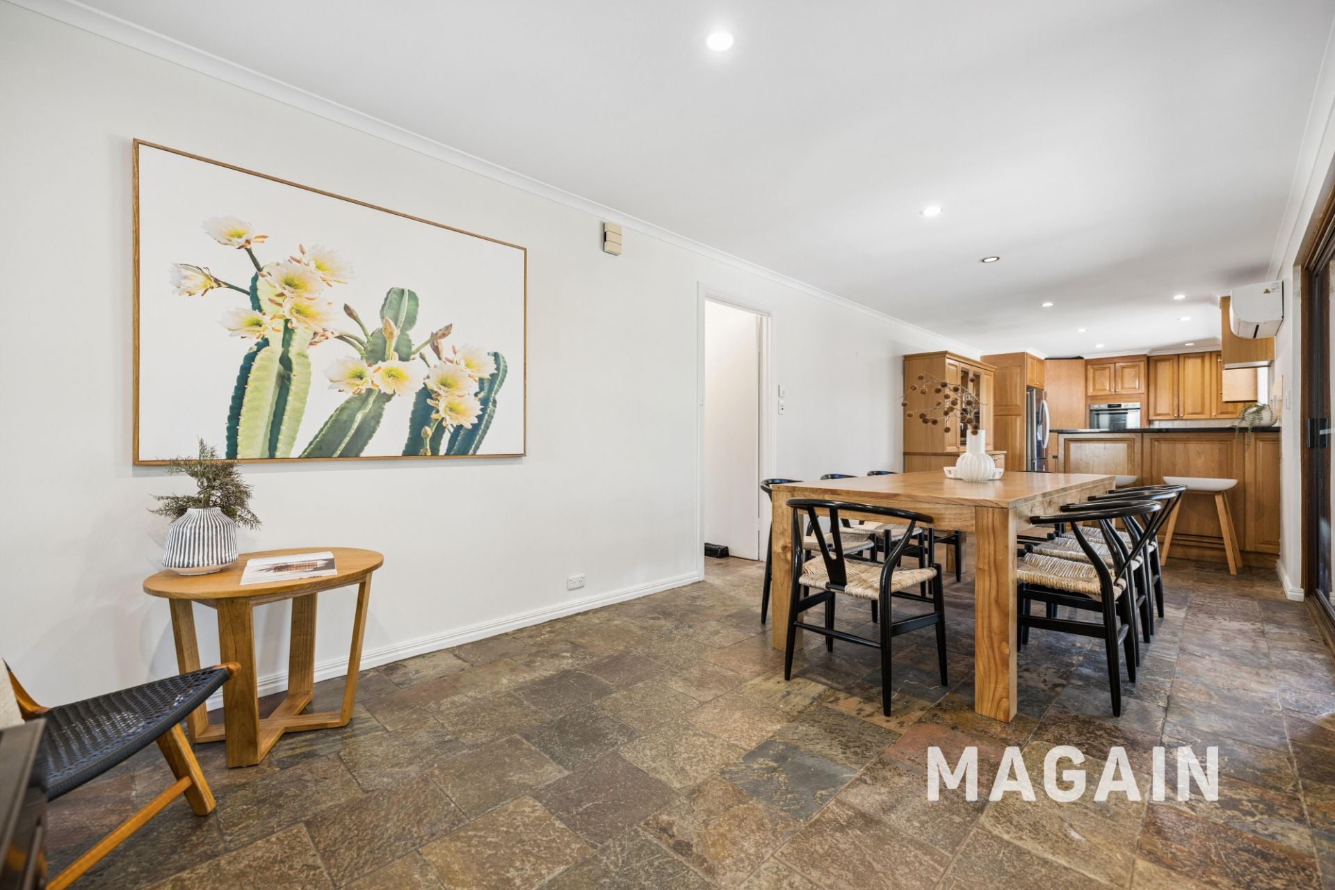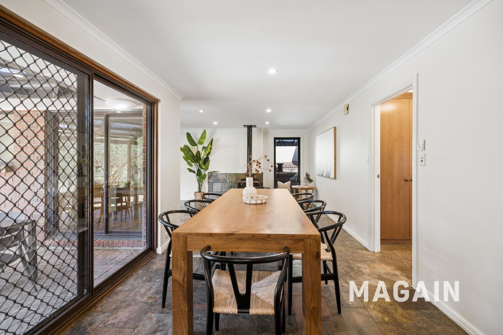 At the heart of the home lies a spacious open-plan living, kitchen, and dining area. Bathed in natural light from multiple picture windows and glass sliding doors that open to the outdoor spaces, this bright and airy zone creates a warm and welcoming atmosphere. Whether you're relaxing in the living area, gathering around the dining table, or preparing meals in the kitchen, the well-considered layout ensures effortless flow and comfortable everyday living. A split system air conditioner and a stylish combustion heater provide year-round climate control, enhancing the appeal of this central living space.