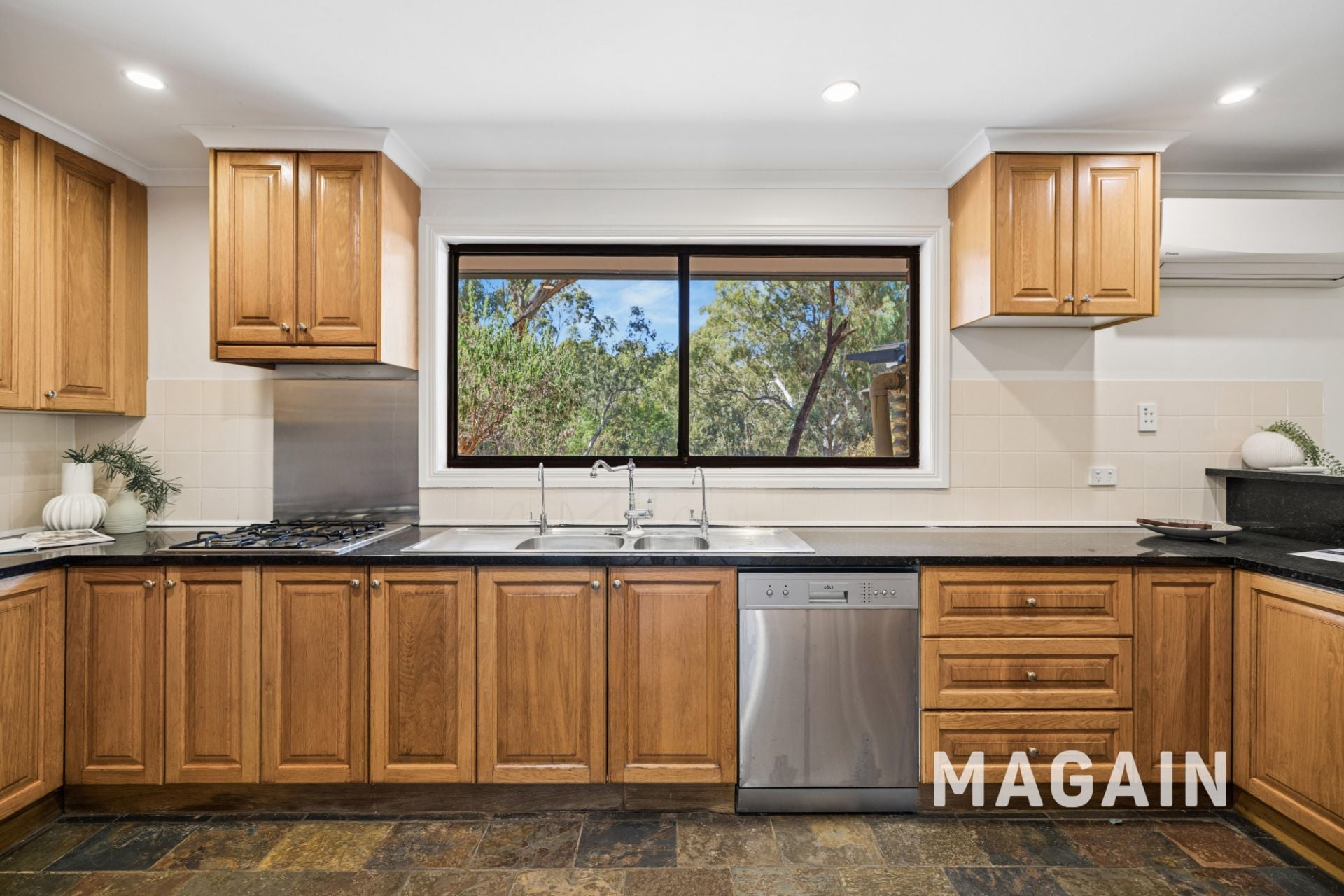 The kitchen is both practical and well-appointed, featuring ample timber cabinetry paired with sleek dark benchtops. Quality stainless steel appliances, including a four-burner gas cooktop with rangehood, oven, grill, and dishwasher, make everyday cooking and cleanup a breeze. Additional features include a spacious pantry, dedicated fridge alcove, double sink with PuraTap, and a convenient breakfast bar/servery, ideal for casual dining and effortless entertaining.