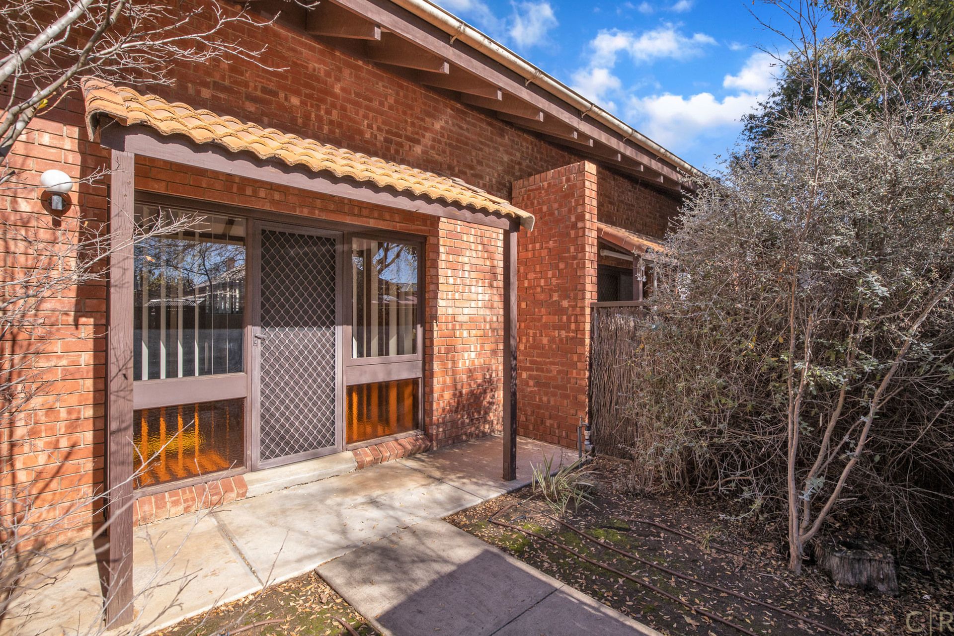 * The front garden is private with easy-care plants and sprinkler system.
