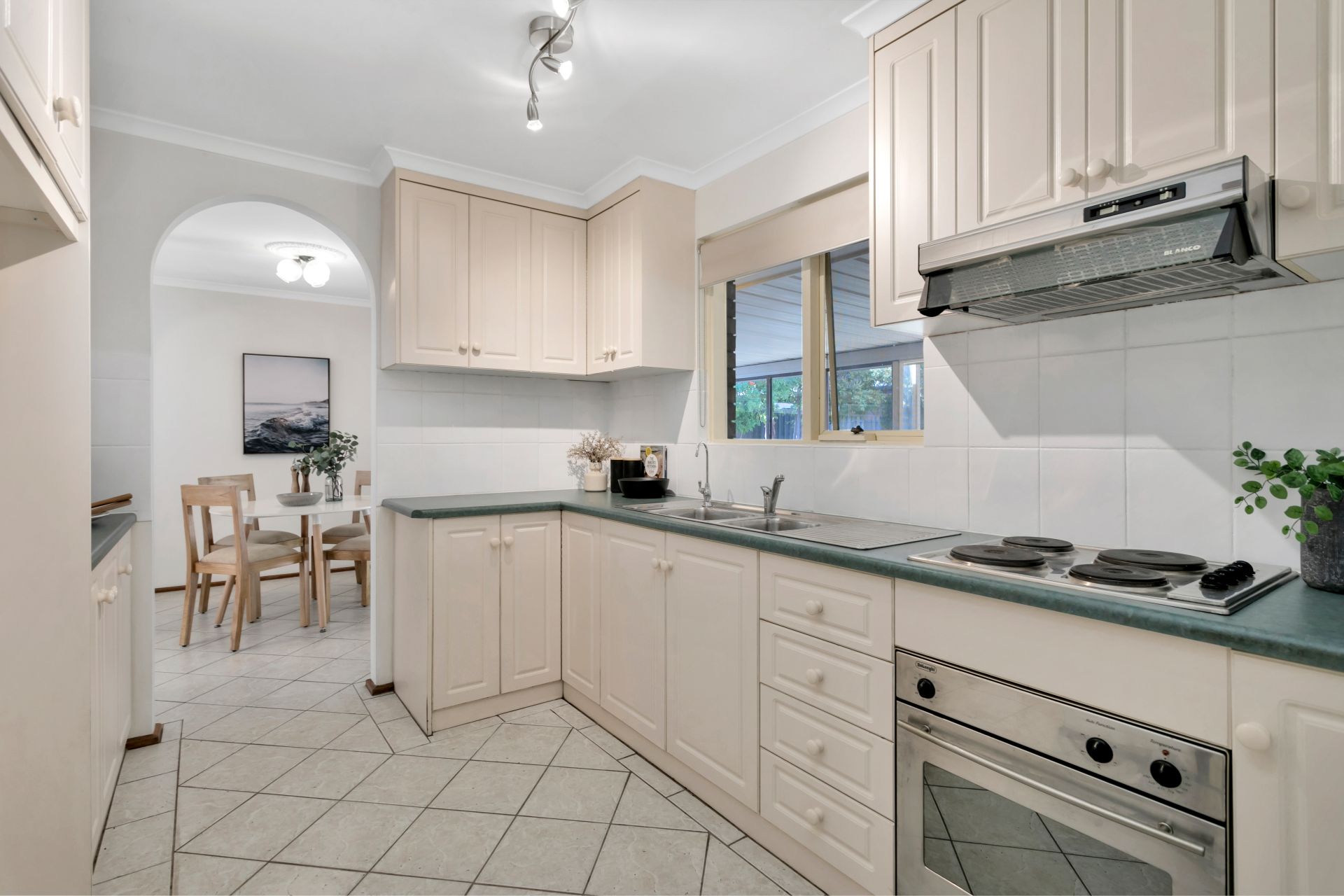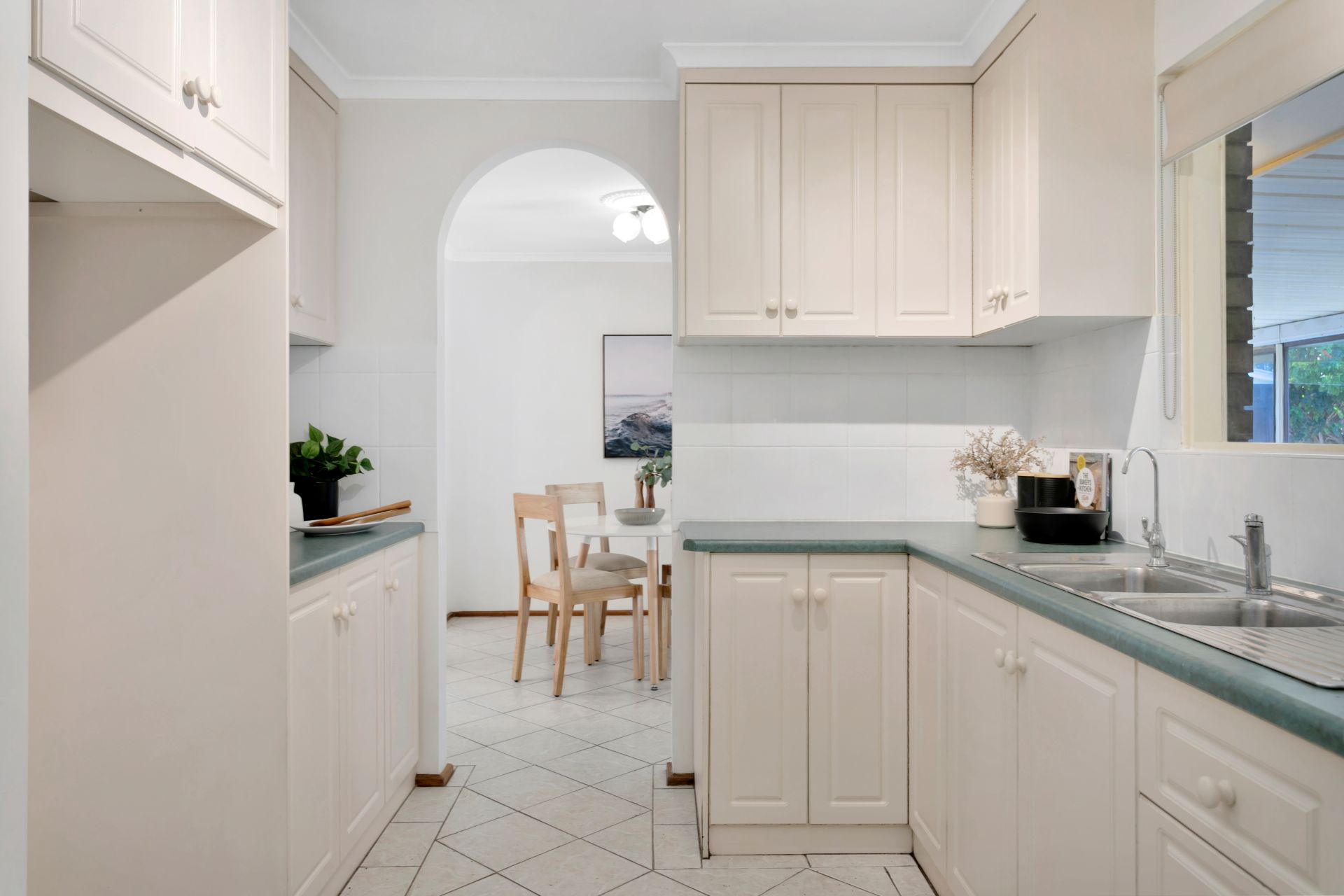 > through two open archways you're presented with the dining room which flows through to the neat galley kitchen with loads of cupboard and bench space