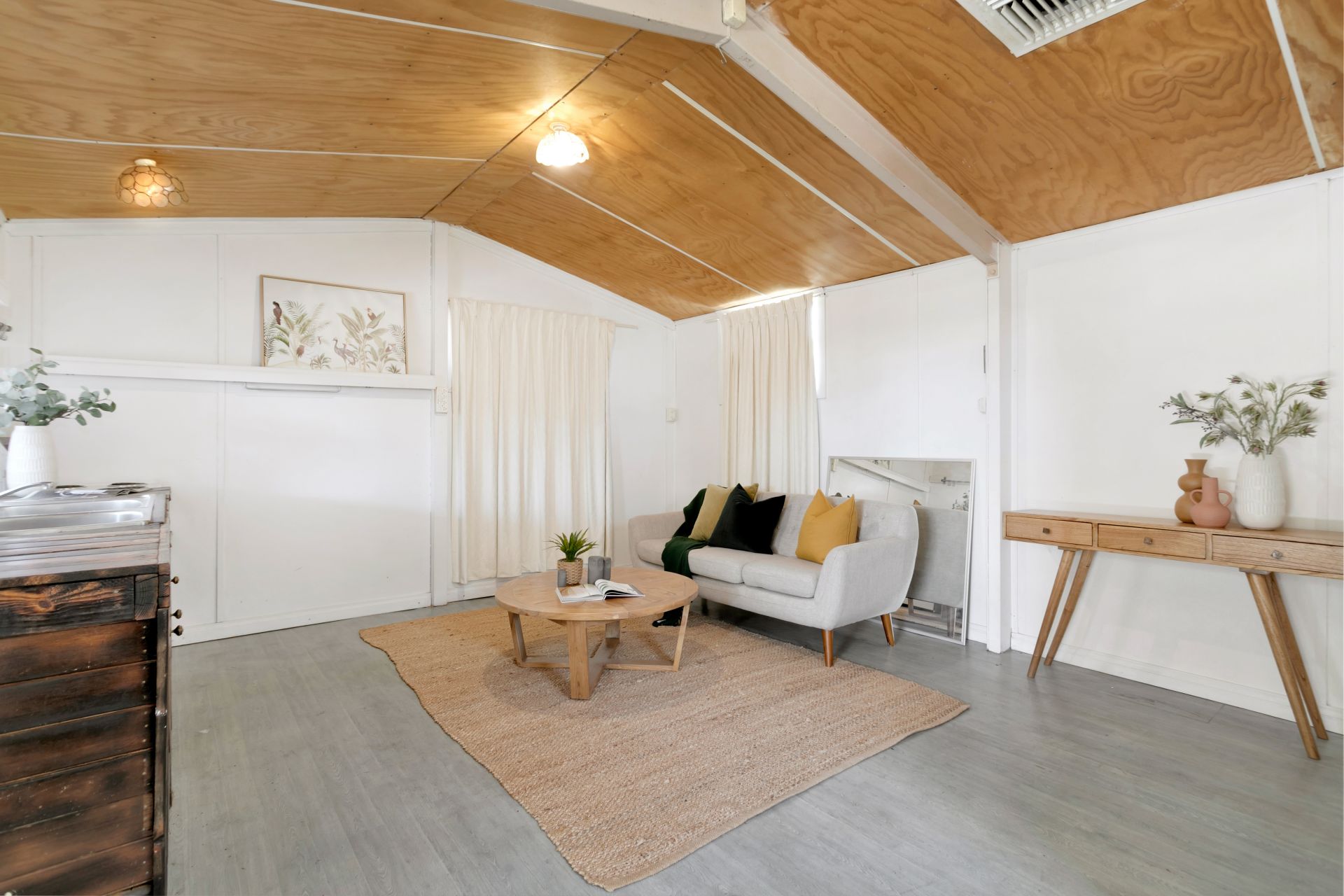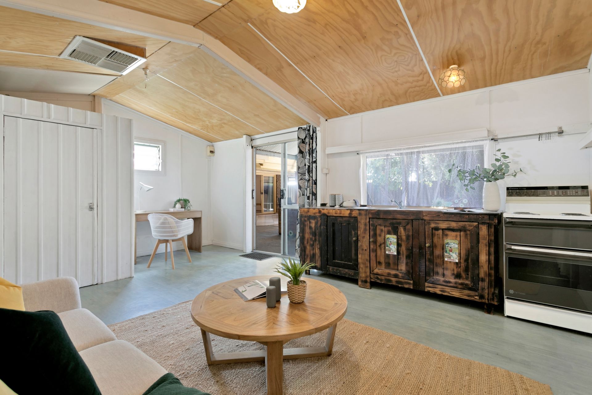 > the backyard is also home to a sizeable lined shed (includes its own kitchen and bathroom), the perfect room to turn into whatever your heart desires, along with a nice amount of lawn and garden bed area