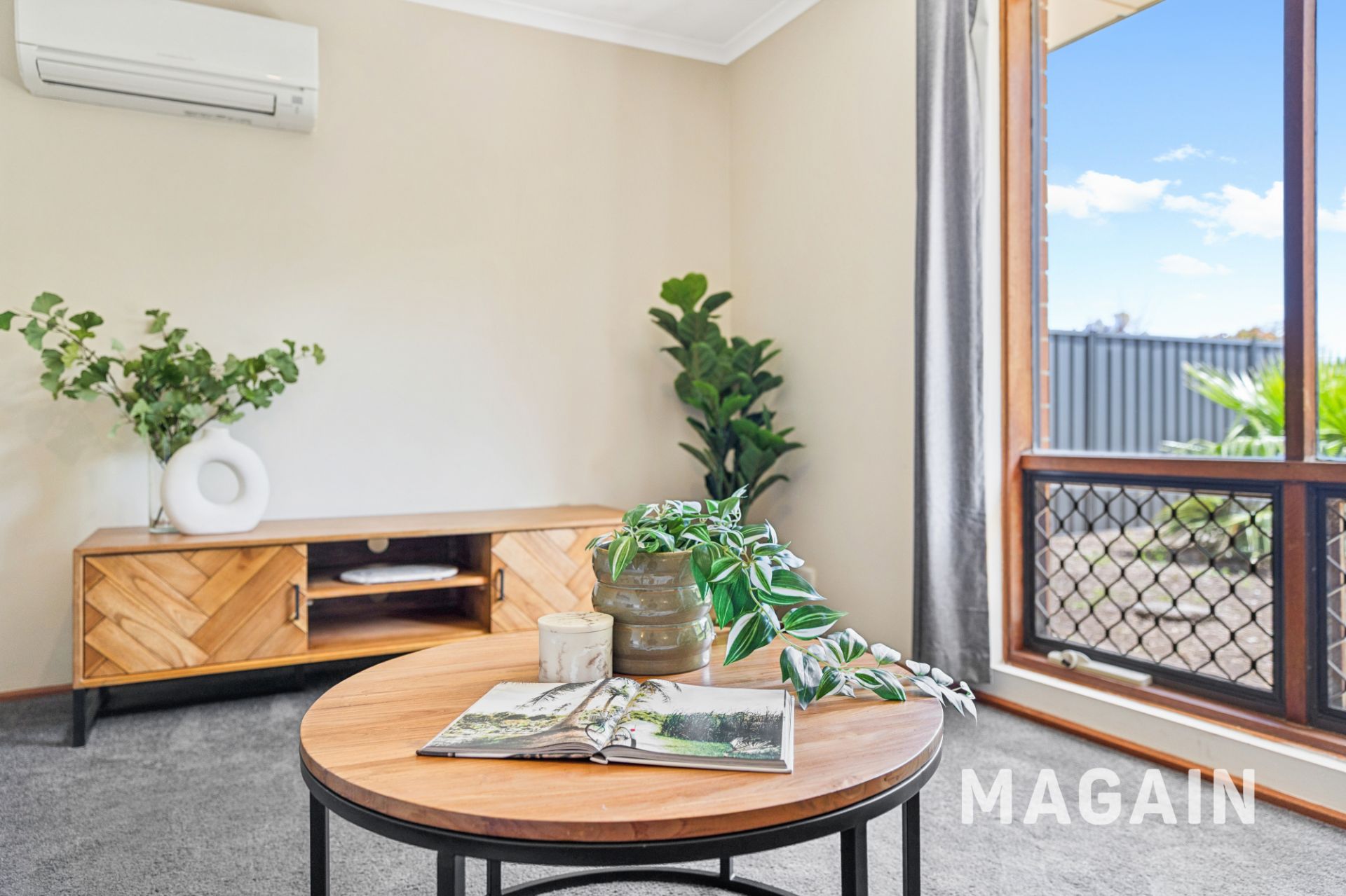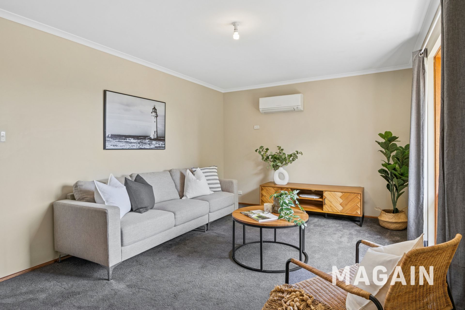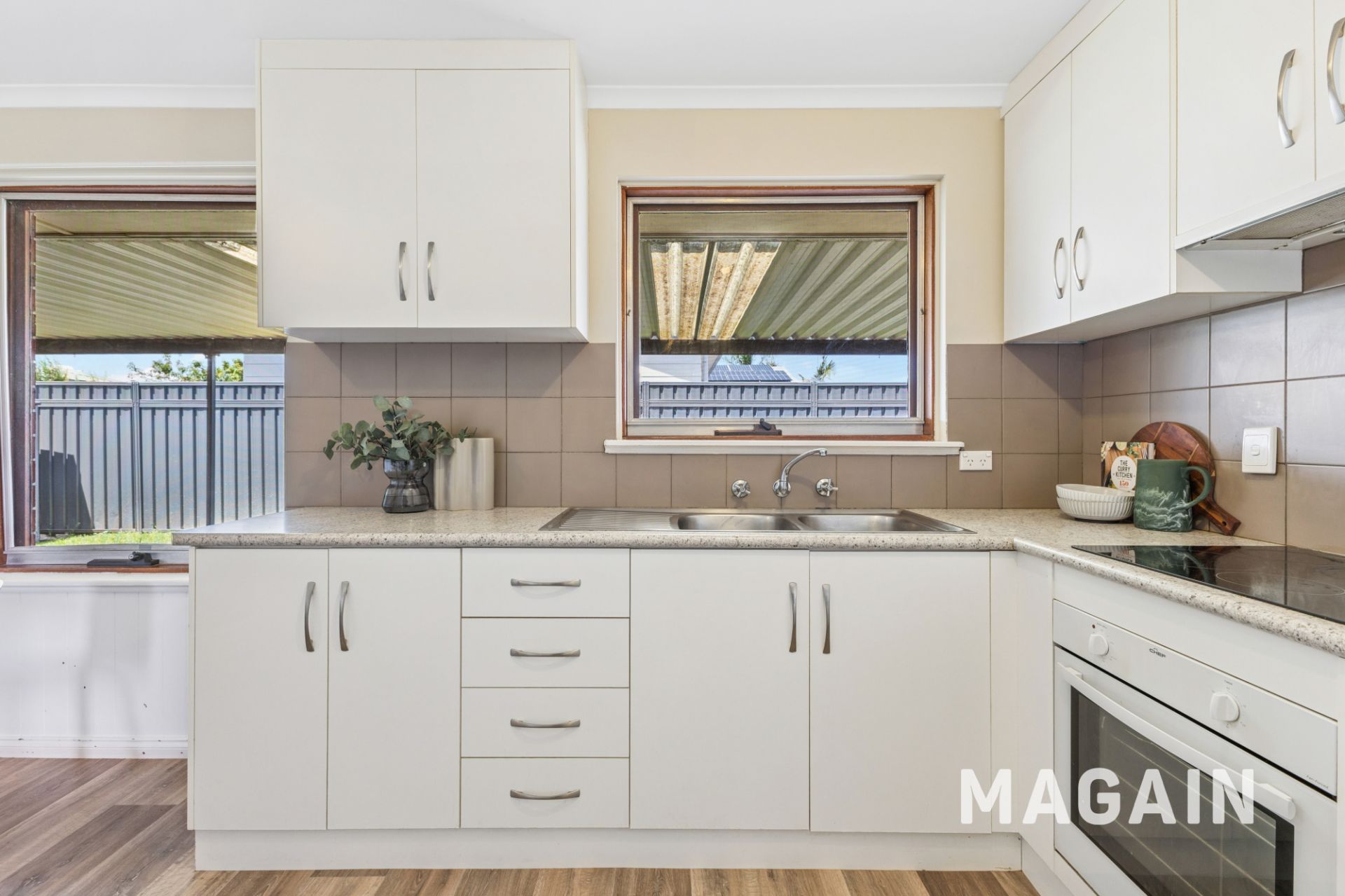 Stepping inside, you're welcomed by a cosy carpeted front living room complete with a split-system air conditioner, ensuring year-round comfort. This space flows through to the adjoining dining area and the well-appointed kitchen, where there is plenty of bench and cupboard space, an oven and cooktop, making everyday cooking effortless.