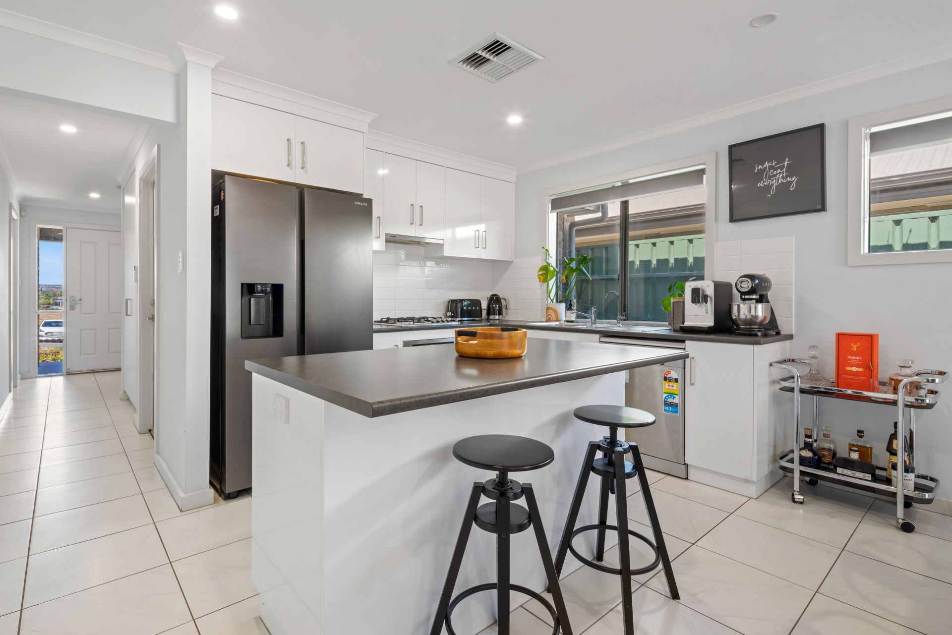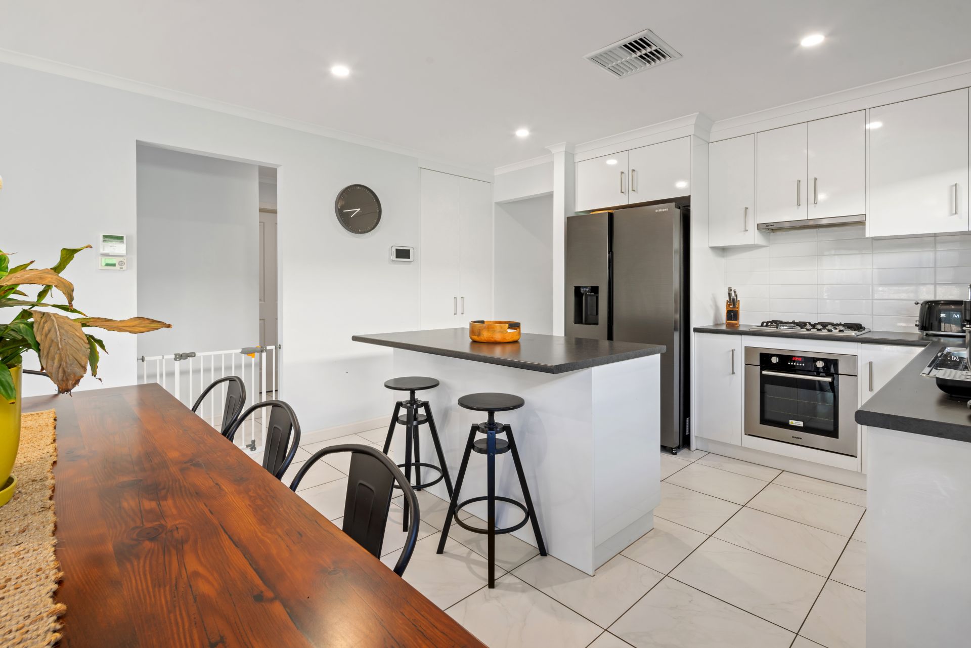 The impressive gourmet kitchen has been beautifully appointed with timeless white cabinetry, modern stainless steel appliances including a gas cooktop and dishwasher plus a perfectly positioned island bench providing a fantastic central spot to entertain while also allowing for maximum storage and preparation space.