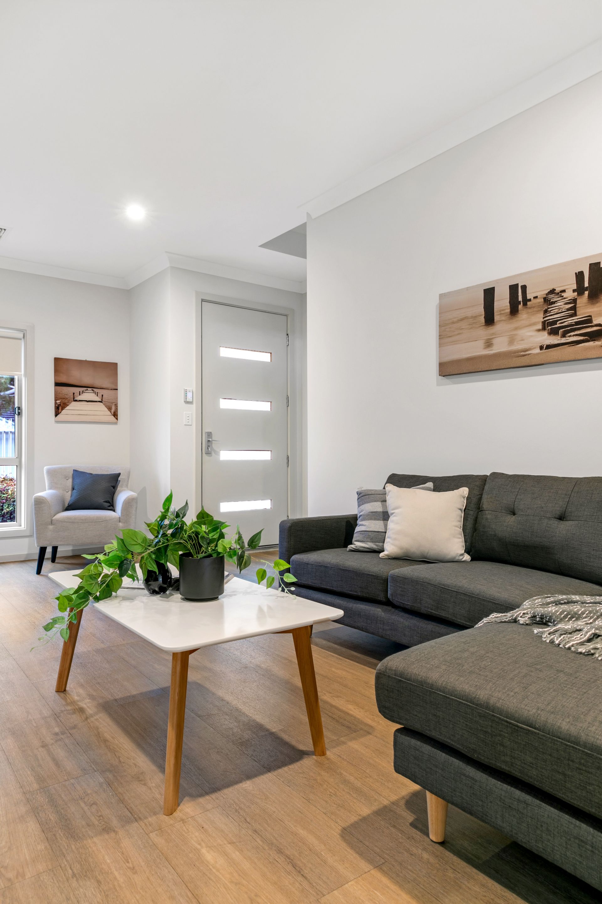 The downstairs section with feature timber look flooring comprises a large formal lounge, fabulous kitchen with Smeg dishwasher & stainless steel appliances. This is adjoined by the large family and dining area - all North facing out to a private courtyard area with pergola. A 2nd WC and laundry with built ins, is also on this level.