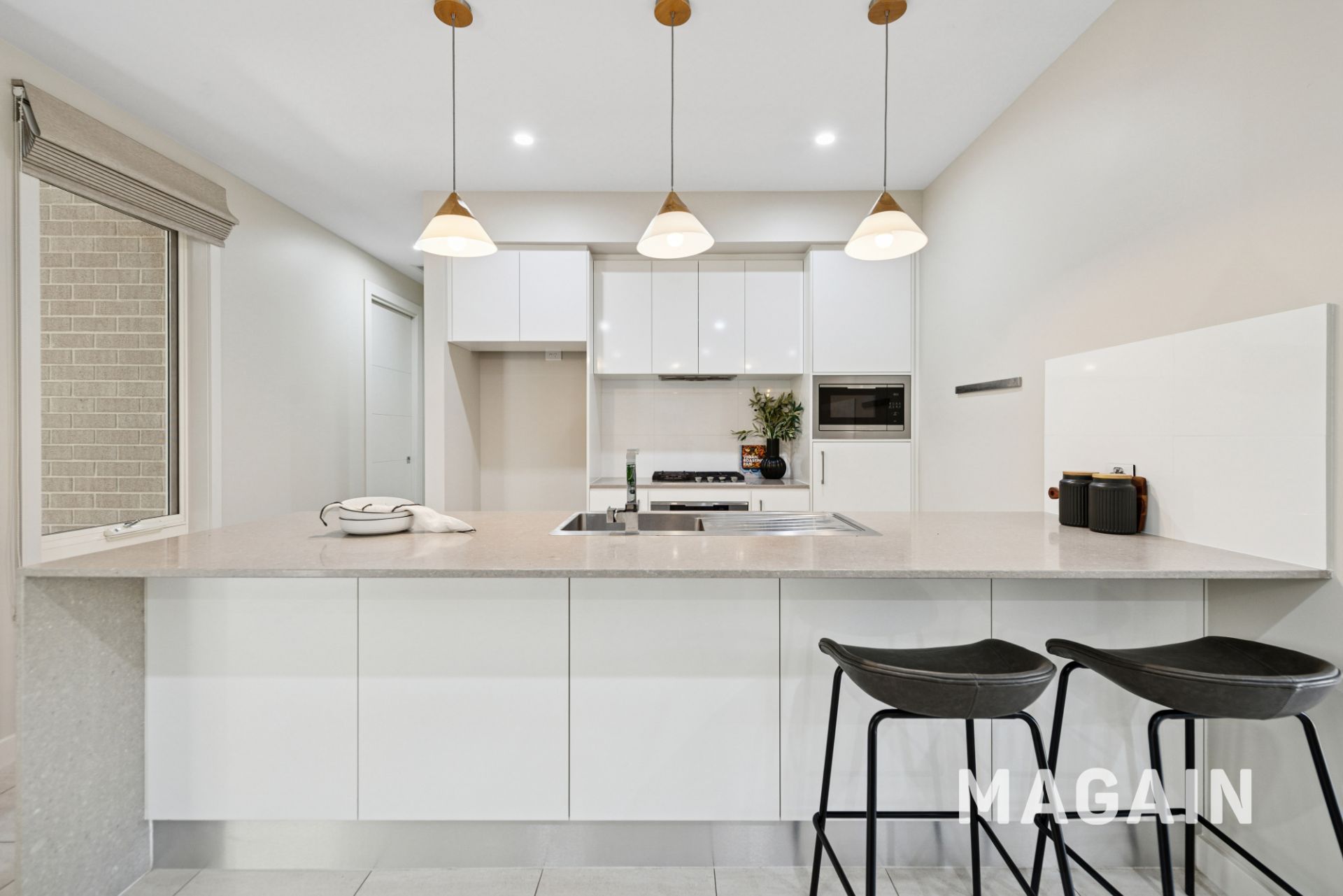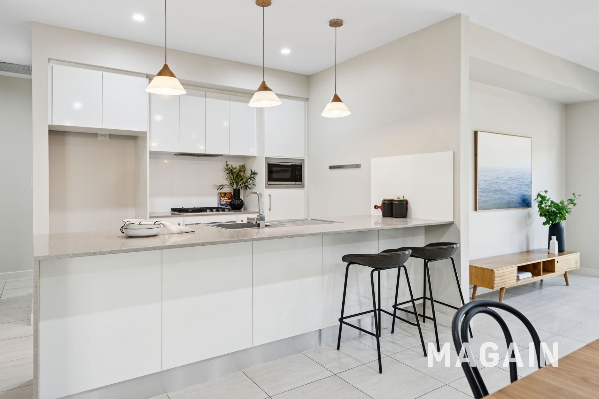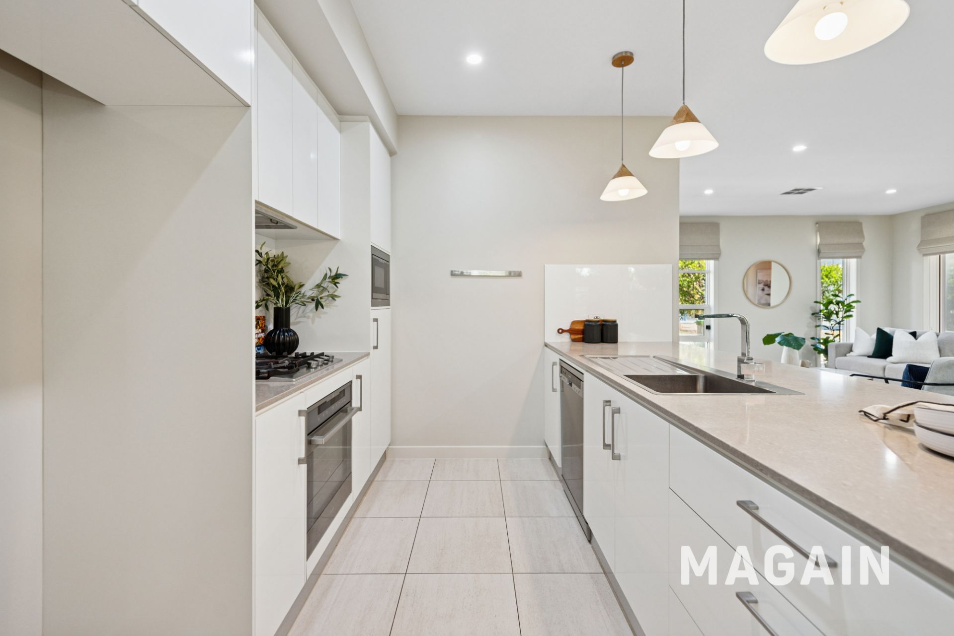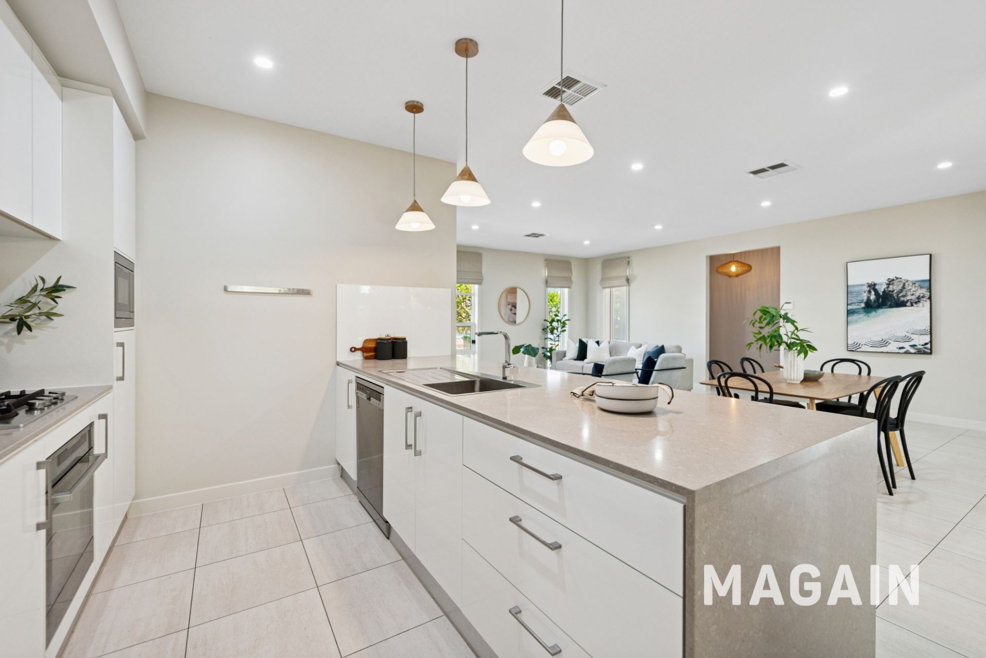 The home greets you with a wide entry leading into the light-filled open plan design. The living space is complimented by large windows and neutral tones which leads seamlessly through to the dining and kitchen space. The heart of the home is the gourmet kitchen with dishwasher, gas cooking and plenty of cupboard and bench space.