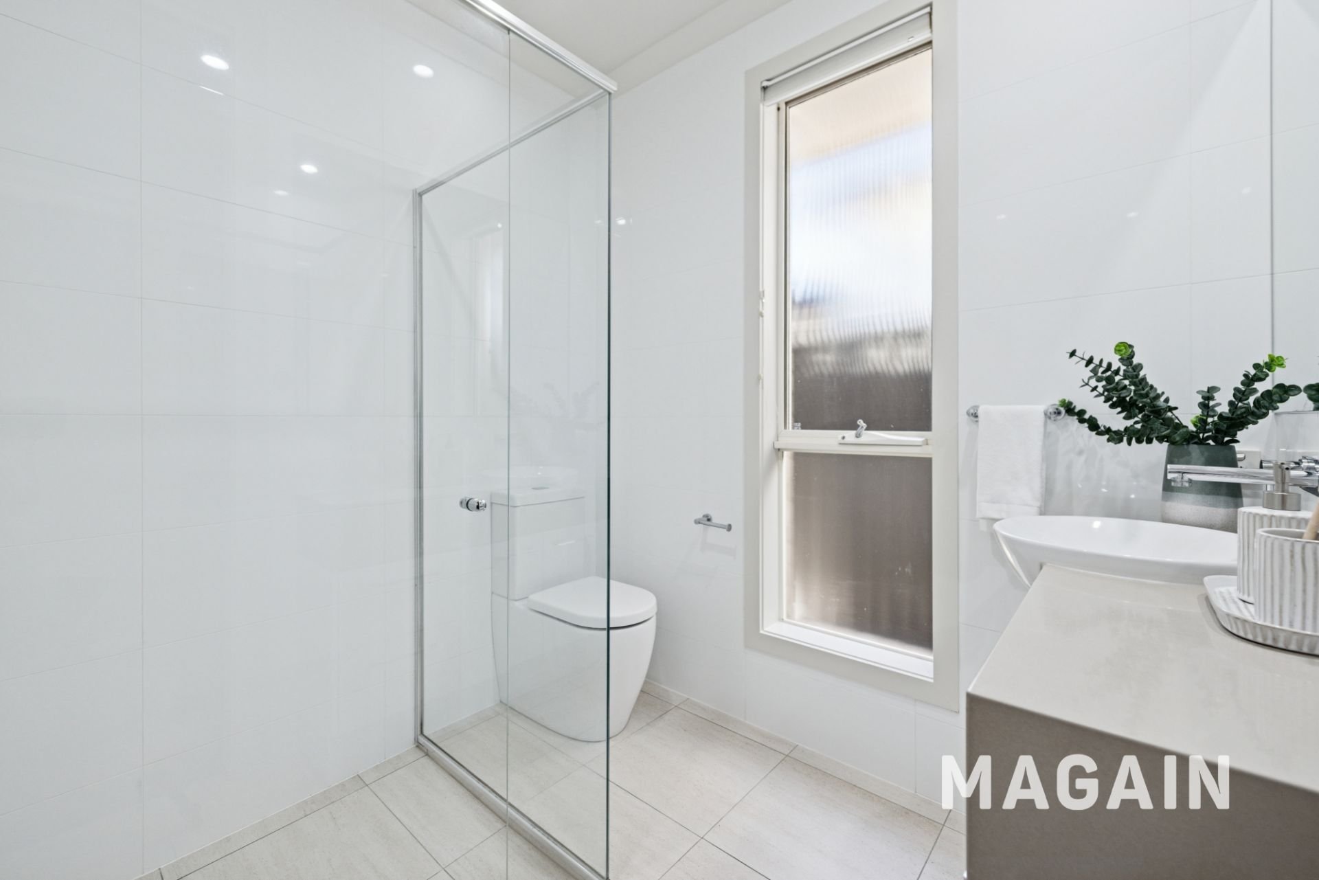 - Spacious bathroom tiled floor to ceiling