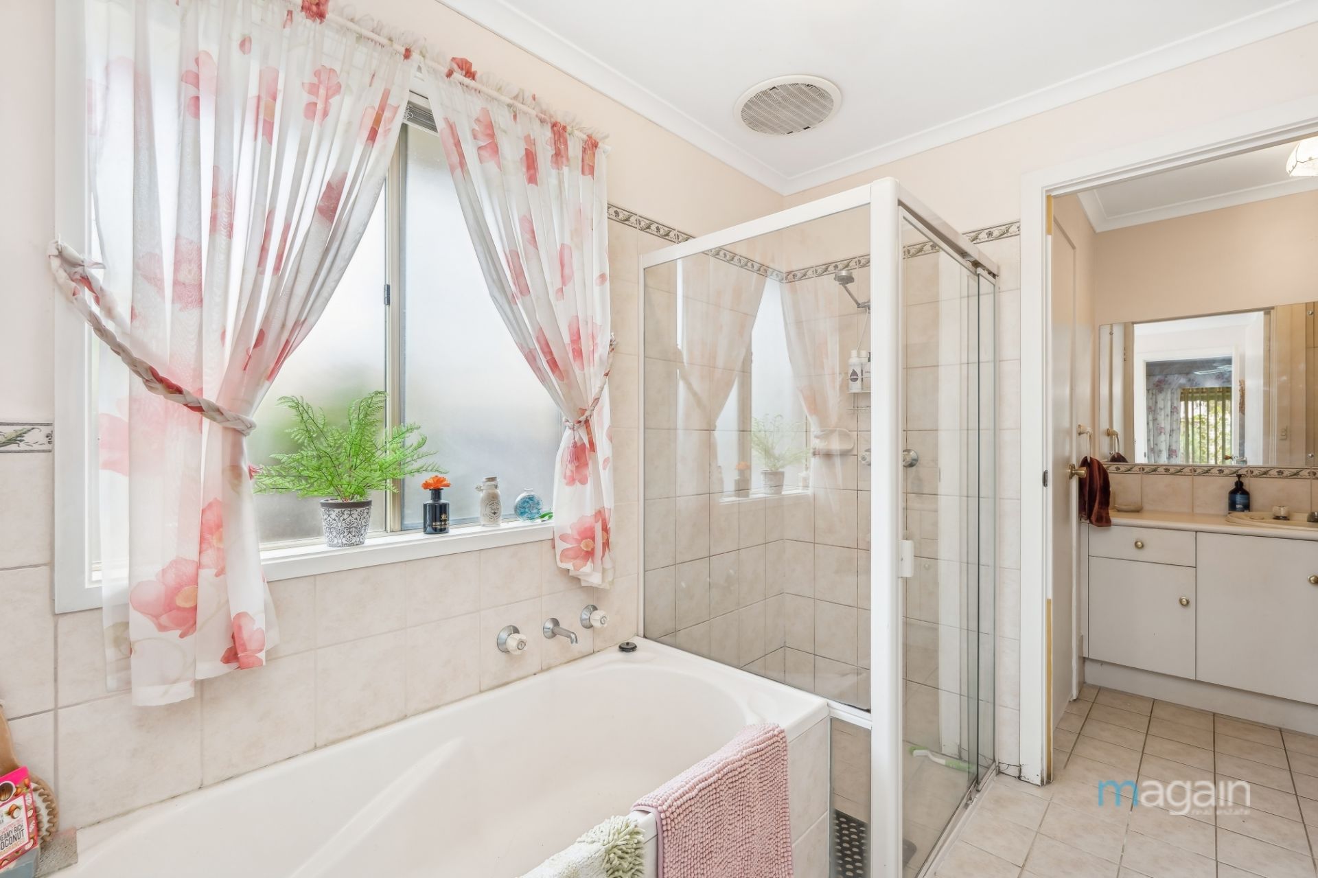 This house features three comfortable bedrooms, all equipped with ceiling fans. The master bedroom is a serene retreat with ample space for a queen bed, with a built-in robe, with access to the adjoining main bathroom with bath, shower vanity and toilet .