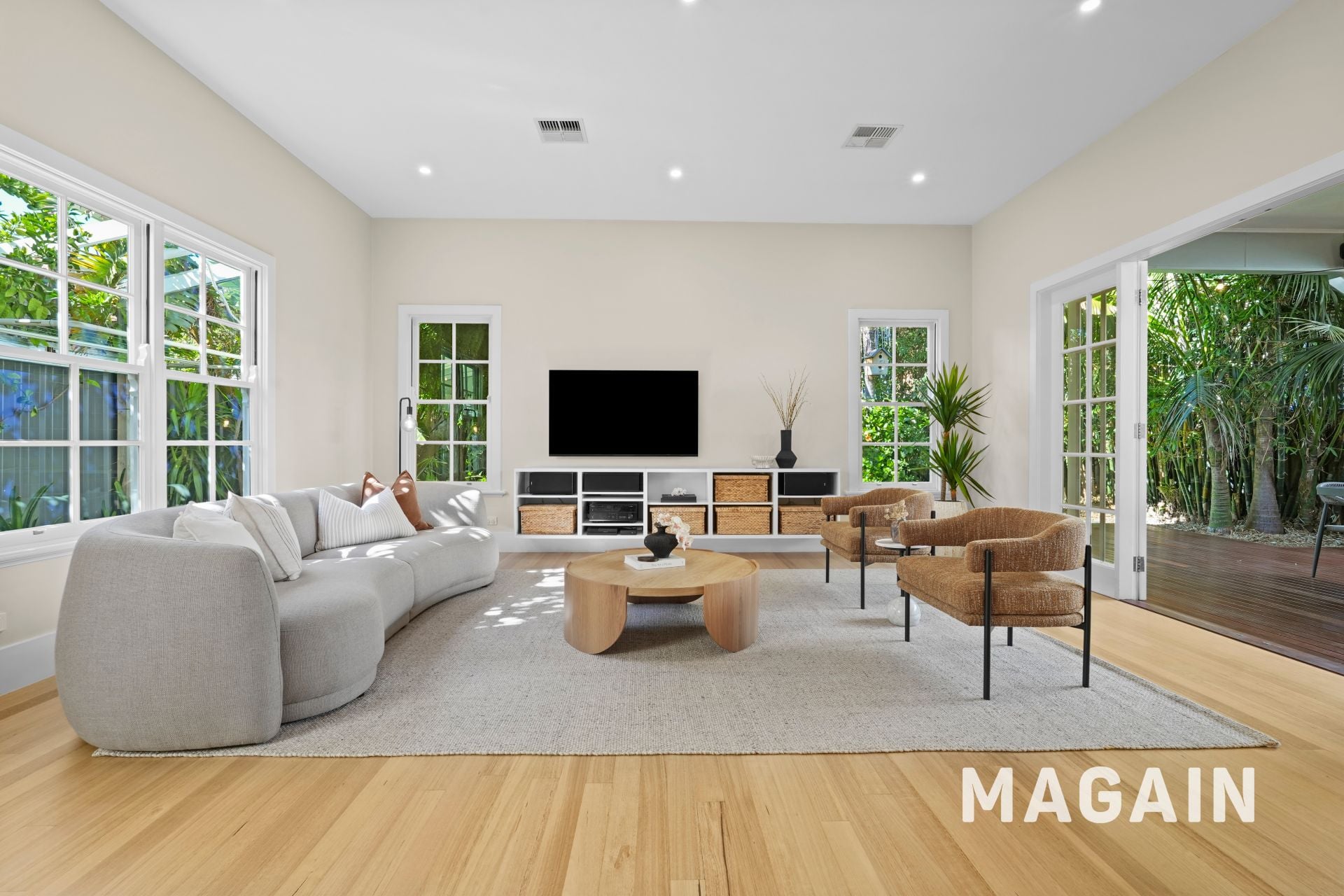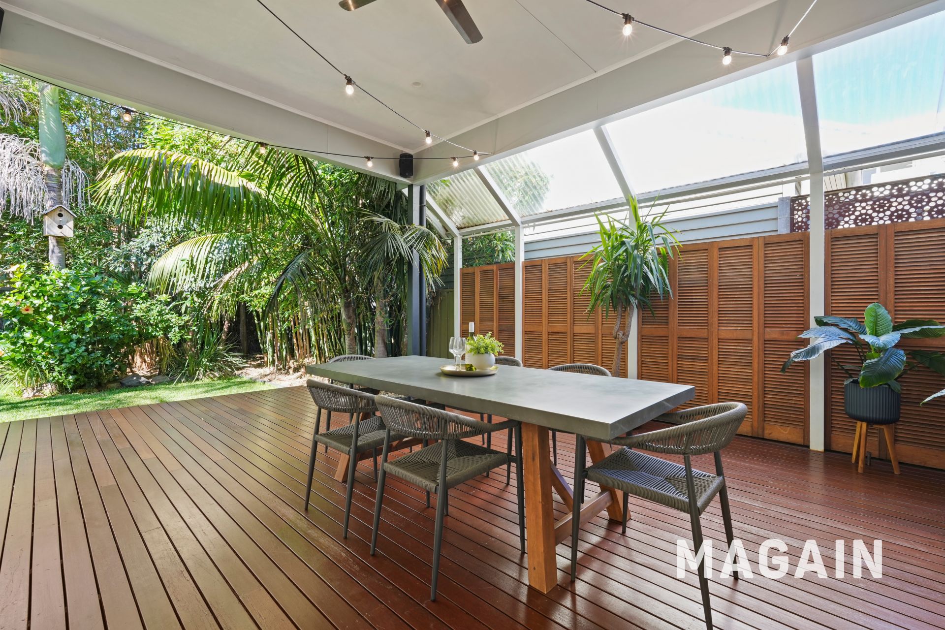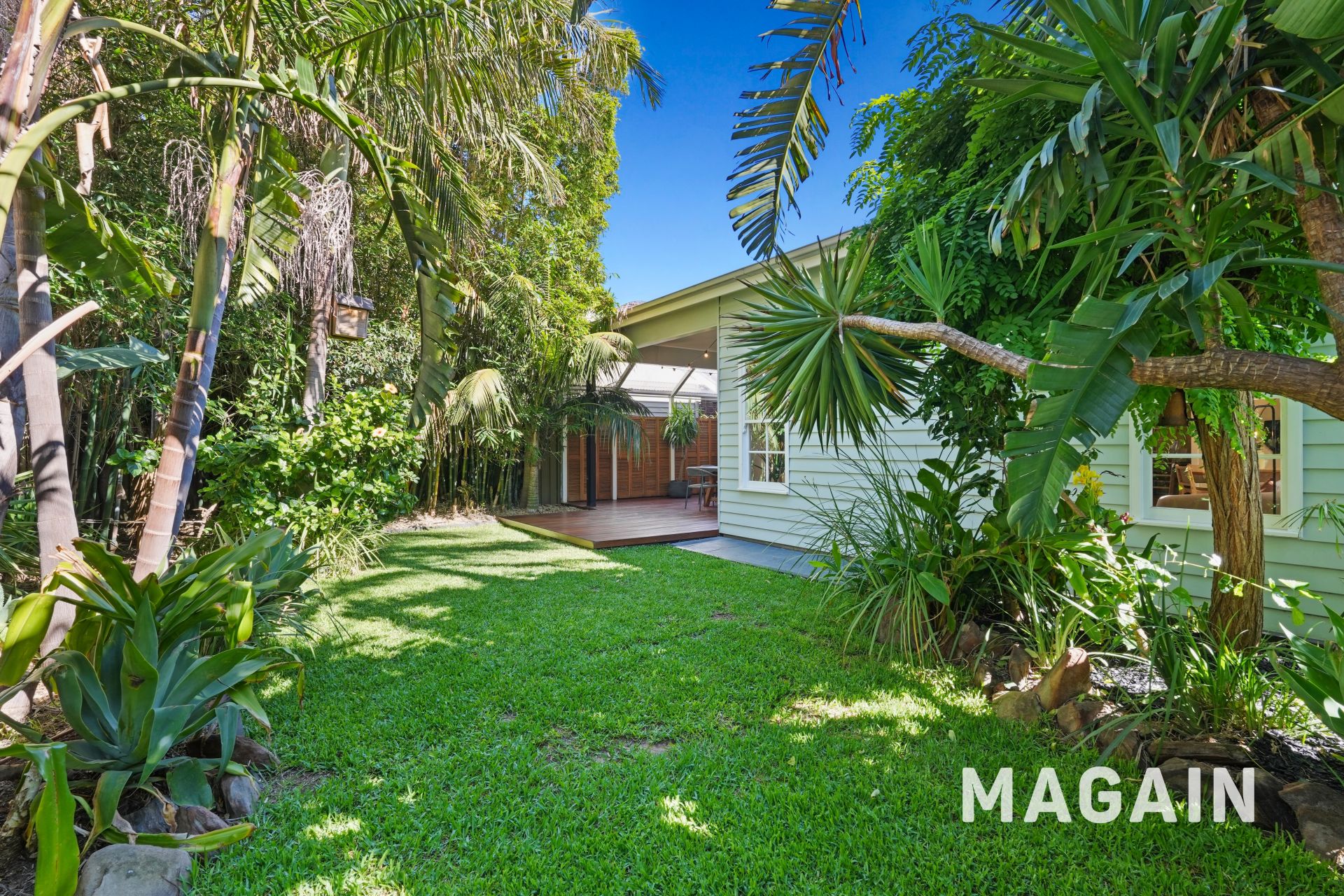 To the rear, the home opens into a superb indoor–outdoor entertaining zone, featuring a covered timber deck, surrounded by lush established gardens and palms that create a wonderfully private sanctuary.