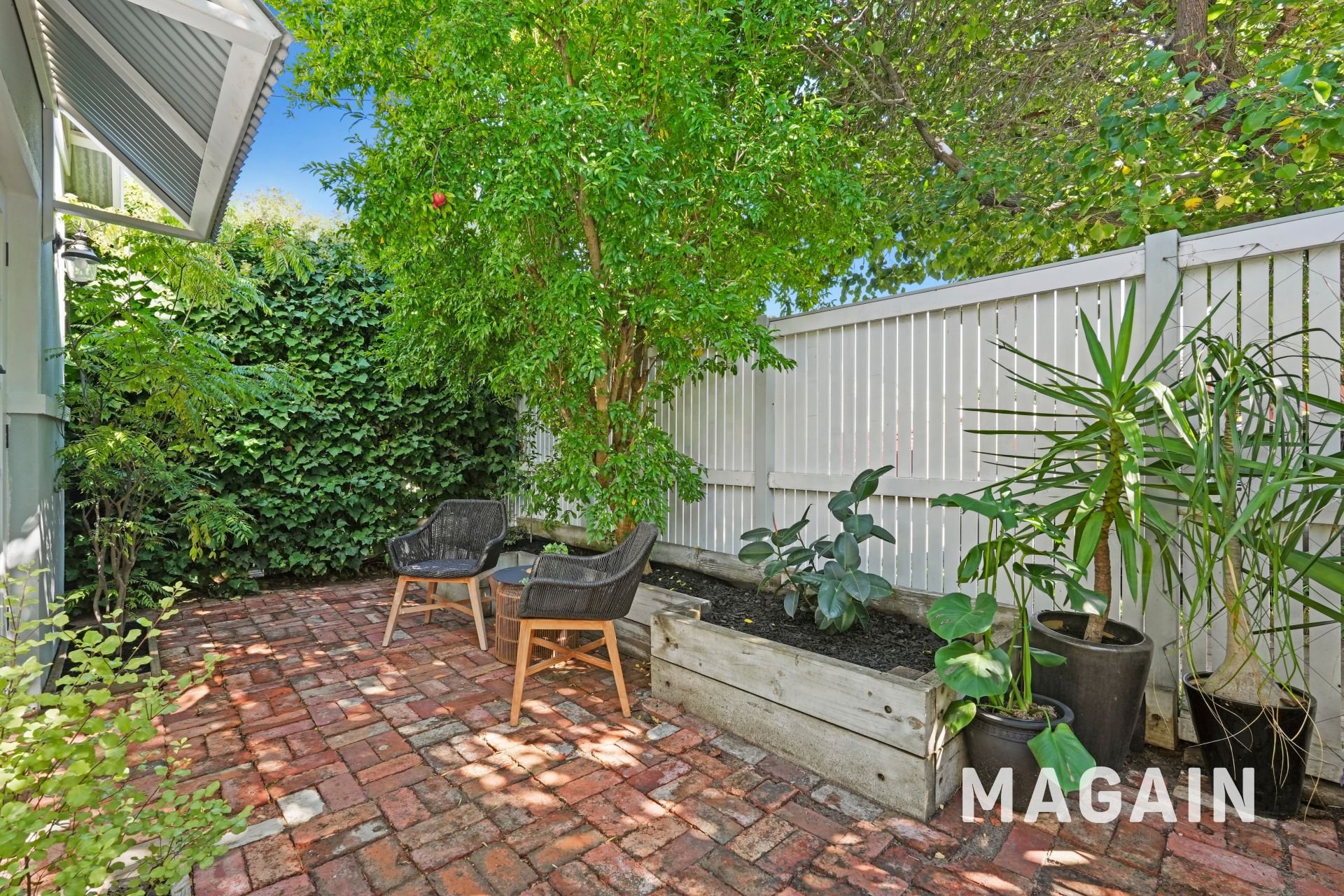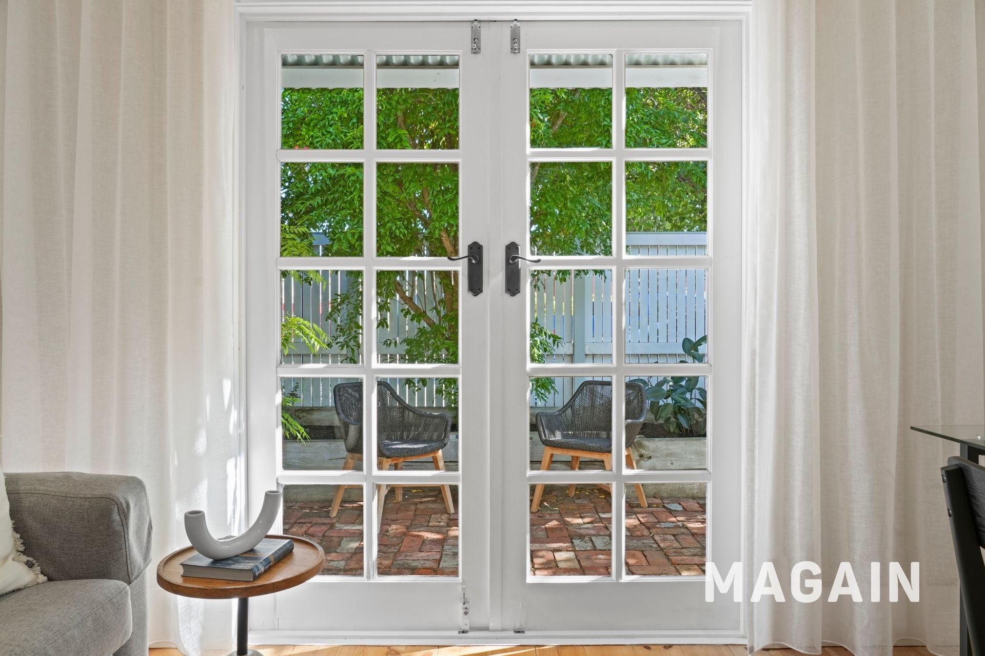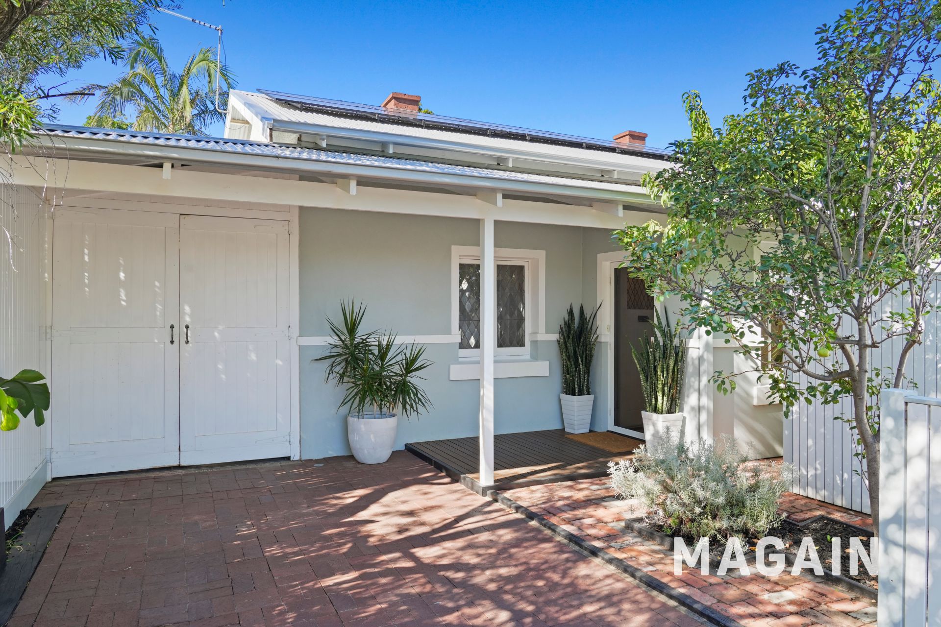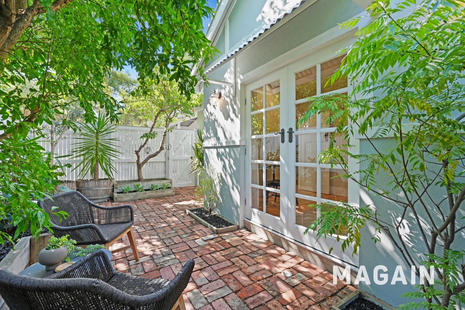 At the front of the home, French doors open to a charming red-brick courtyard, enclosed by white slatted fencing and perfectly positioned to capture warm northern sunshine. Morning coffee here quickly becomes a daily ritual, while evenings invite a quiet glass of wine in the sea breeze.