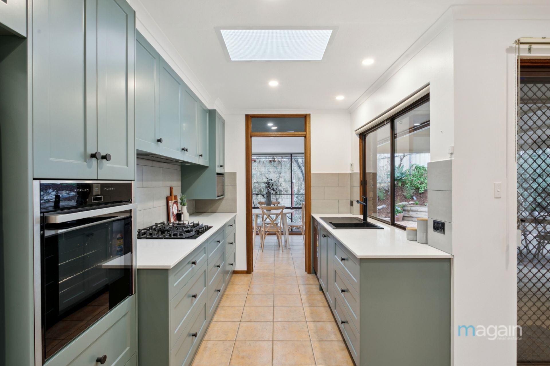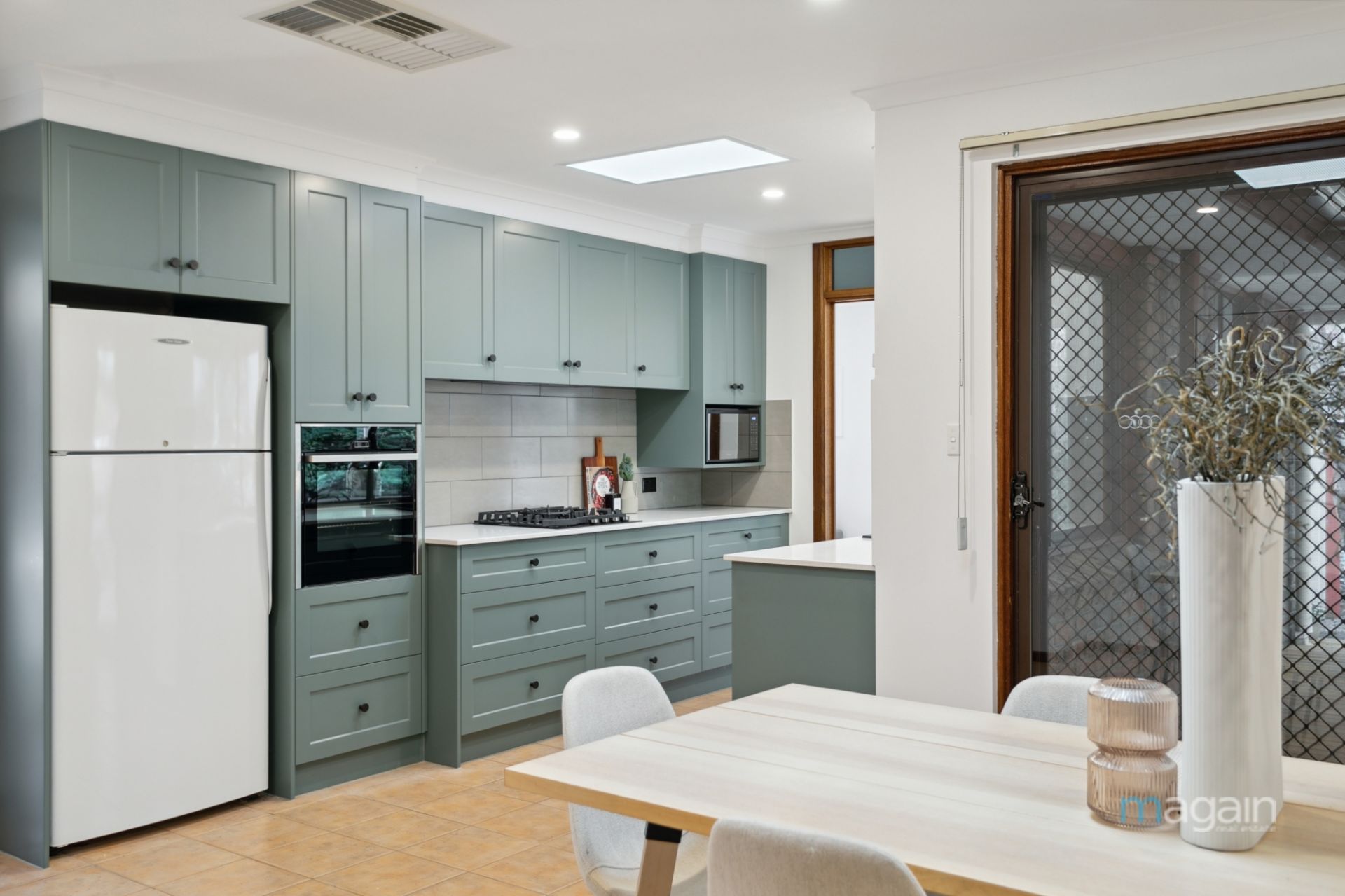 The lounge seamlessly flows into the casual meals area and then to the show-stopping kitchen. This culinary haven boasts elegant shaker cabinetry, ample overhead and under-bench storage, and top-quality appliances including a gas cooktop and a stylish black sink with matching tapware. Two skylights ensure this space is always light and bright. Adjacent to the kitchen is a spacious dining area, perfect for entertaining guests or enjoying intimate family dinners, complete with a space heater for added warmth.