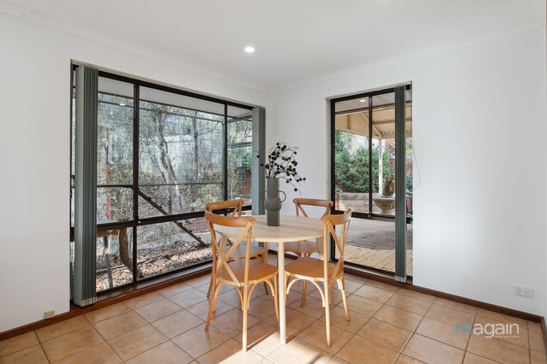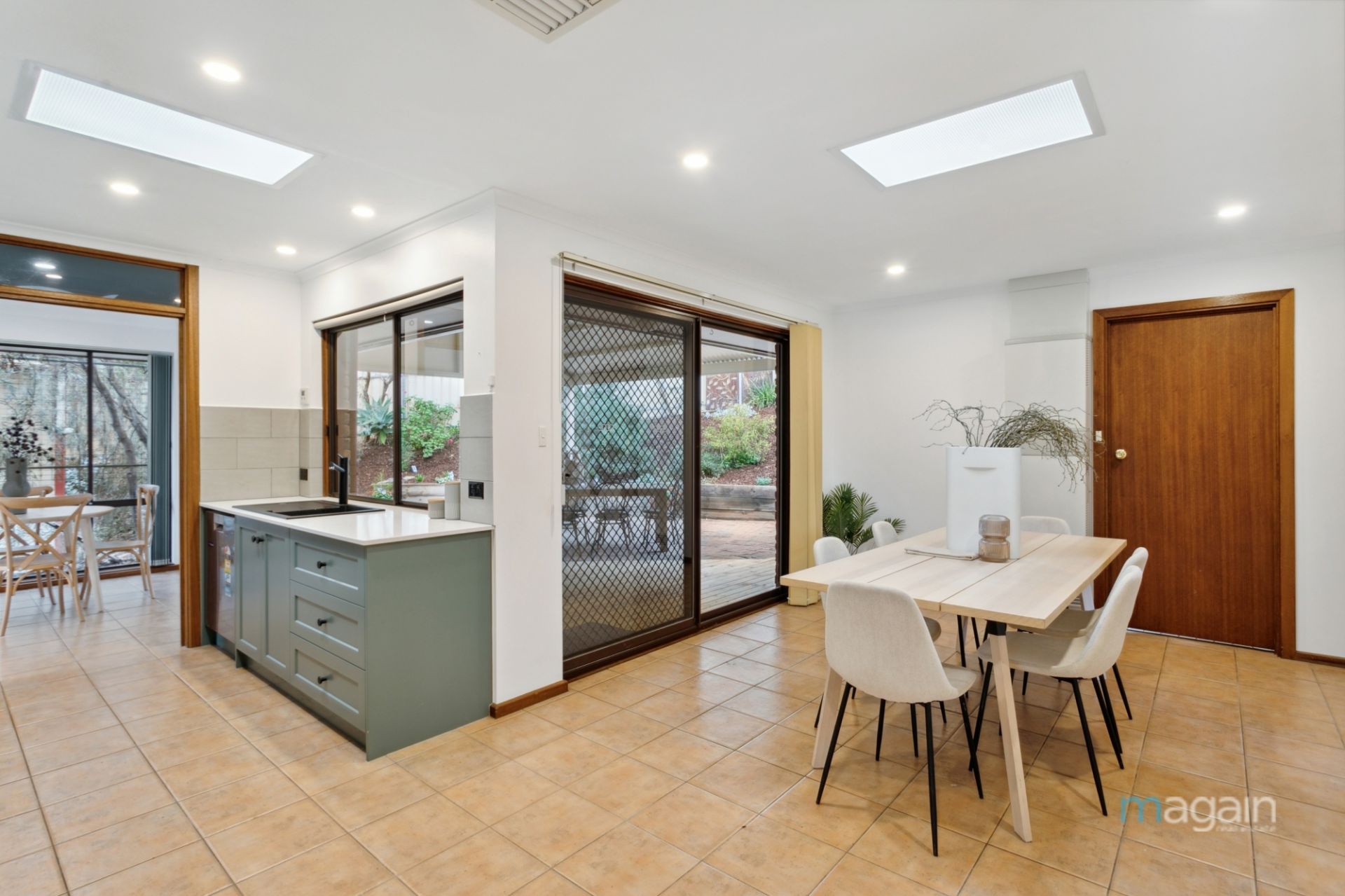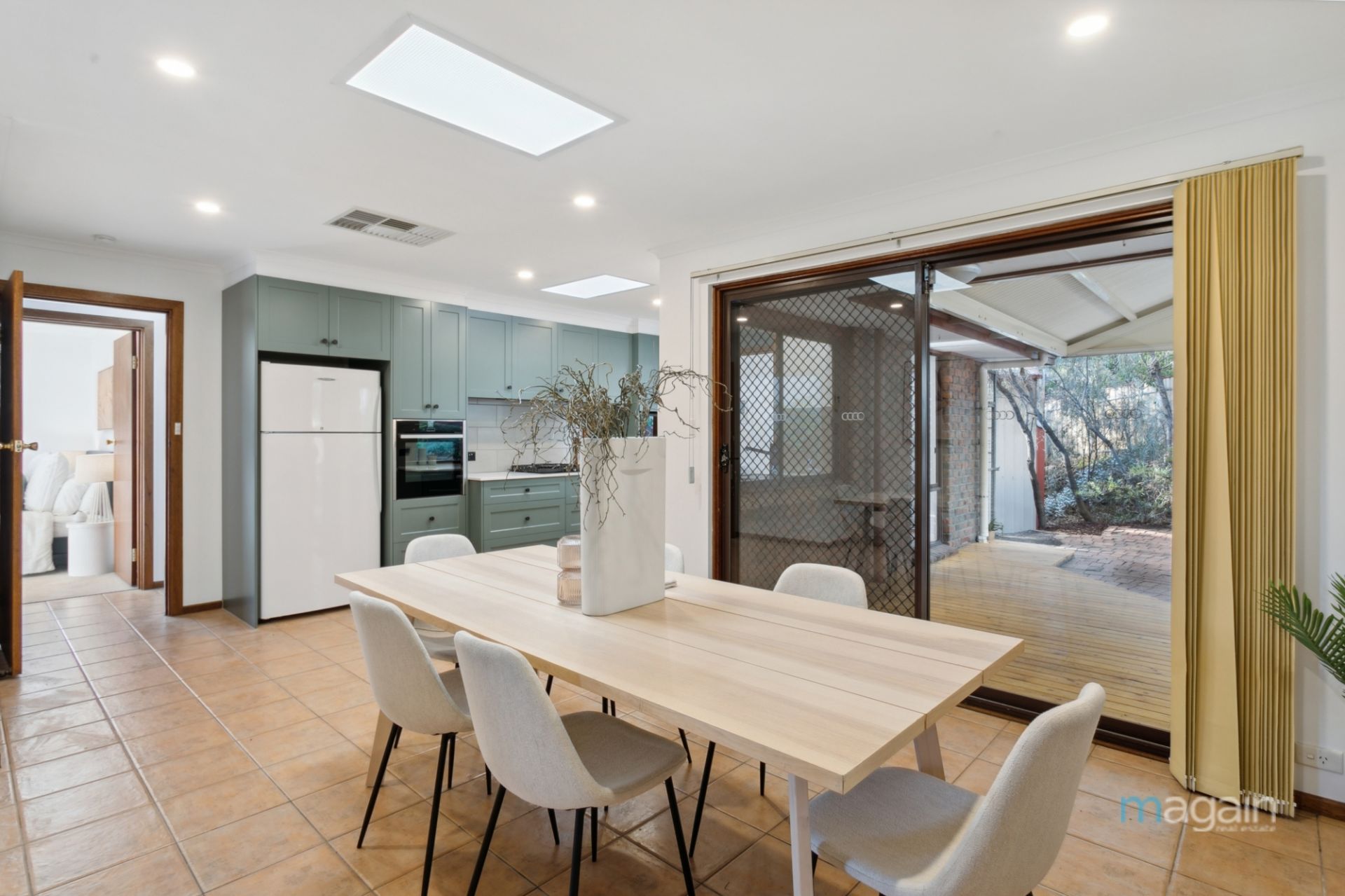 From the dining area, a sliding door leads to the deck and outdoor entertaining area, ideal for summer gatherings or leisurely Sunday lunches.