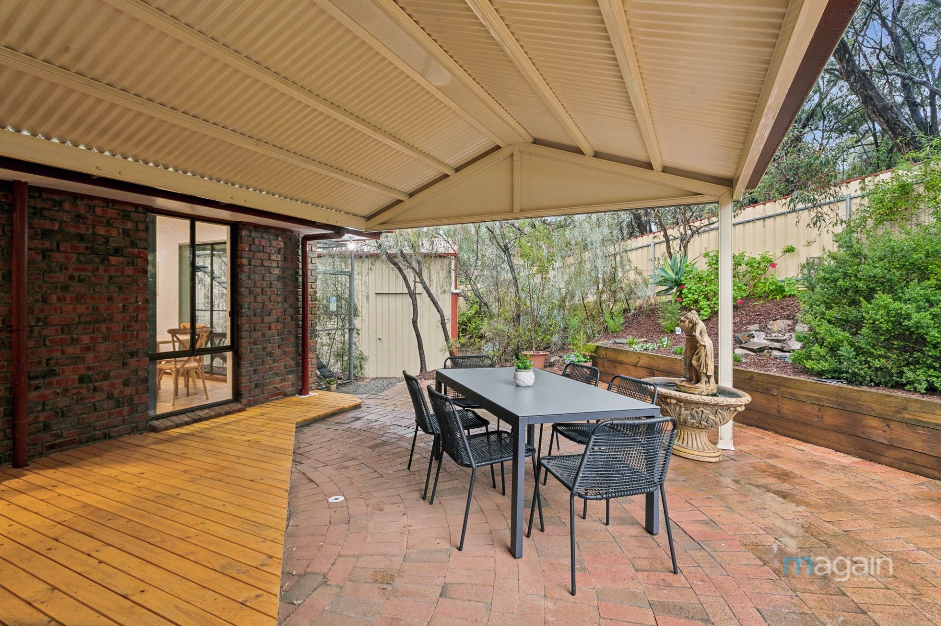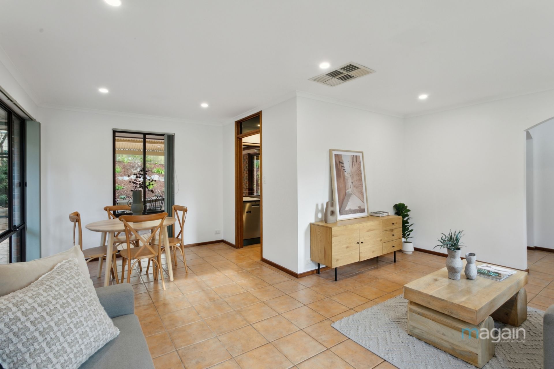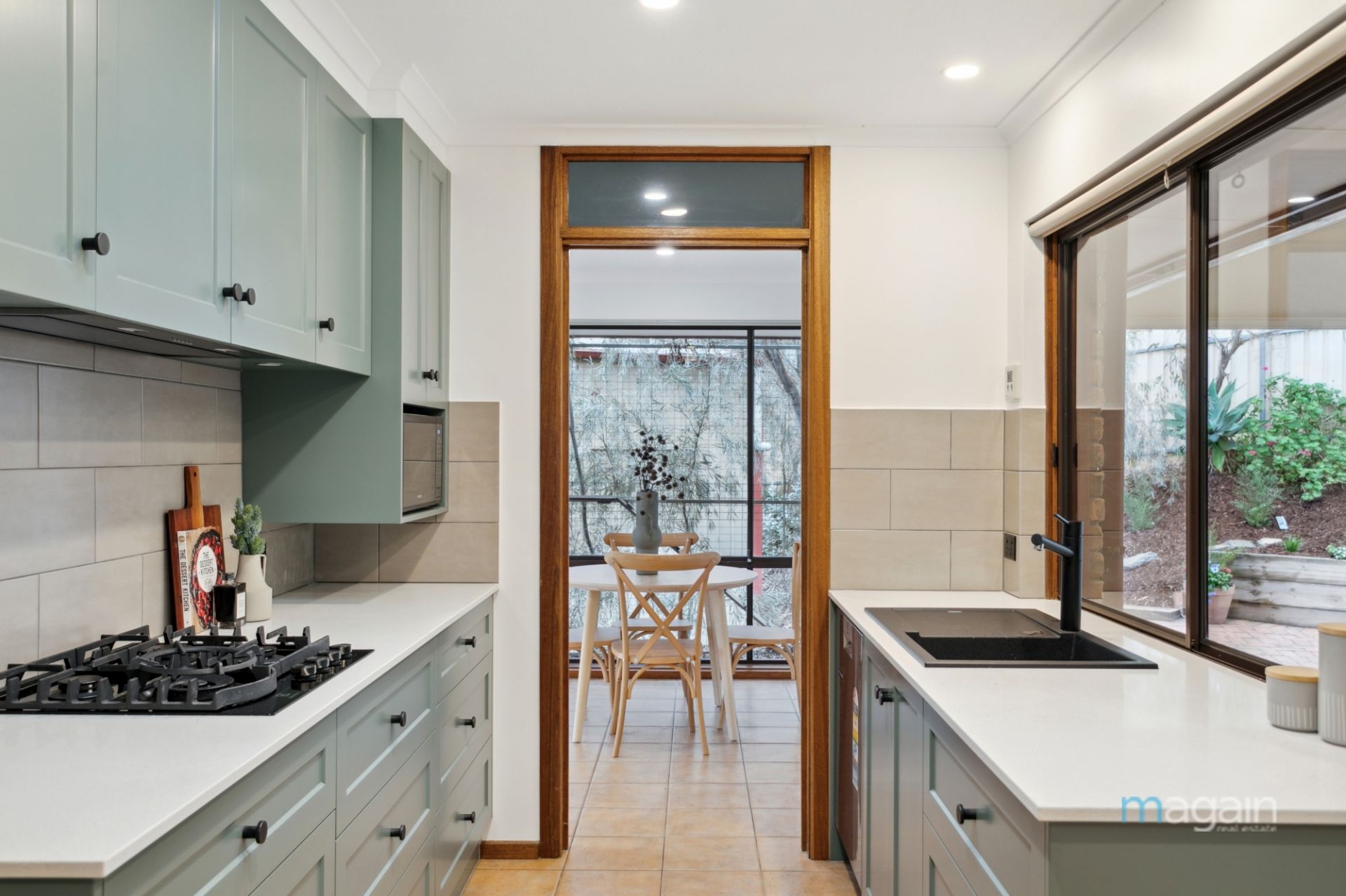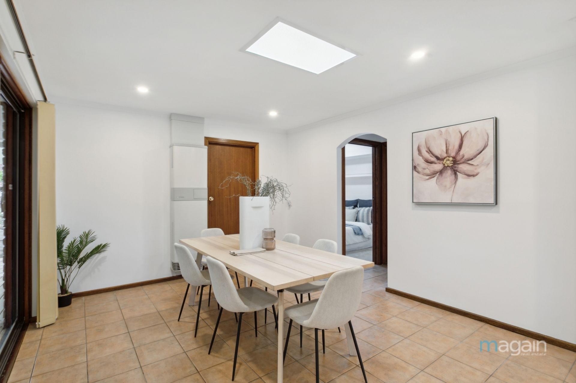 From the dining area, a sliding door leads to the deck and outdoor entertaining area, ideal for summer gatherings or leisurely Sunday lunches.