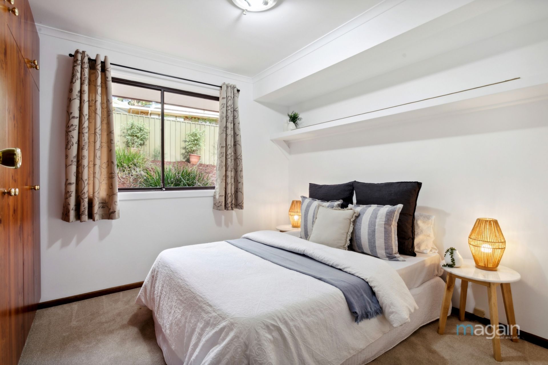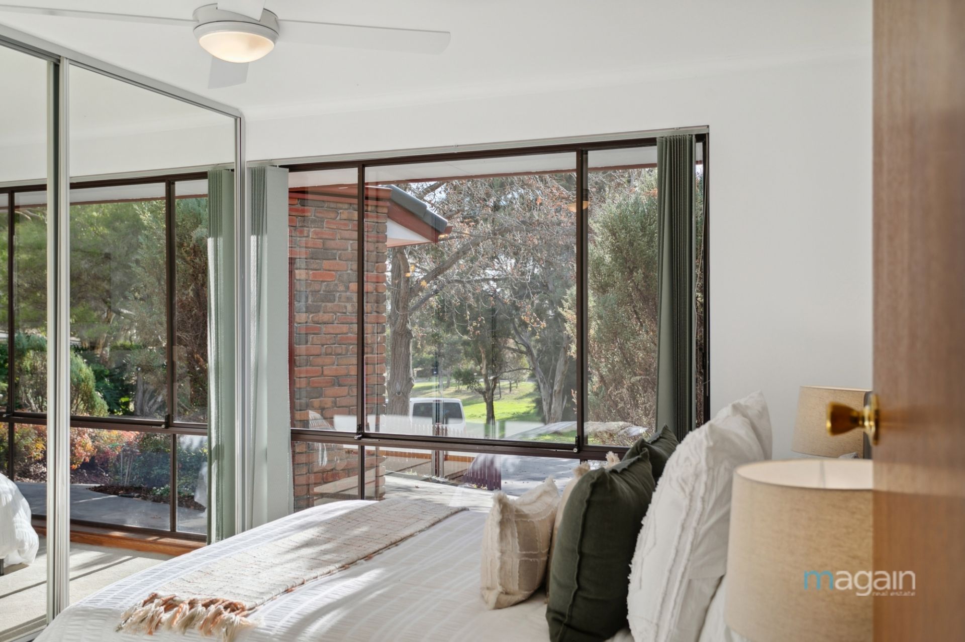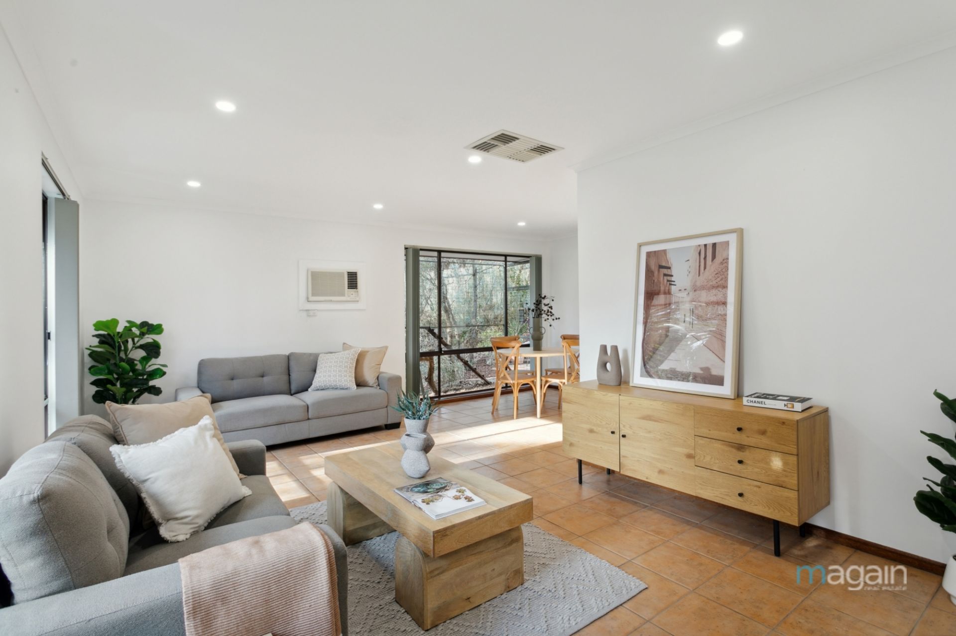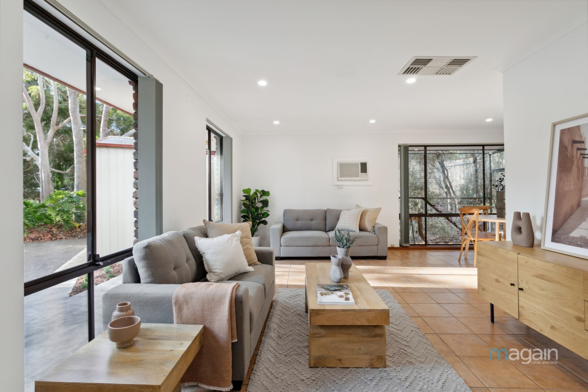 Upon entry, you're welcomed into a serene lounge area bathed in natural light from large windows. The ambiance is enhanced with downlighting and ducted evaporative air conditioning, complemented by a wall unit air conditioner for year-round comfort.
