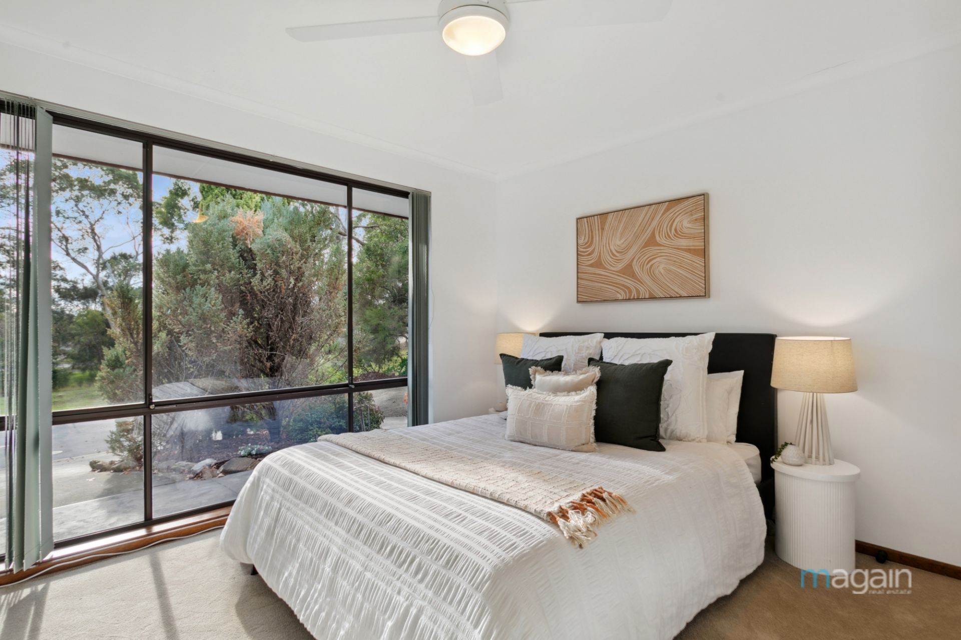 The right side of the property houses three generously sized bedrooms, all serviced by a well-appointed family bathroom with a separate toilet. The main bedroom features a built-in robe and ceiling fan, while bedroom three includes a built-in cupboard for additional storage.