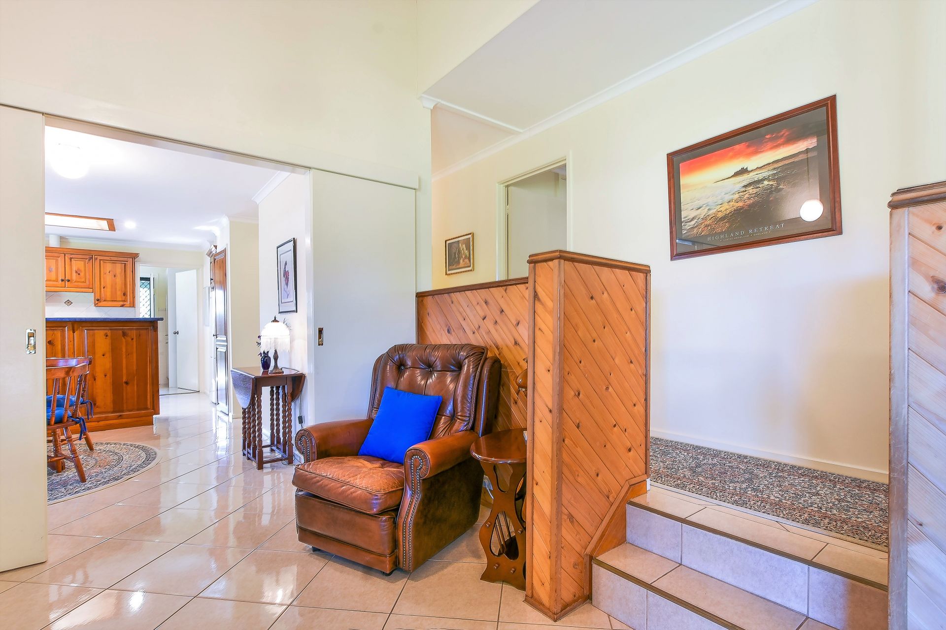 Neutral tiles throughout the lower level and slate or carpet in bedrooms.