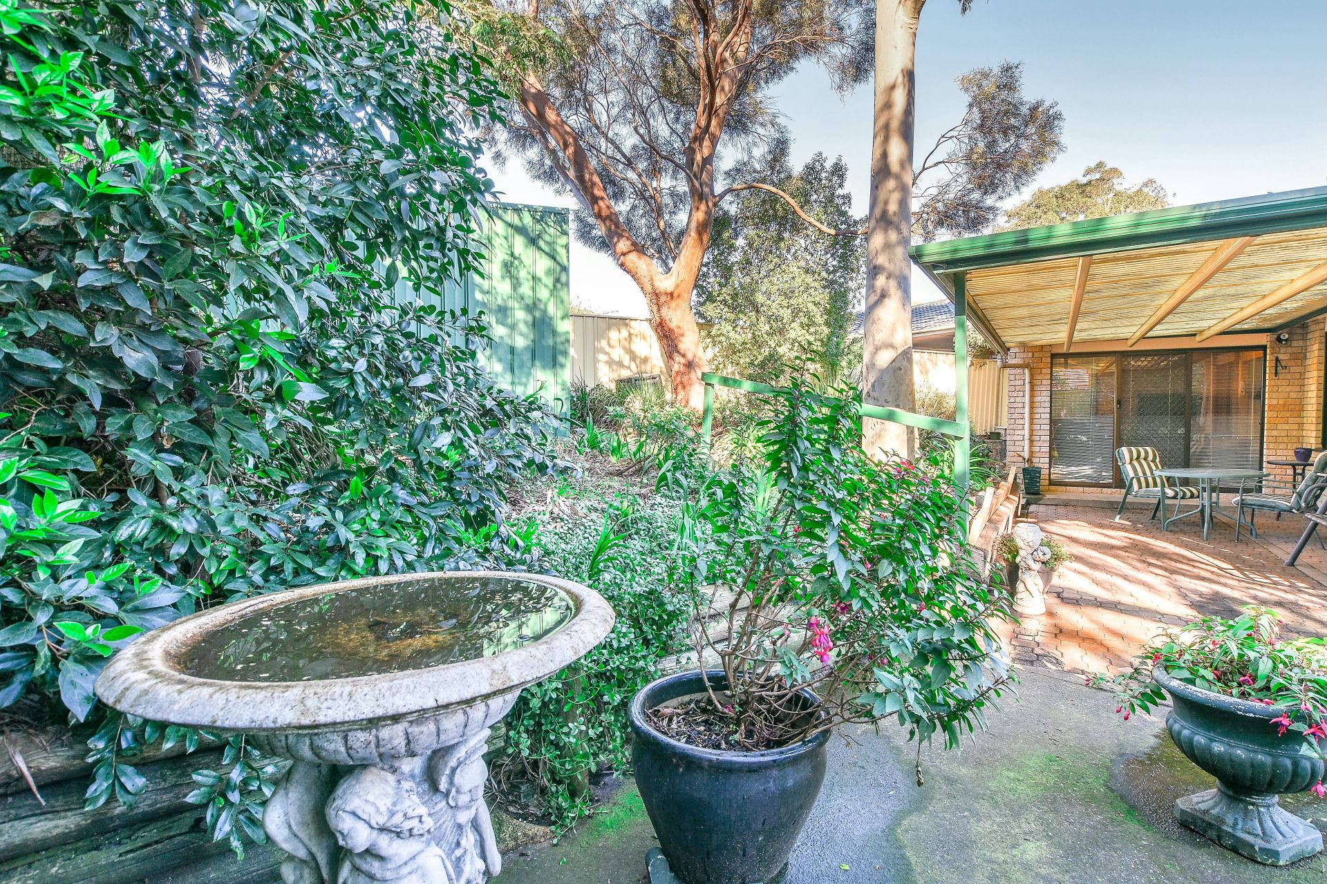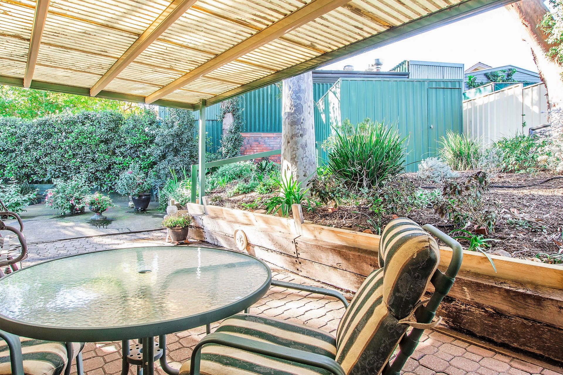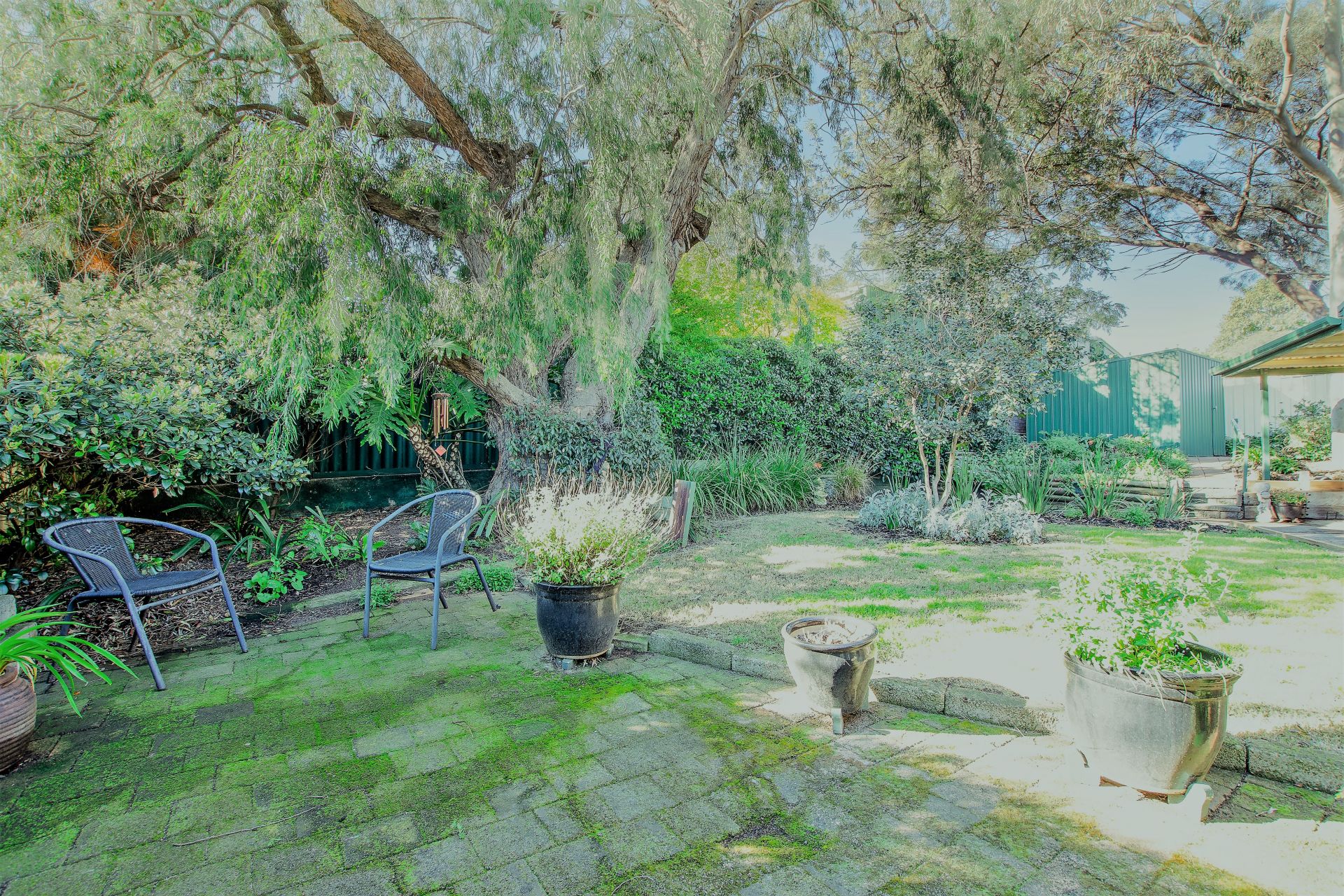 Outside is easy care with a garden shed.