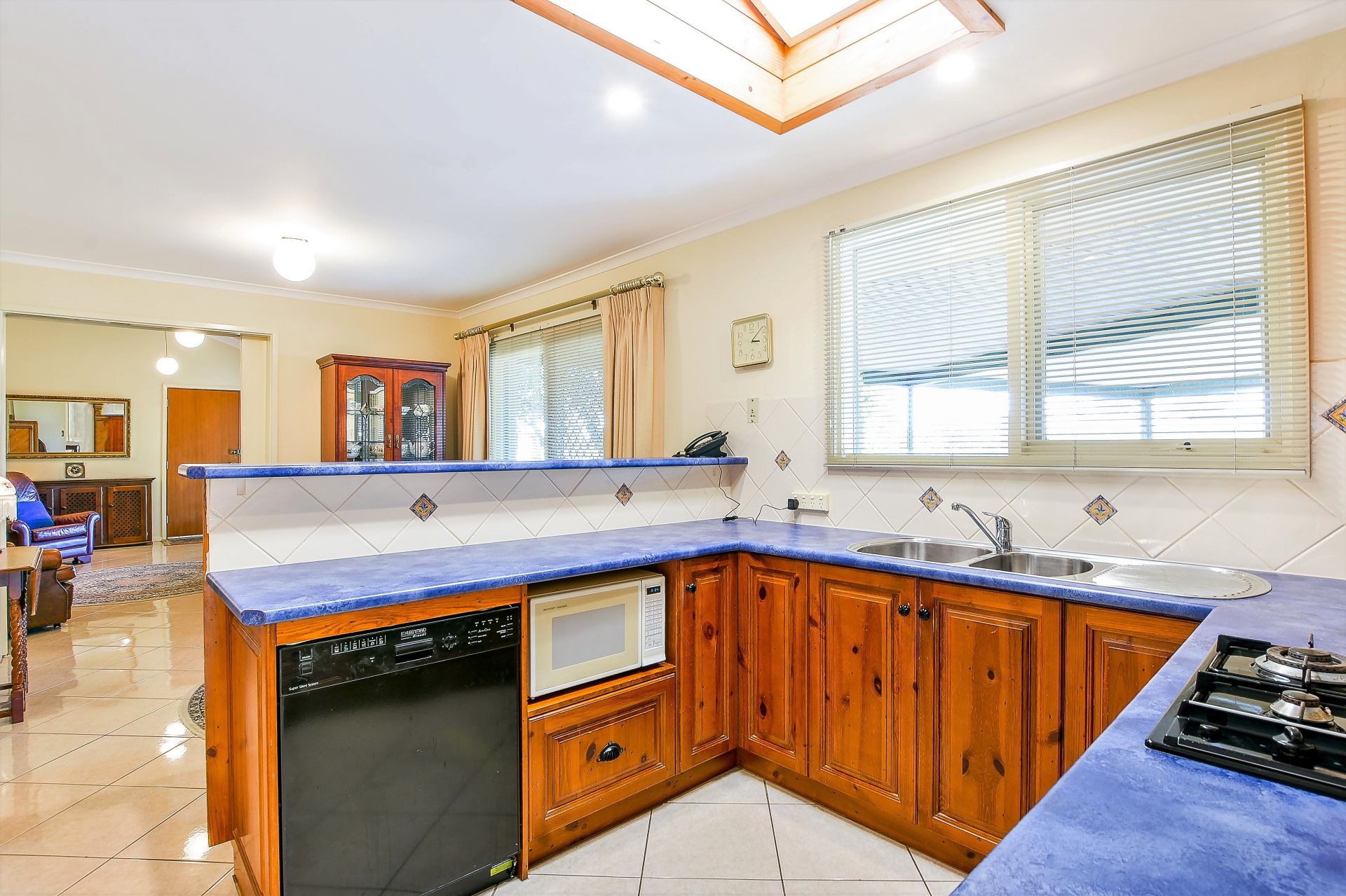The modern kitchen has a large skylight and looks out to the dining area and beyond to the lounge. Air con in lounge and gas heating, there's great storage in this house and a good-sized laundry.