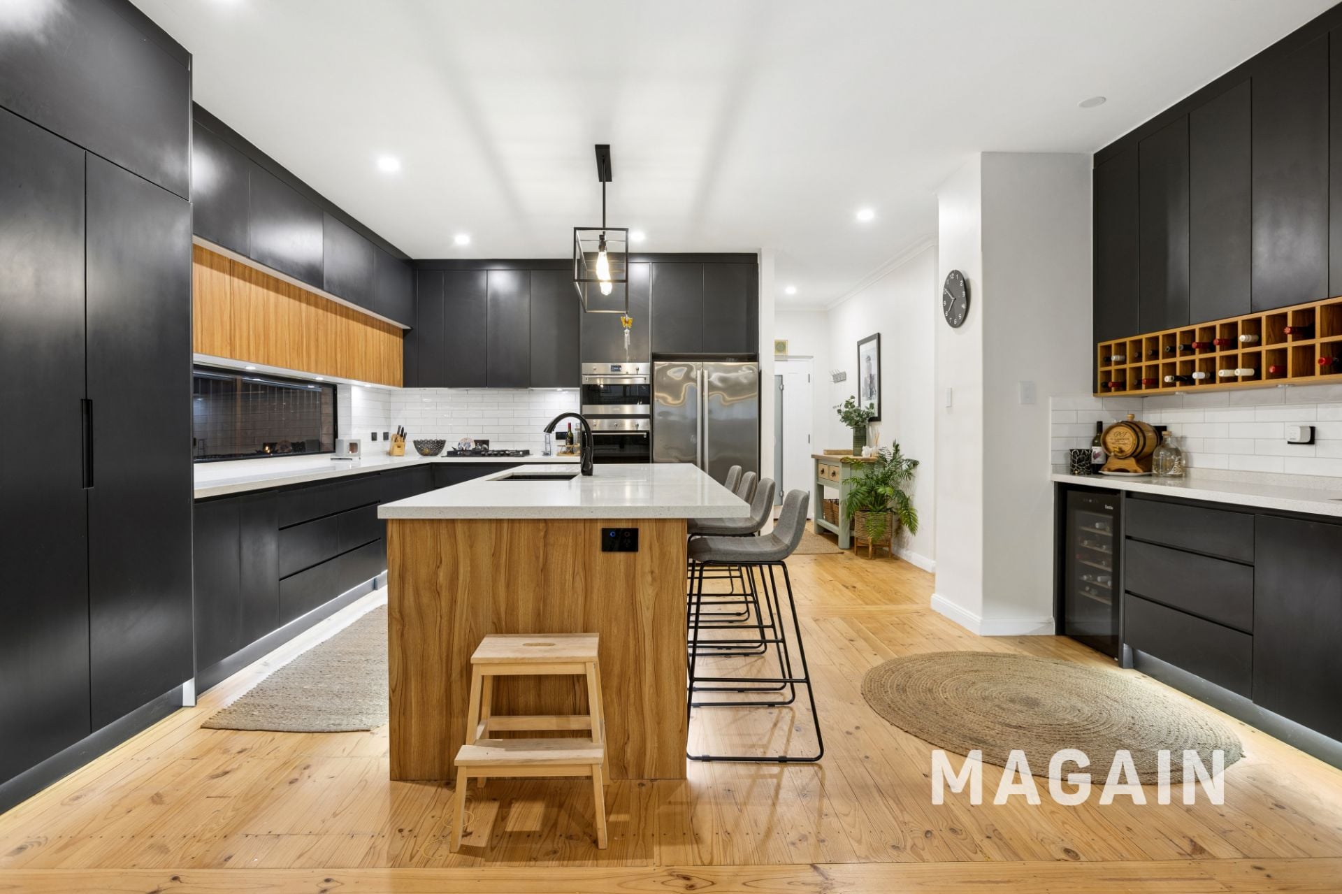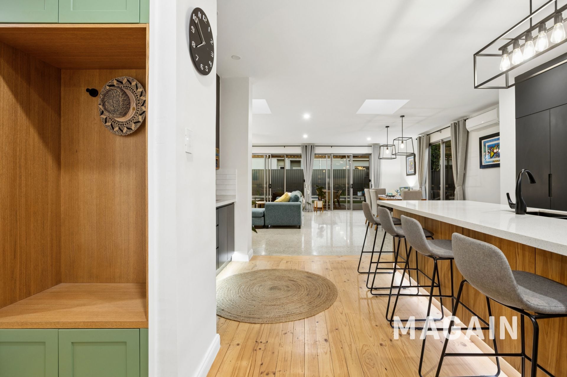 Moving further inside, warm floorboards transition to the huge extension, featuring polished concrete as the home opens into an impressive open plan living, dining and kitchen area - truly the heart of the home. Designed for entertaining and everyday living, this expansive space is filled with natural light thanks to two large skylights, while comfort is assured year round with a split system air conditioner and gas fireplace.