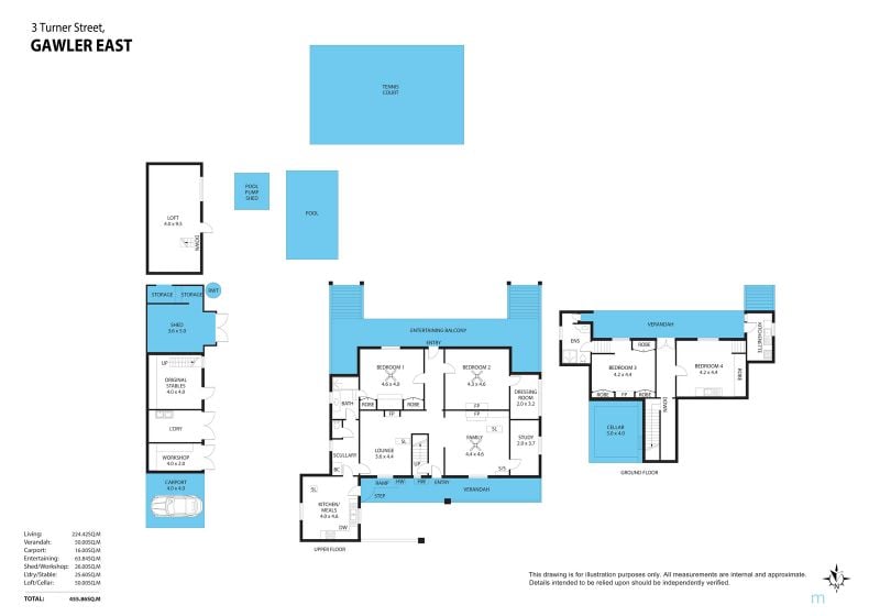 An imposing C1867 residence situated on one title of some 4555sqm (approx.) with an approx. 50m frontage, tiled swimming pool, tennis court and outbuildings. Built over 2 levels, the manor which has a magnificent west facing balcony, made of significant slabs of original Mintaro slate, includes up to 4 bedrooms, 2 bathrooms, cellar, formal dining and living areas and much more.