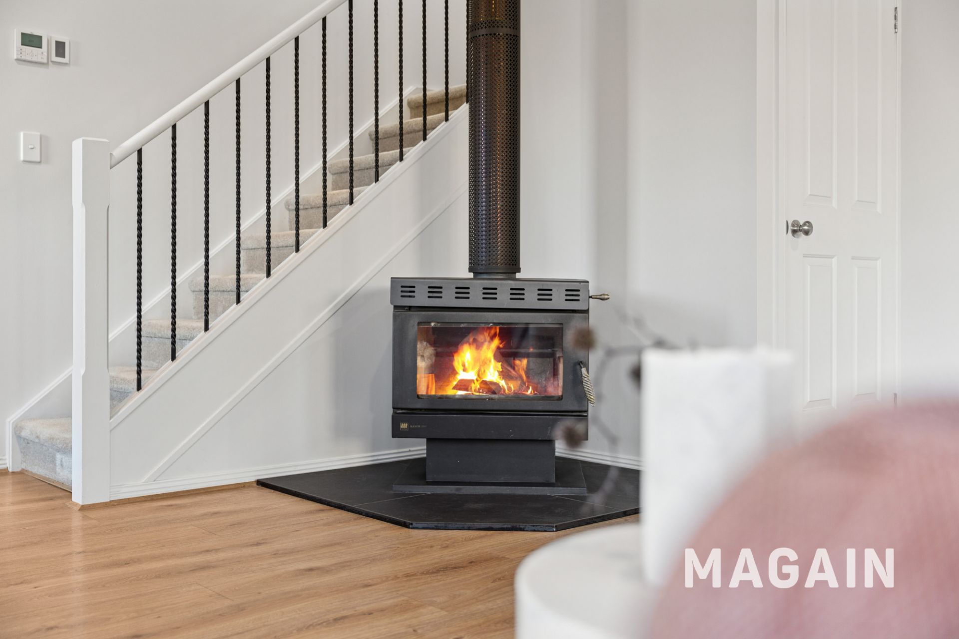 The formal lounge offers a cosy retreat, enhanced by a slow-combustion heater, before flowing through to the heart of the home-an expansive open-plan kitchen, dining and living zone. Renovated in 2022 to an exceptional standard, the kitchen is a true showpiece featuring a 110cm freestanding Falcon cooker with dual ovens, five gas burners and induction cooktop, stone benchtops, soft-close cabinetry, dishwasher, recessed double sink with mixer tap, statement splashback and a generous butler's-style pantry. Thoughtful design ensures the kitchen enjoys pleasant outlooks to the side yard, adding natural light and connection to the outdoors.