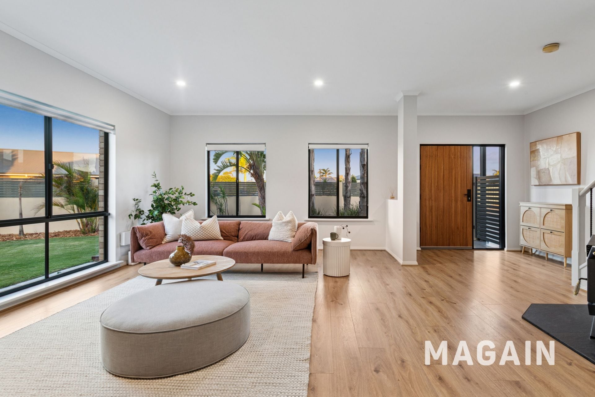 A fully fenced yard and substantial three-car garage/workshop-complete with a built-in office (that can be easily turned back into carparking if required)-set the tone for a home designed to cater for families, tradies, entertainers and those seeking flexibility. A striking feature entry door opens to a welcoming foyer where high ceilings, downlights and timber floating floors create an immediate sense of quality.