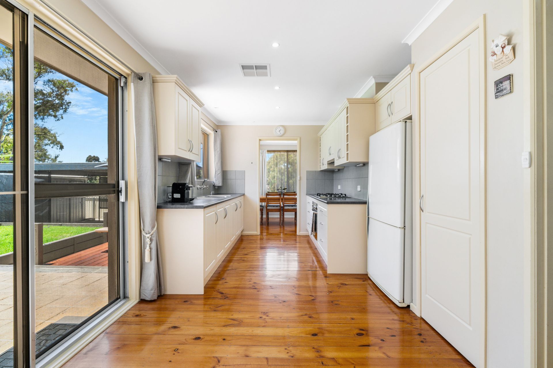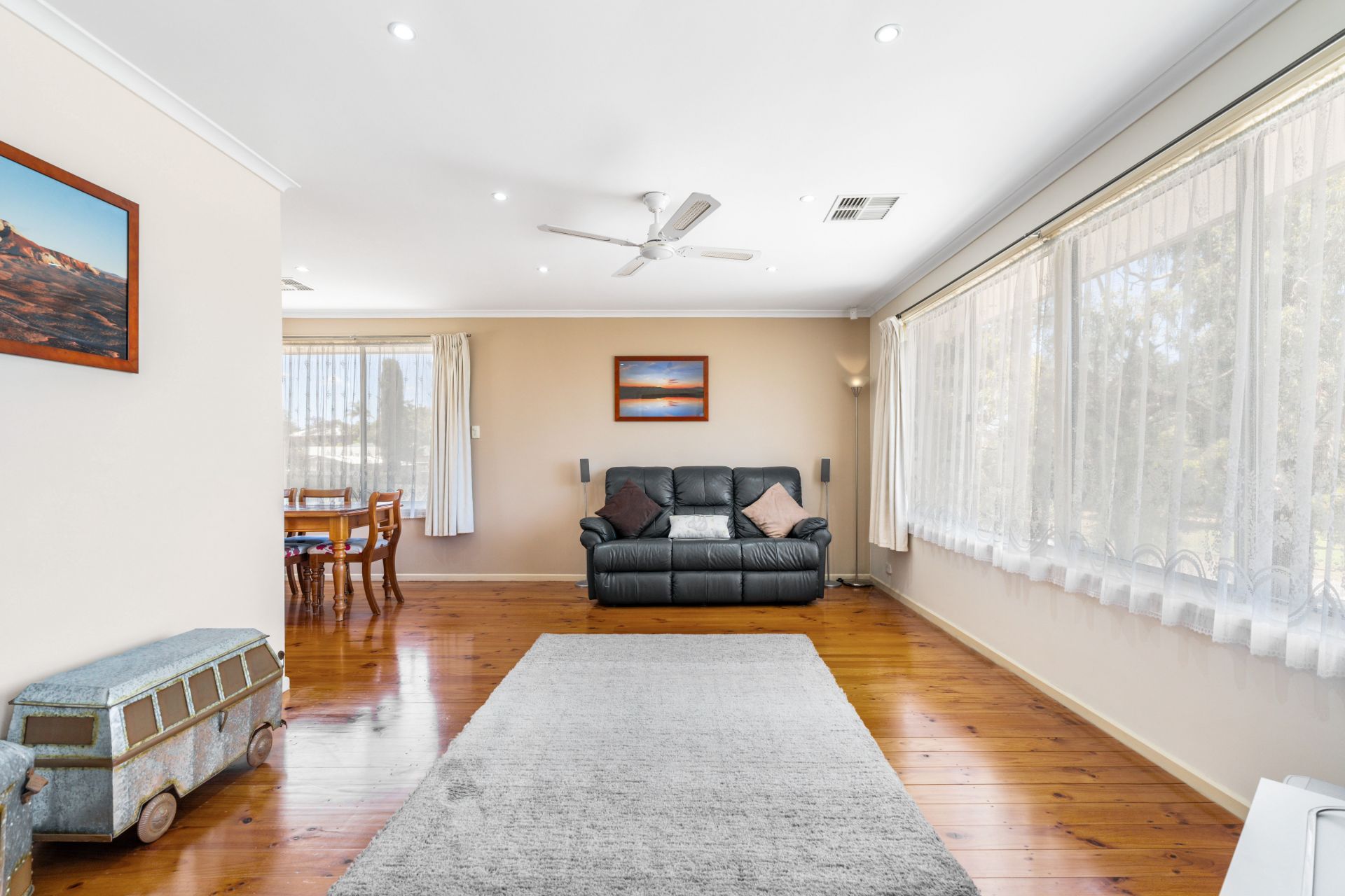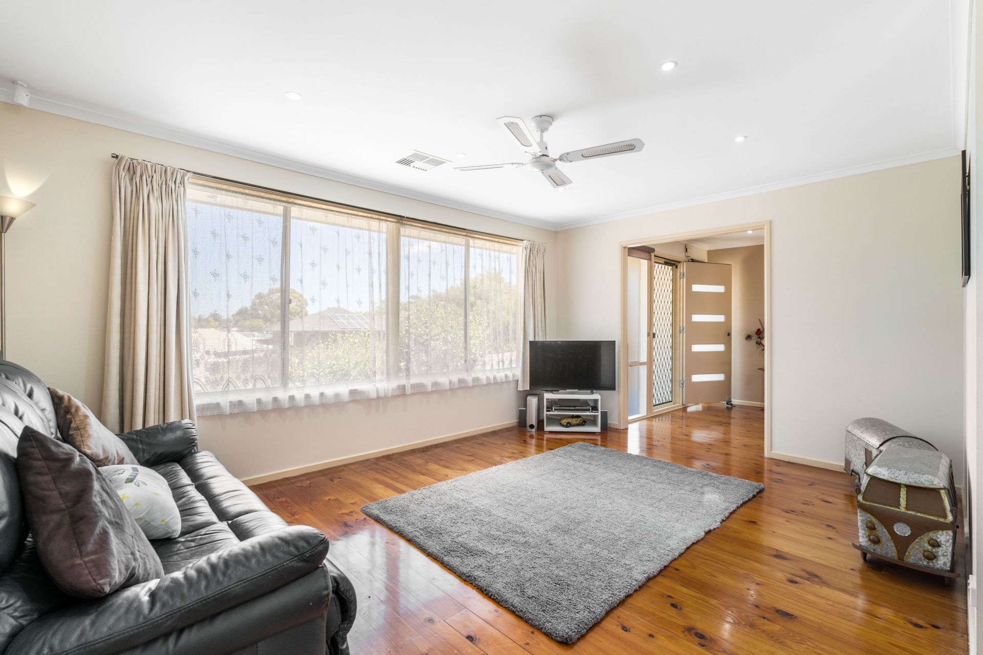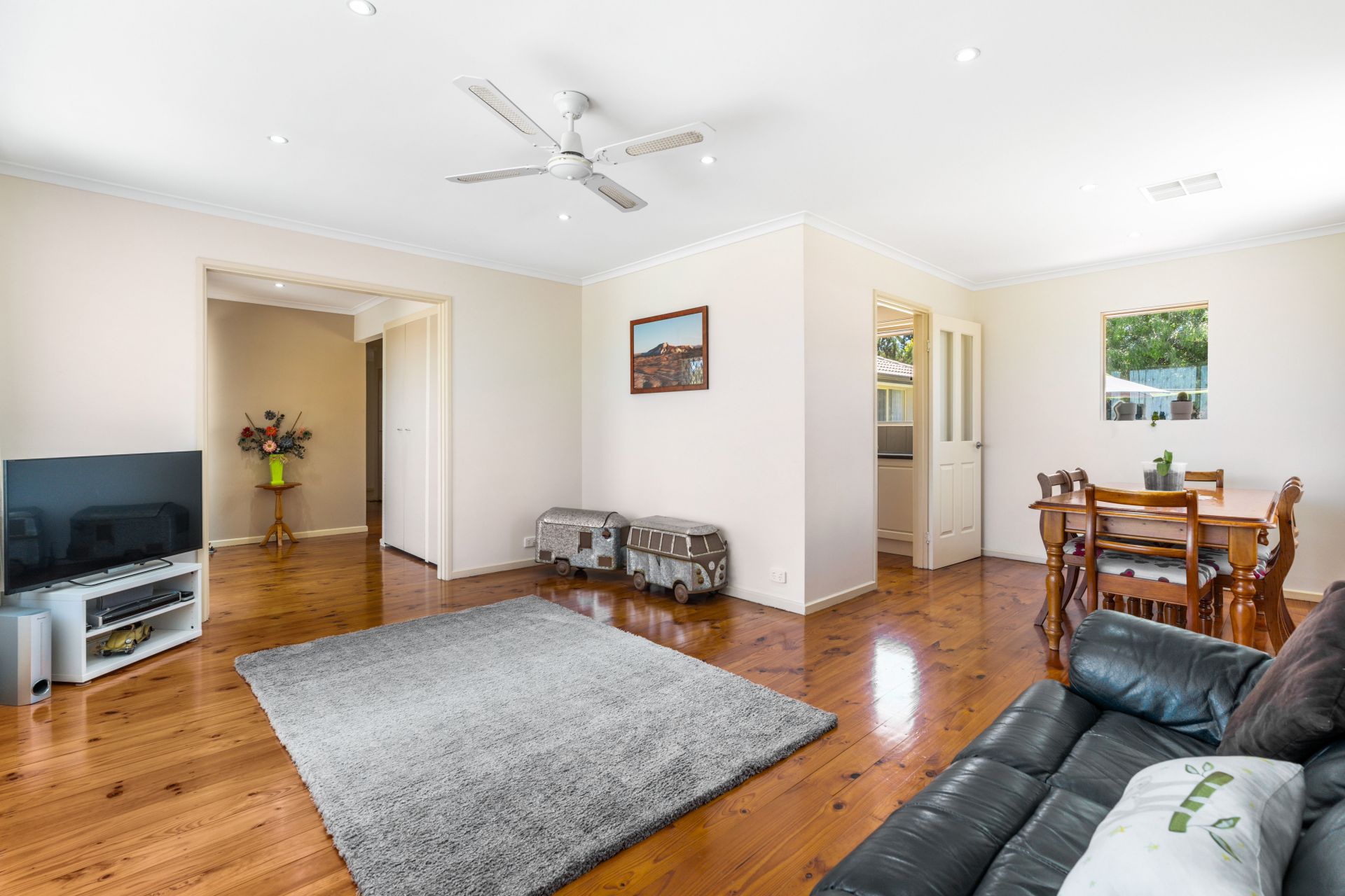 Step into this charming property through a tidy entrance adorned with a built-in storage cupboard, setting the tone for a well-organized and welcoming atmosphere. The entry seamlessly flows into an L-shaped formal lounge and dining area, a ceiling fan and a large picture window here not only enhance comfort but also provide a picturesque view of the adjacent park.