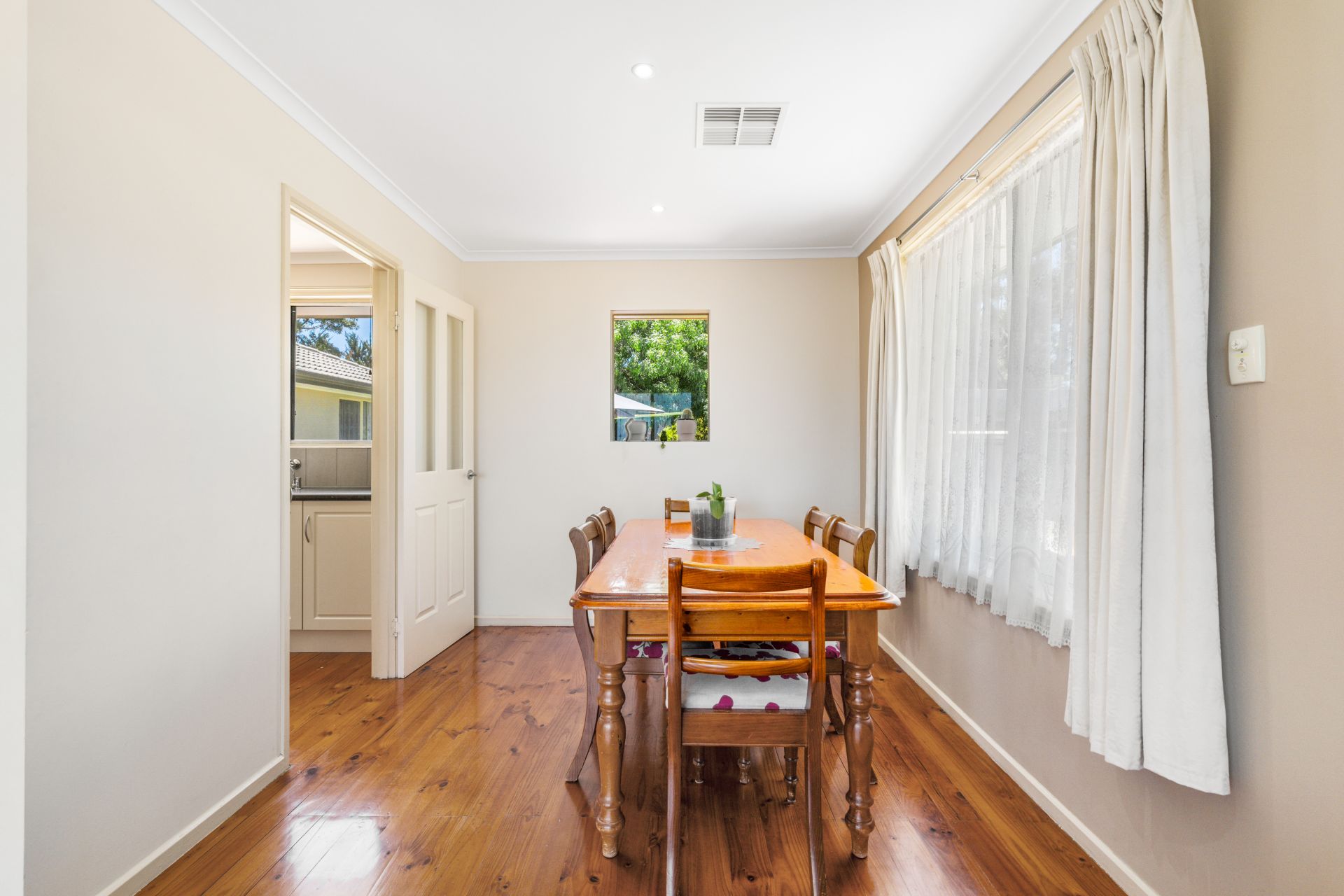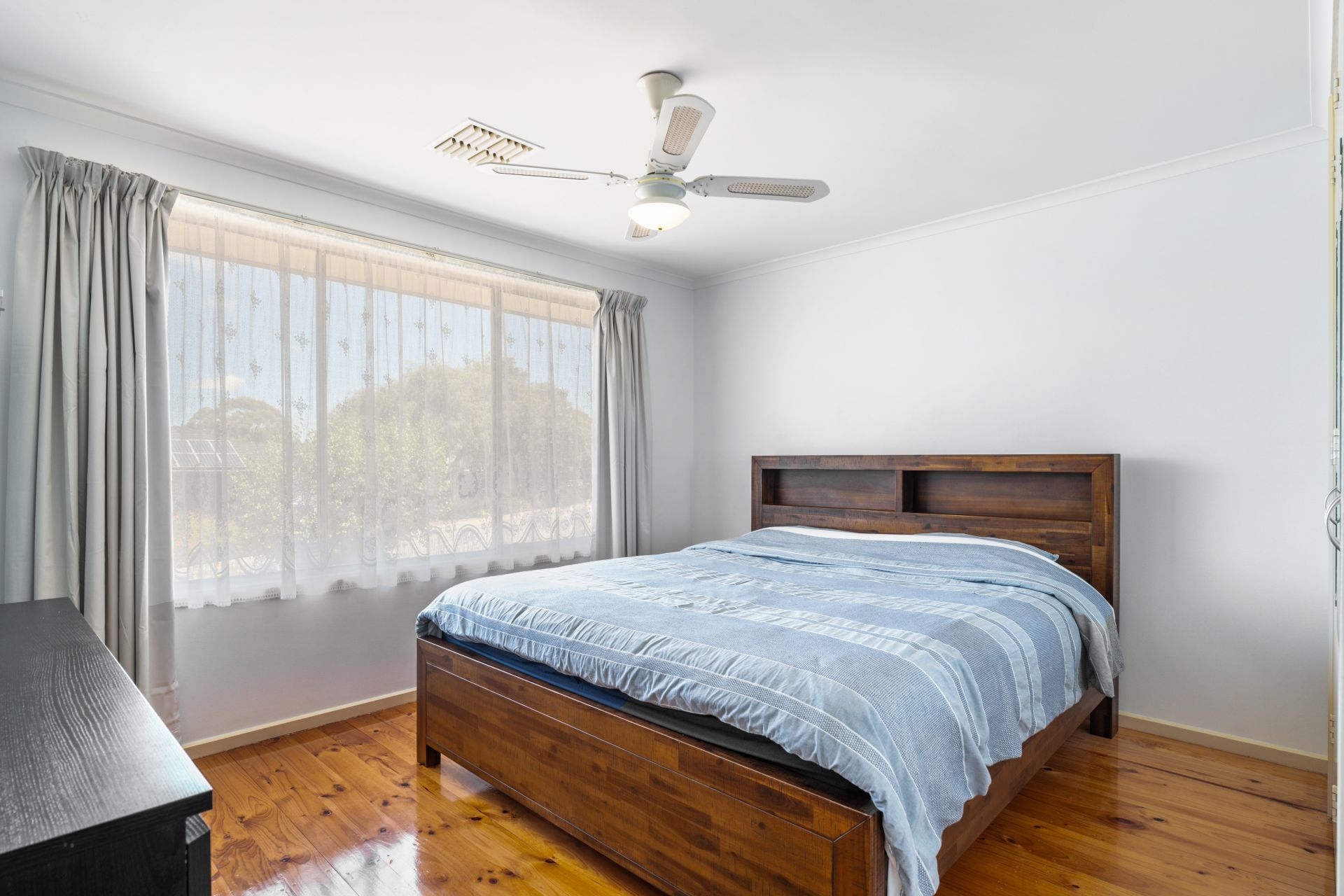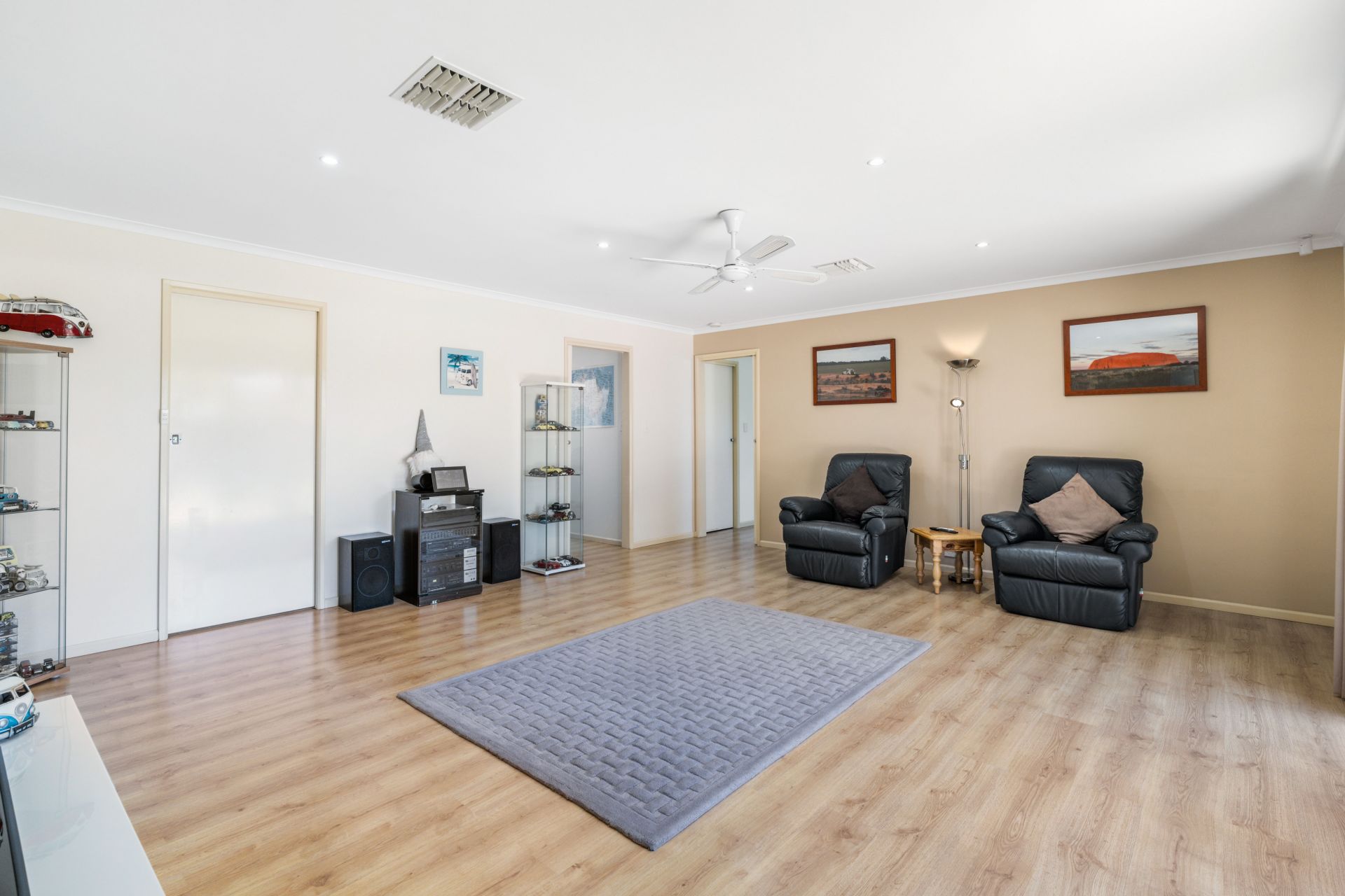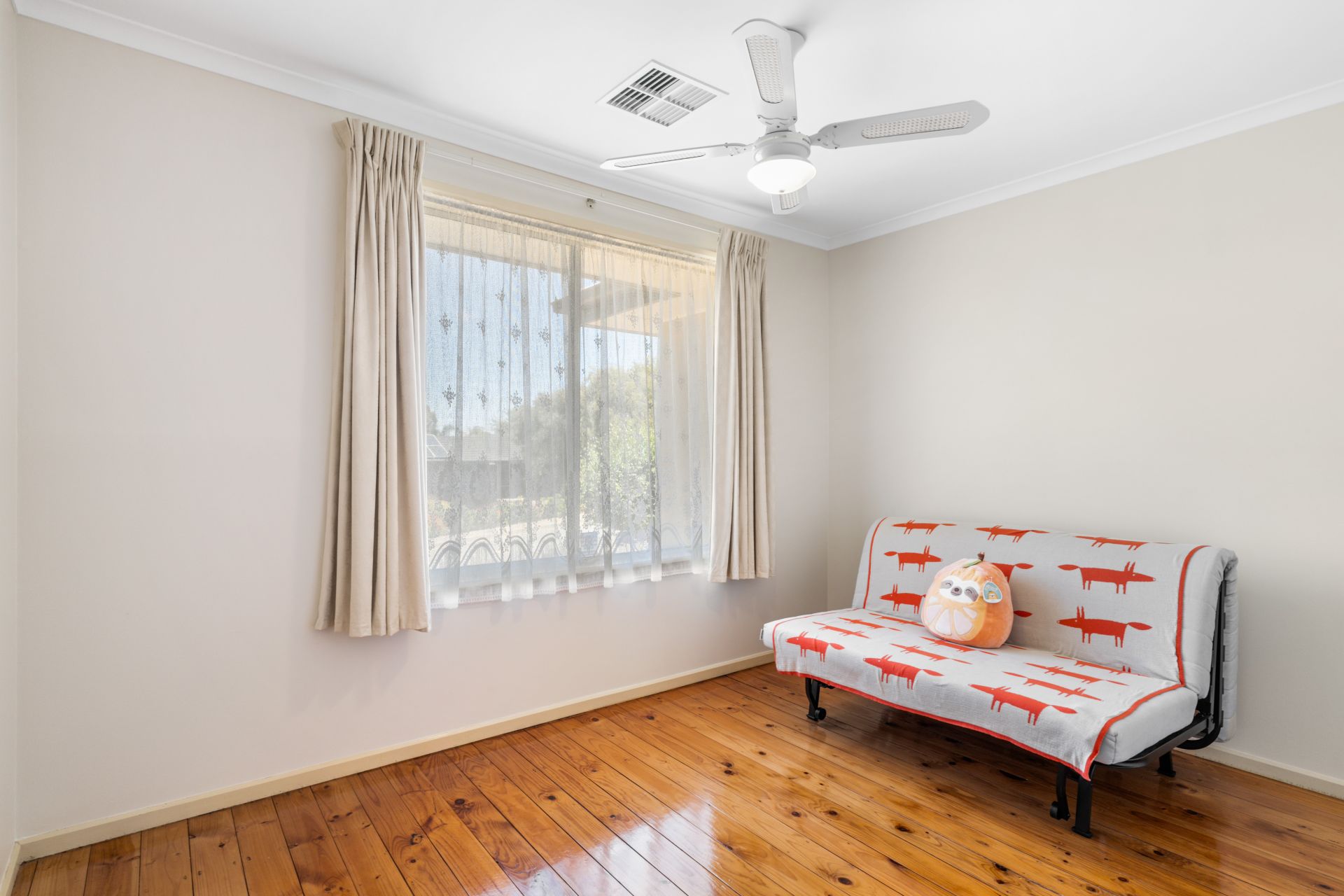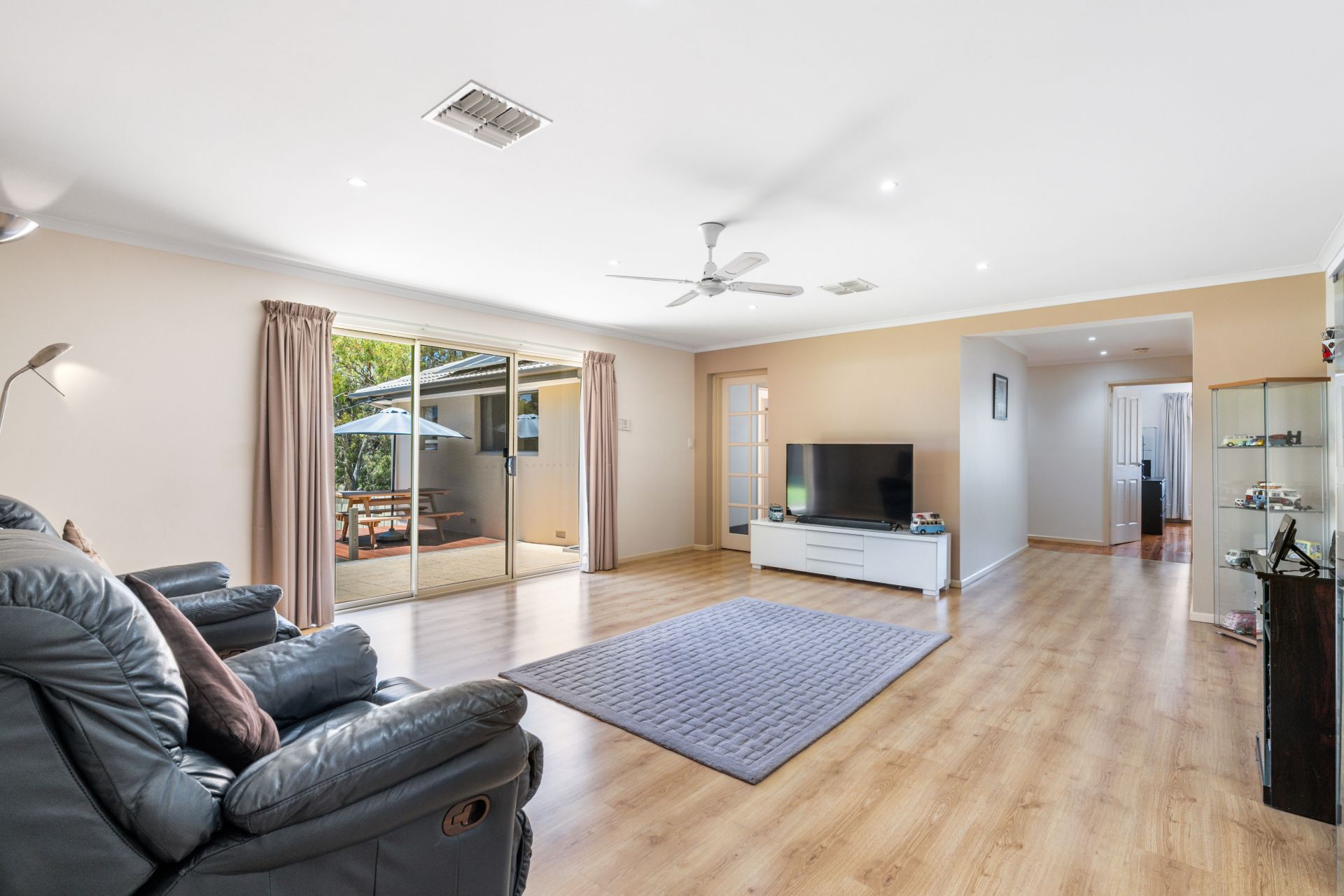 Step into this charming property through a tidy entrance adorned with a built-in storage cupboard, setting the tone for a well-organized and welcoming atmosphere. The entry seamlessly flows into an L-shaped formal lounge and dining area, a ceiling fan and a large picture window here not only enhance comfort but also provide a picturesque view of the adjacent park.