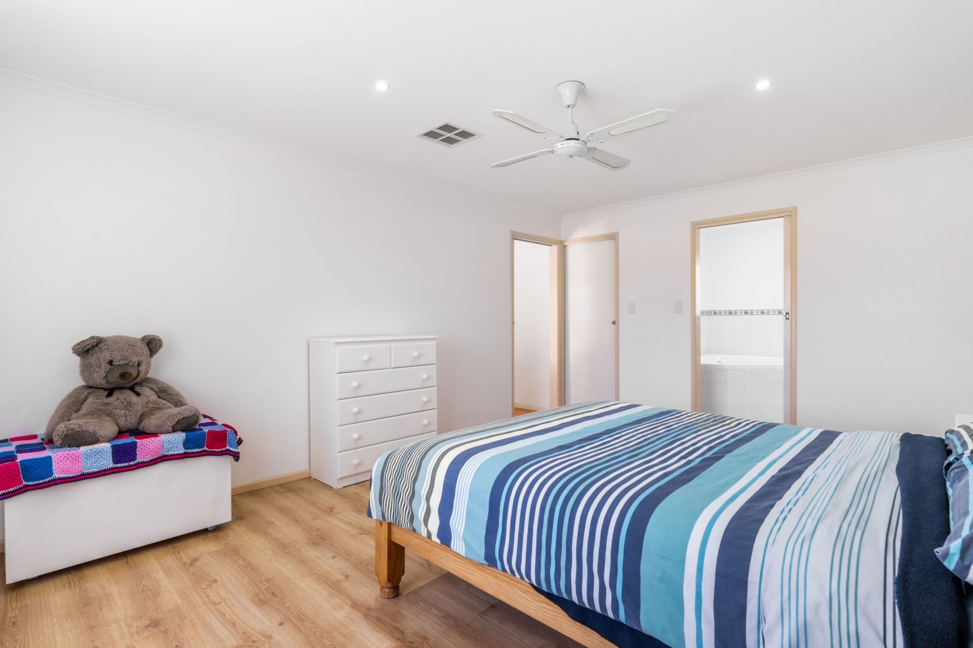 Retreat to the back of the home to find the master bedroom, a private haven equipped with a ceiling fan, walk-in robe, and an ensuite featuring a luxurious corner spa bath. Meanwhile, bedrooms two, three, and four are strategically placed at the front of the home, each adorned with ceiling fans and offering convenient access to the main bathroom. Bedroom two further benefits from a built-in robe, adding to the overall functionality of the space.