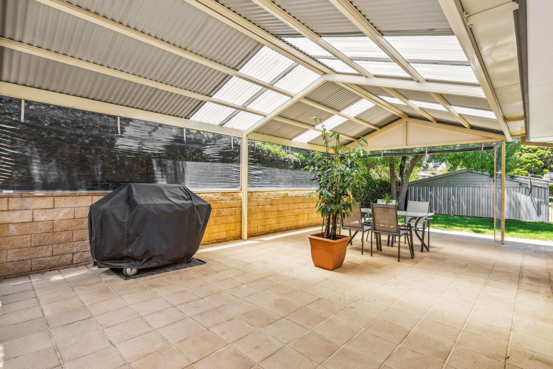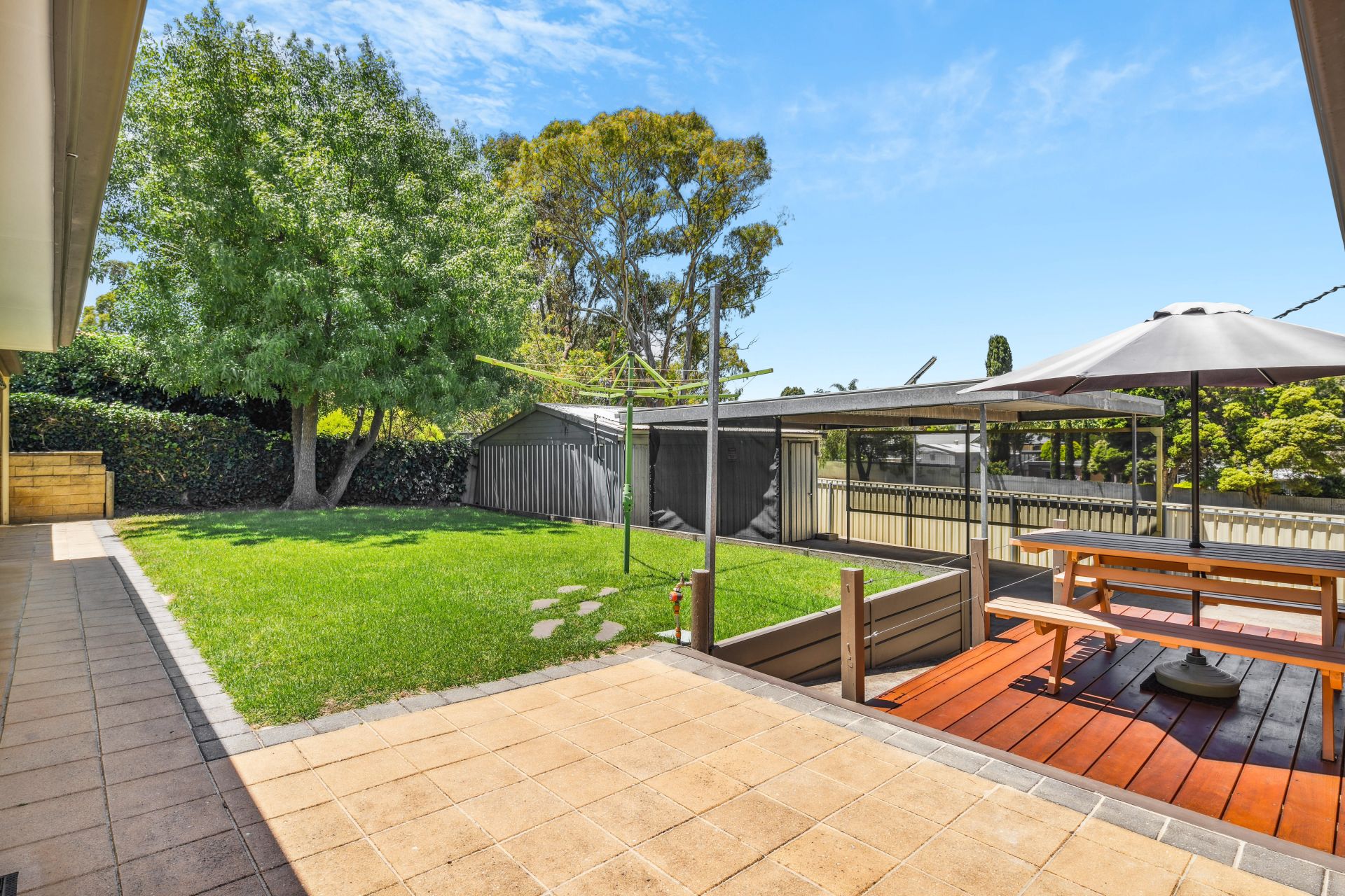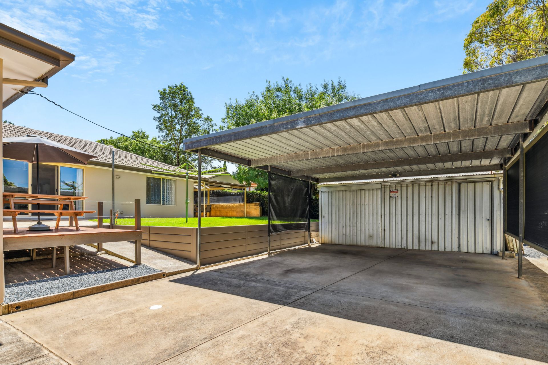 The outdoor oasis is designed with entertainment in mind, featuring a paved area adjacent to a decked section, providing a dynamic and visually appealing split-level yard. The property also boasts a beautifully presented grassed yard, that leads to the main entertaining area running along the back of the home, covered by a pitched roof pergola and surrounded by café blinds, creating a perfect balance between aesthetics and practicality. The double carport, not only provides shelter for vehicles but also serves as an excellent space for large gatherings, regardless of the weather. This carport conveniently opens up to a large shed with power connected, offering additional storage or workspace.