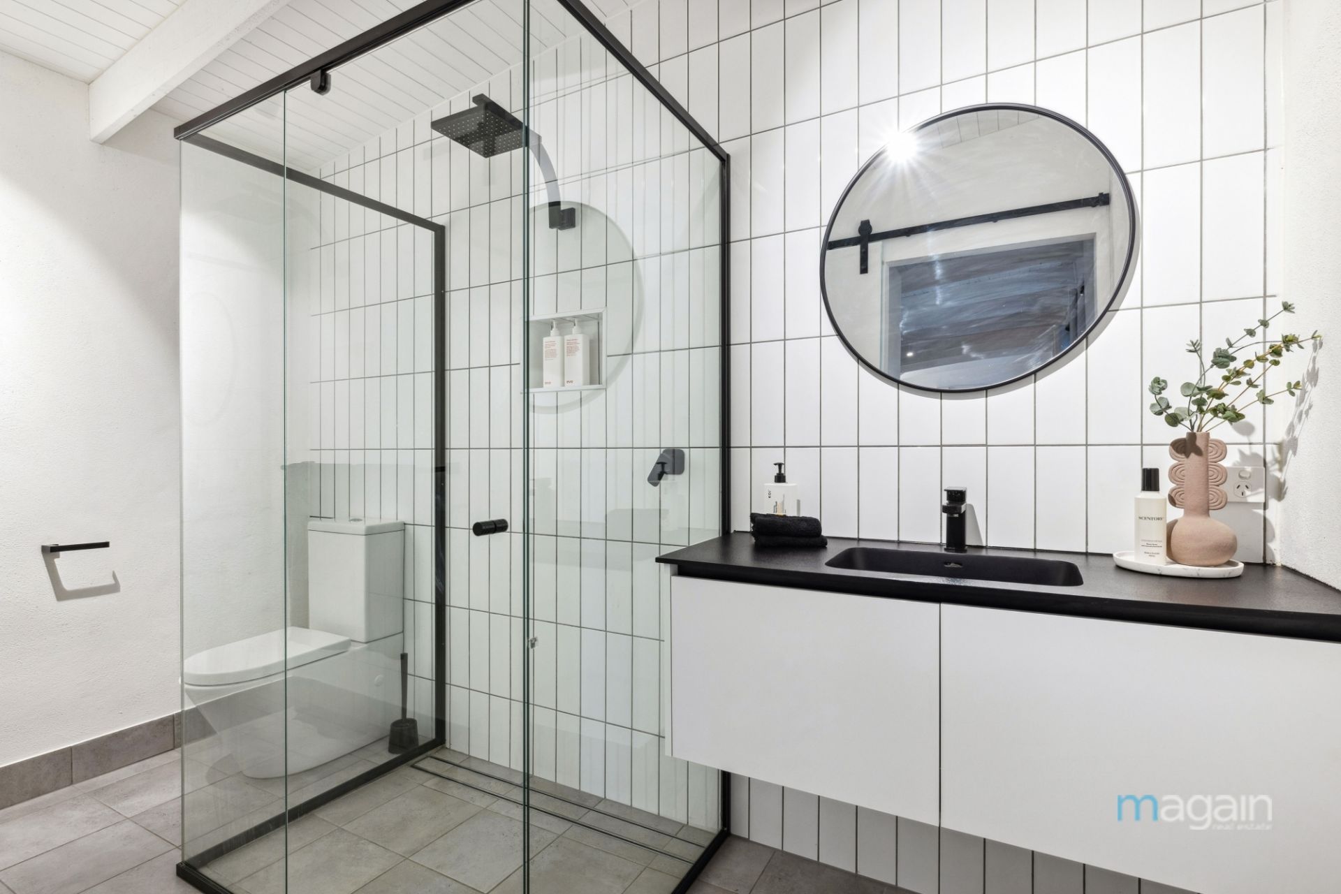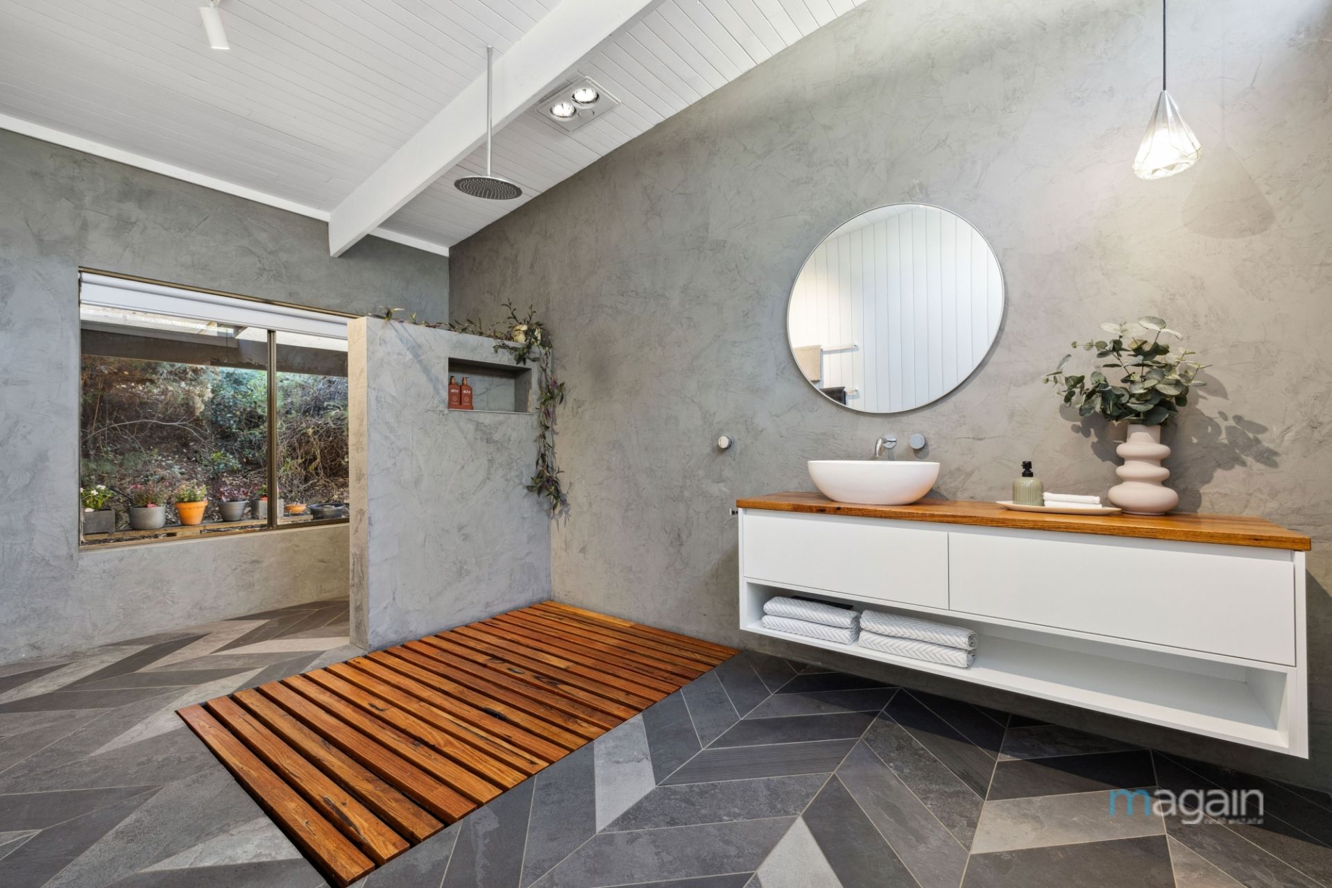 The homes main bathroom reflects the same high standards as the rest of the property. Also boasting venetian plaster render and heated floors, a floating vanity, and rain head shower the bathroom is stylish and spacious. A standout feature of the main bathroom is the timber slatted floor, offering a spa-like experience in the comfort of your own home.
