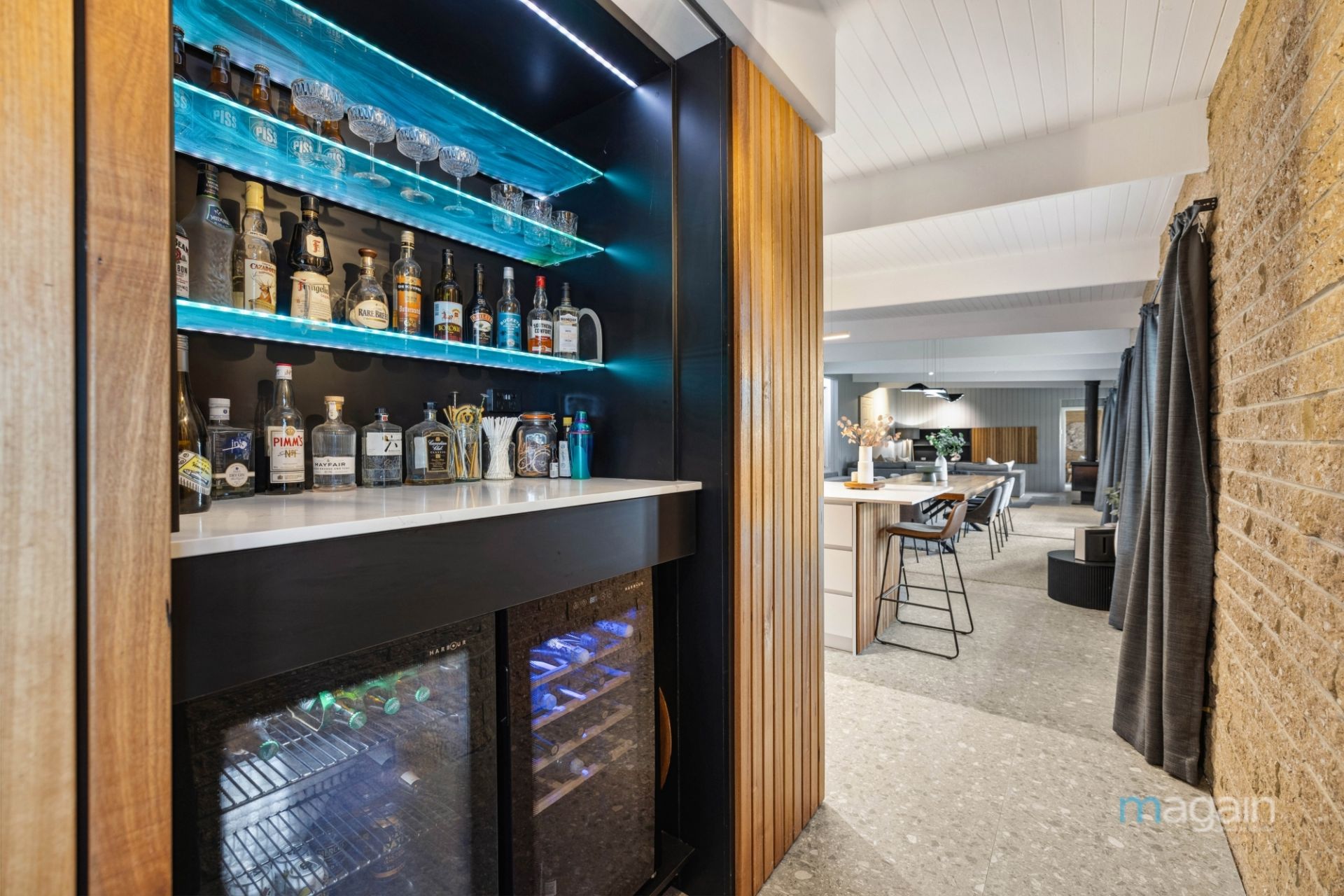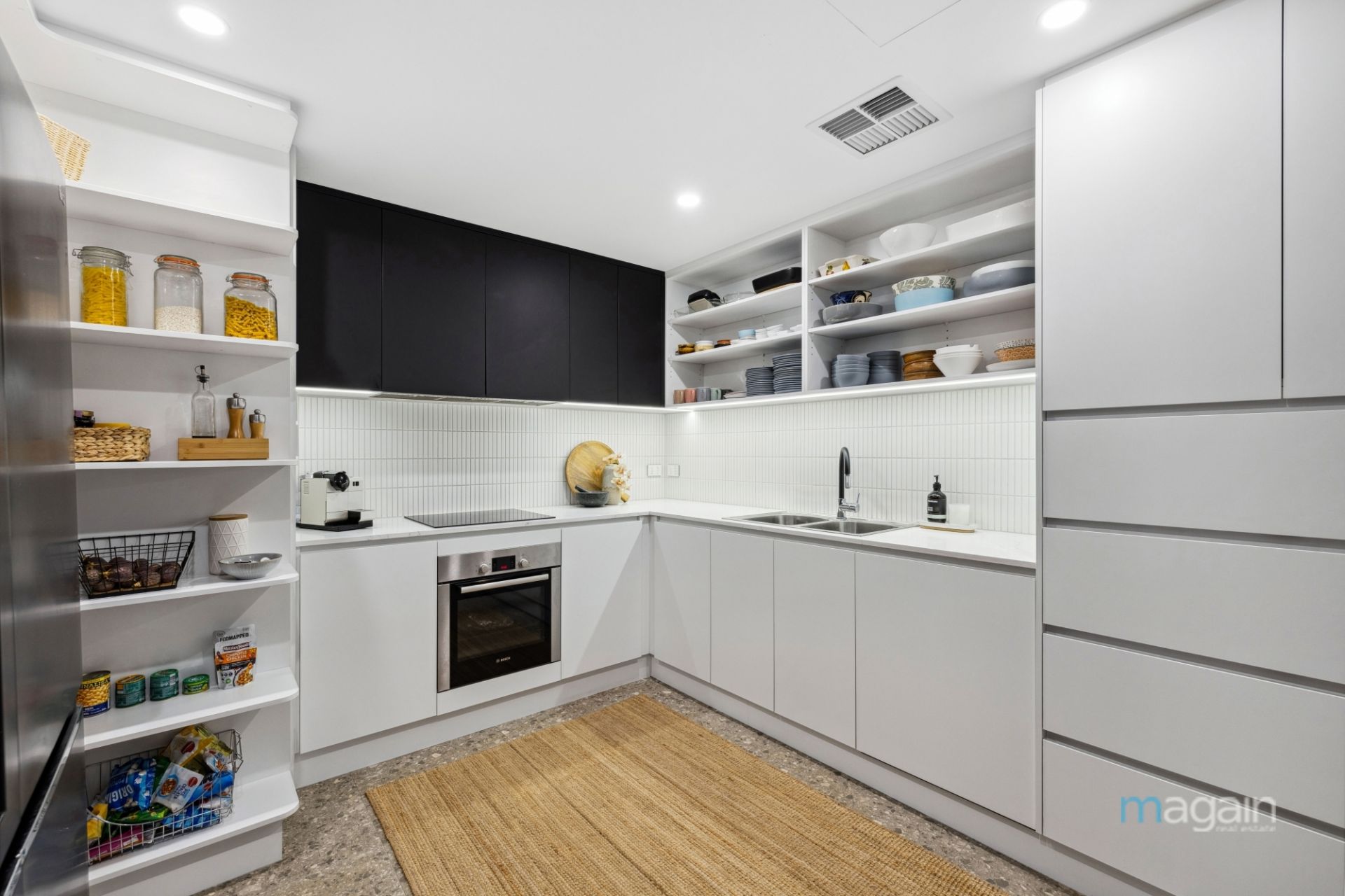 The kitchen is Custom-built to the highest standards and compliments a home of this standard perfectly. Featuring stone benchtops, soft-close cupboards, large storage drawers along with premium appliances such as a Bosch oven and induction cooktop and warming drawer. For those who enjoy entertaining large groups of friends or family, the kitchen is complimented by a spacious butler's pantry, that houses a second Bosch oven and cooktop, dishwasher, dual sink along with an abundance of storage. Adding an extra layer of sophistication, an integrated bar with timber panel walls and LED lighting sits just off the kitchen-a perfect spot for preparing drinks and adds a bit of flair and fun to the home!