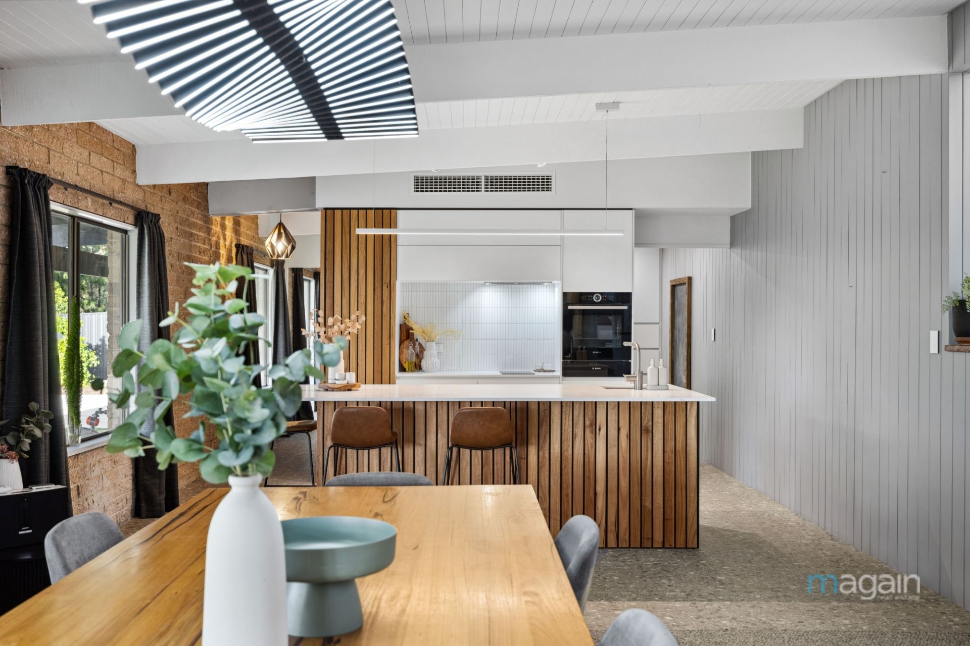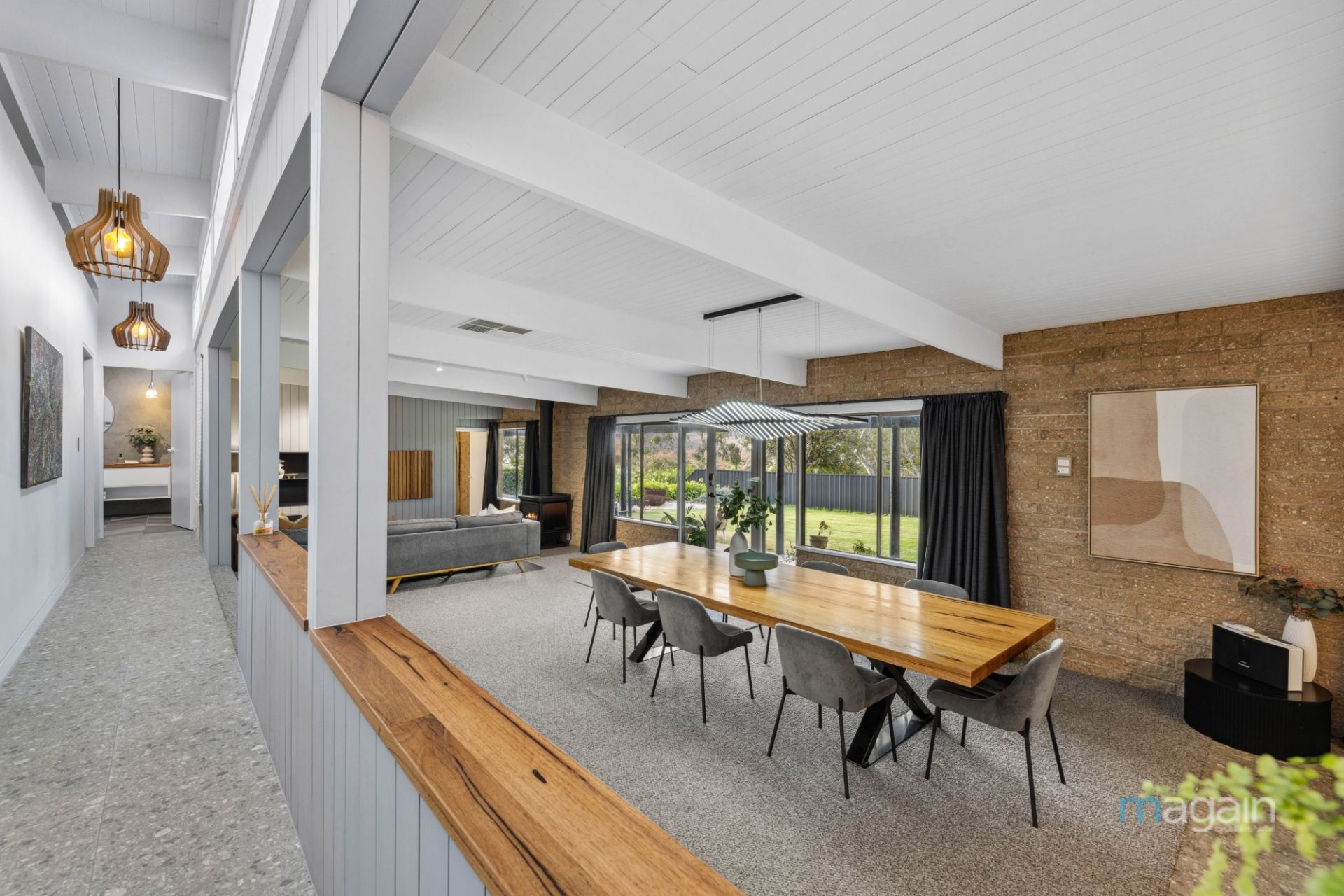 From the moment you step inside, the expansive open-plan living area immediately impresses. In the heart of the home, the lounge, dining, and kitchen space is flooded with natural light, thanks to the large North facing picture windows that frame the awe-inspiring views. A feature timber sliding panel that showcases a feature shelving unit/bookcase when closed and a large TV when open adds an impressive touch to the space while the design captures the best of the outdoor landscape, providing a seamless connection between the indoor and outdoor spaces.