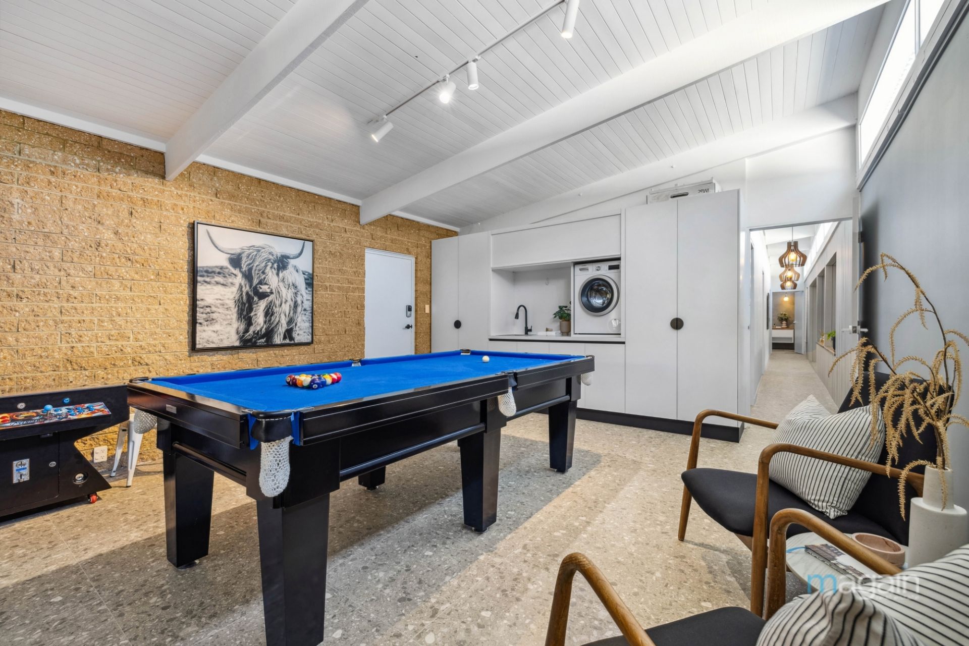 There is a separate games/rumpus room at the end of the hall where you'll find a built-in laundry area that offers plenty of handy storage and provides direct access out to the side verandah.