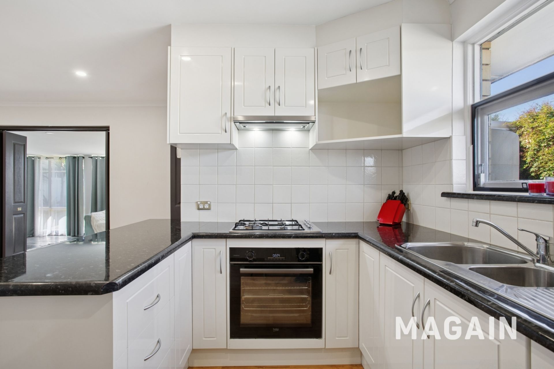 Step inside to a welcoming living room on entry, complete with in wall heating and a split system for year round comfort. Flowing seamlessly through to the dining and kitchen, the layout is designed with everyday living in mind. The kitchen is neat and functional, with a gas cooktop, electric oven, dual sink and ample storage.