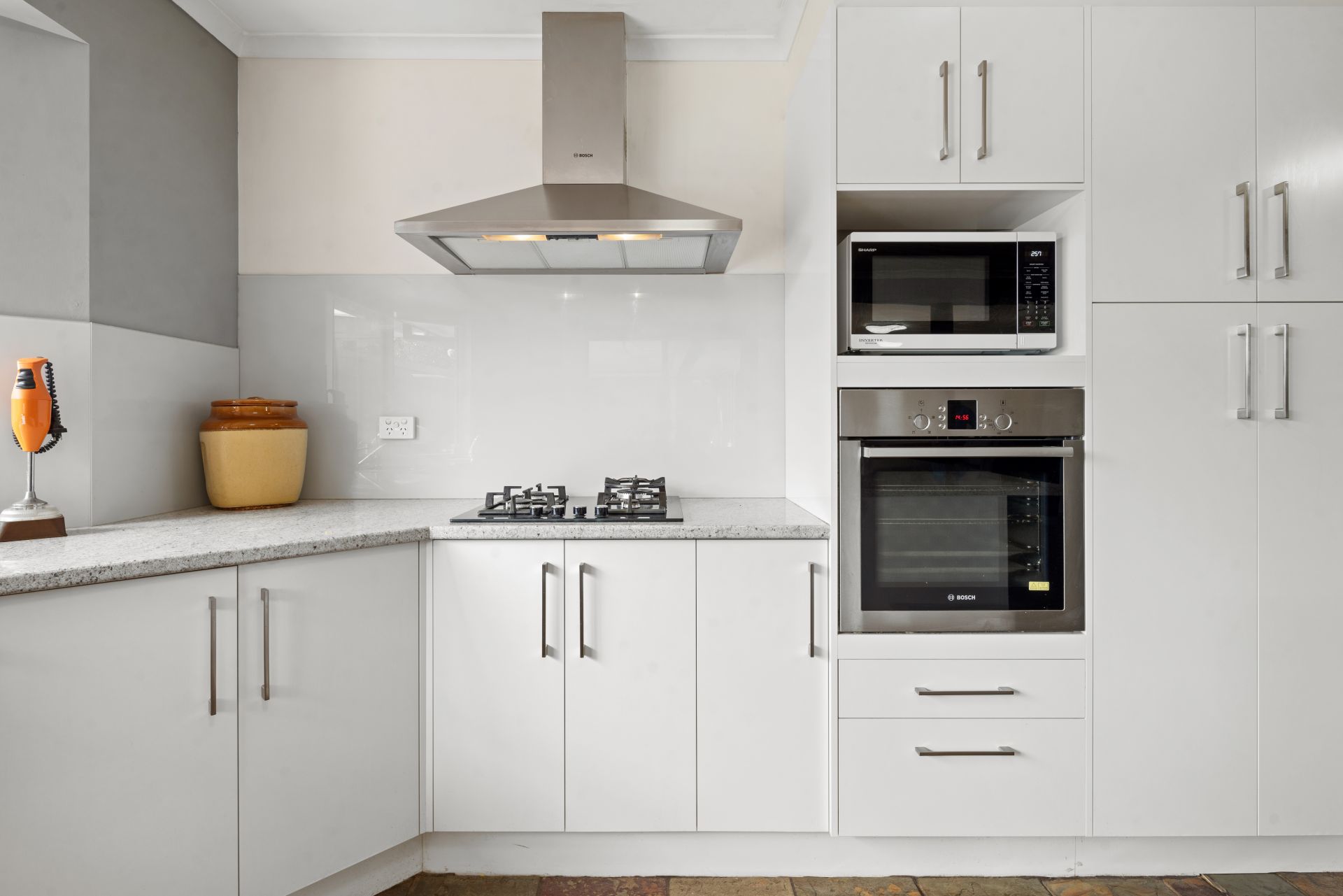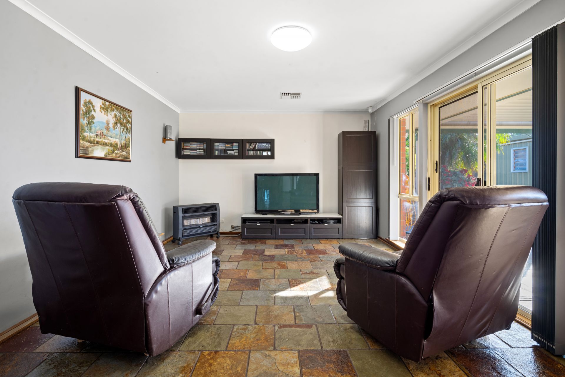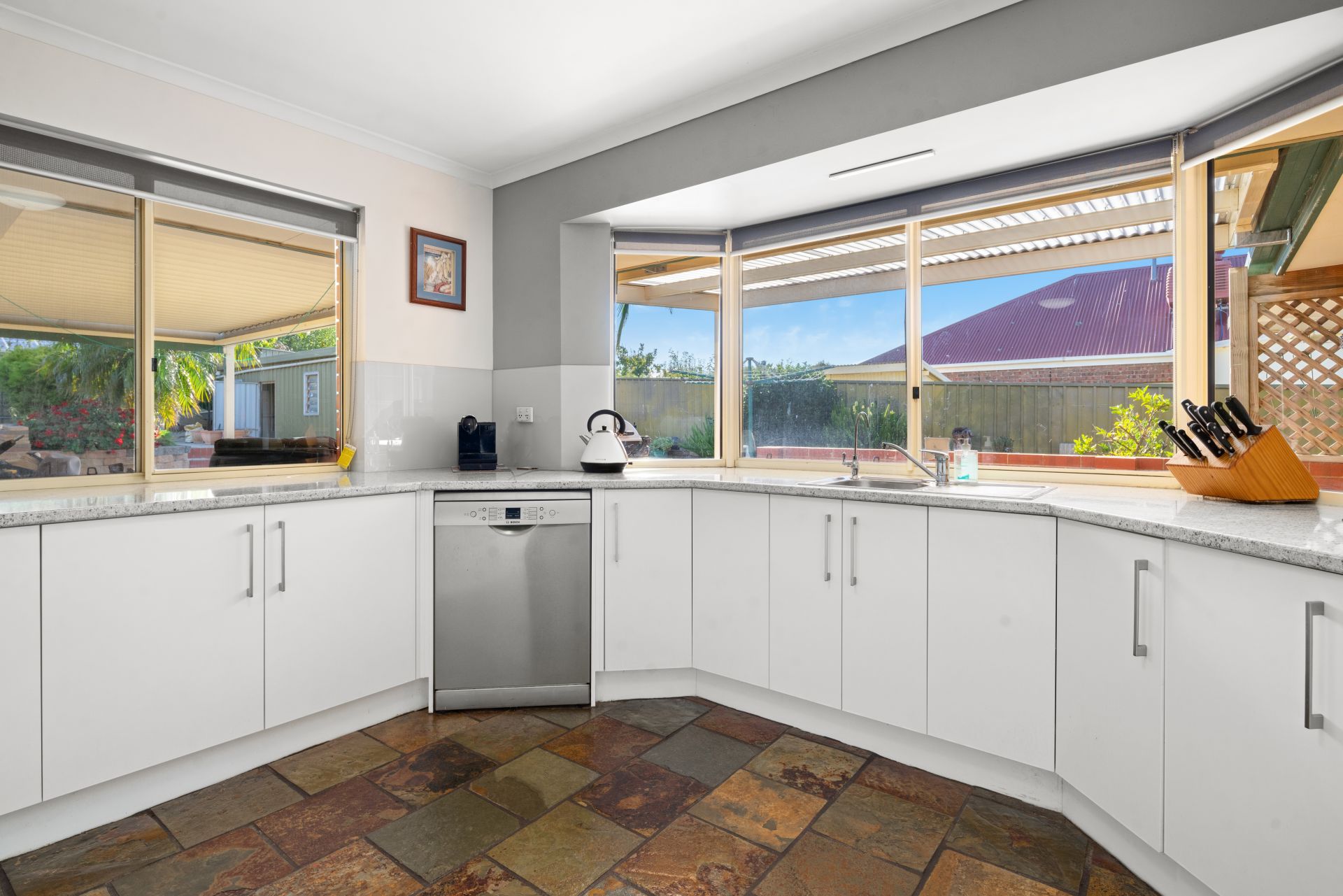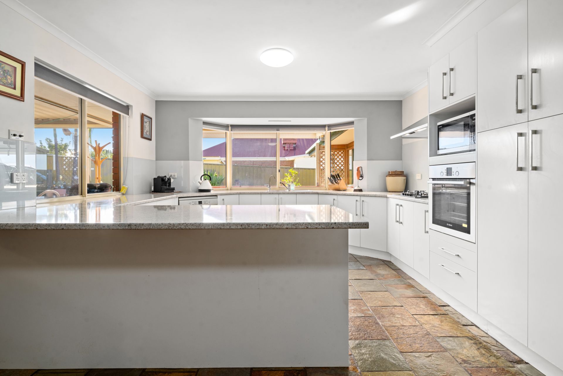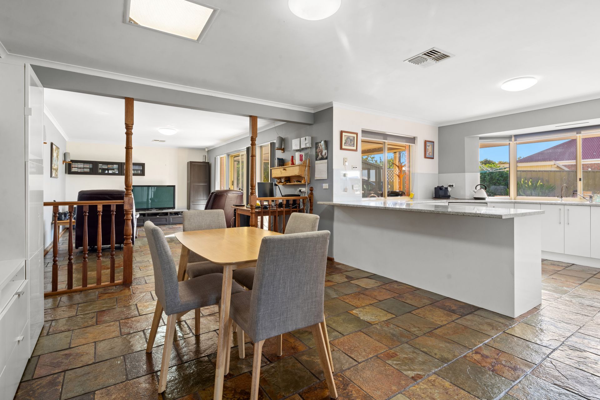 There's lots of room in this kitchen with heaps of cupboards, dishwasher, and gas cooktop. The kitchen/meals area and family room have slate floors throughout.