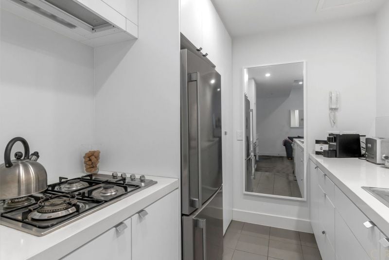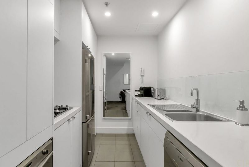 - Sleek galley kitchen with Caesarstone benchtops, Bosch dishwasher and Smeg 4 gas hob & electric oven
