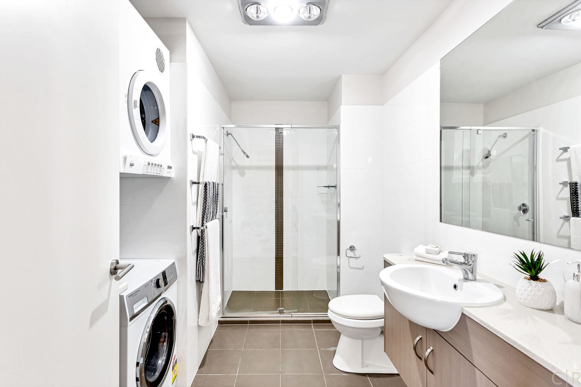 * Sparkling bathroom with integrated laundry