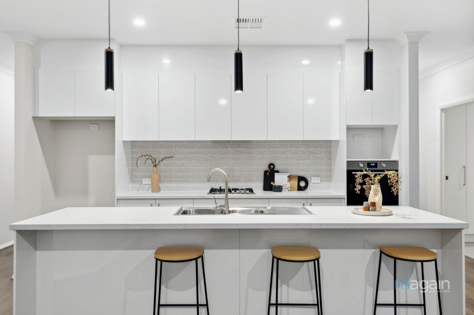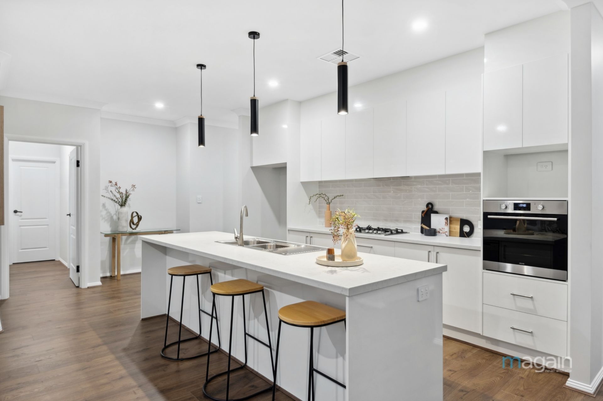 Flowing down the hallway you're greeted by the well appointed galley style kitchen which overlooks the living and dining areas. The kitchen contains stainless steel appliances and a gas cooktop. An island bench with dishwasher, double sink along with soft closing drawers and cupboards, breakfast bar seating area and large walk in pantry around the corner which completes this impressive Kitchen.