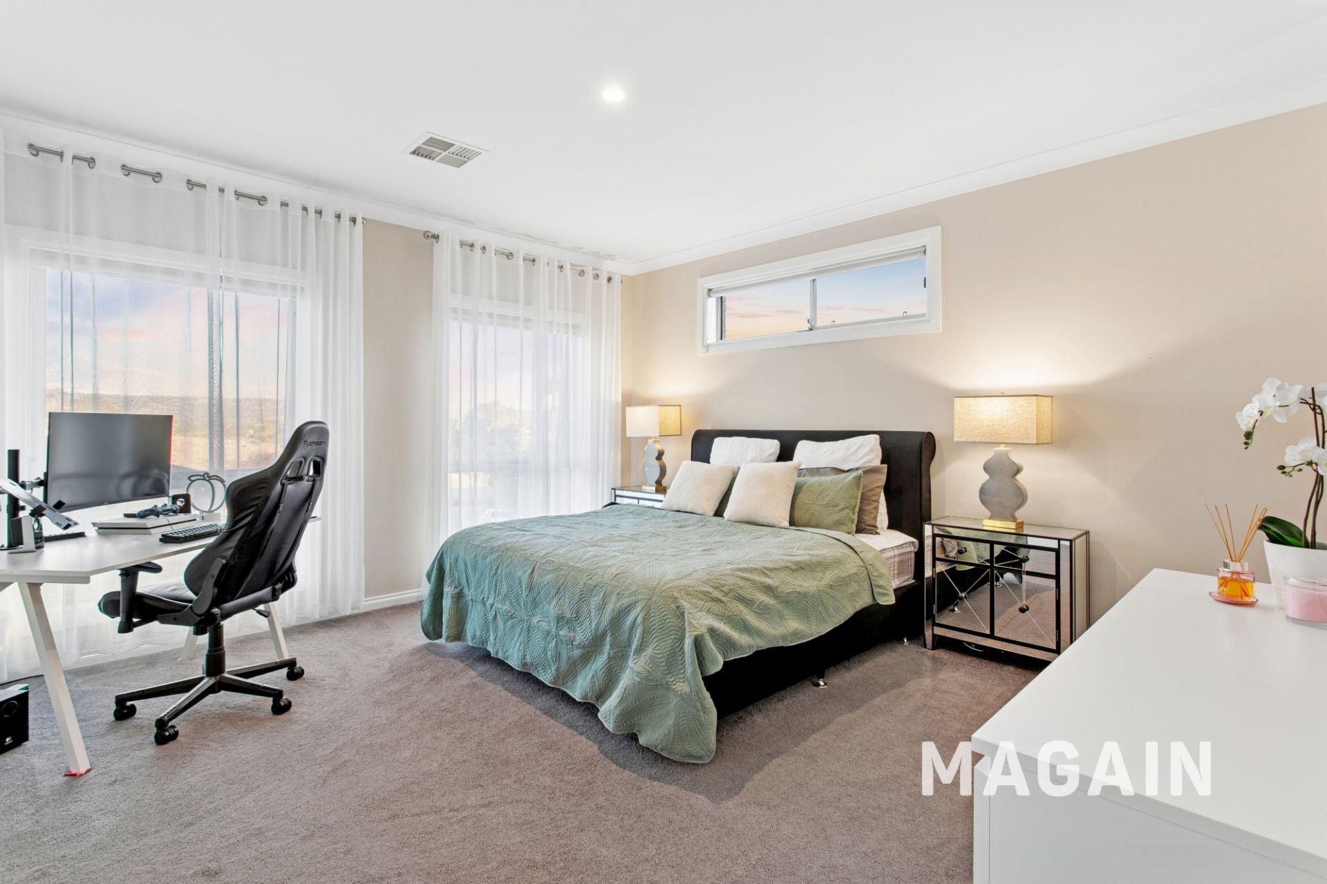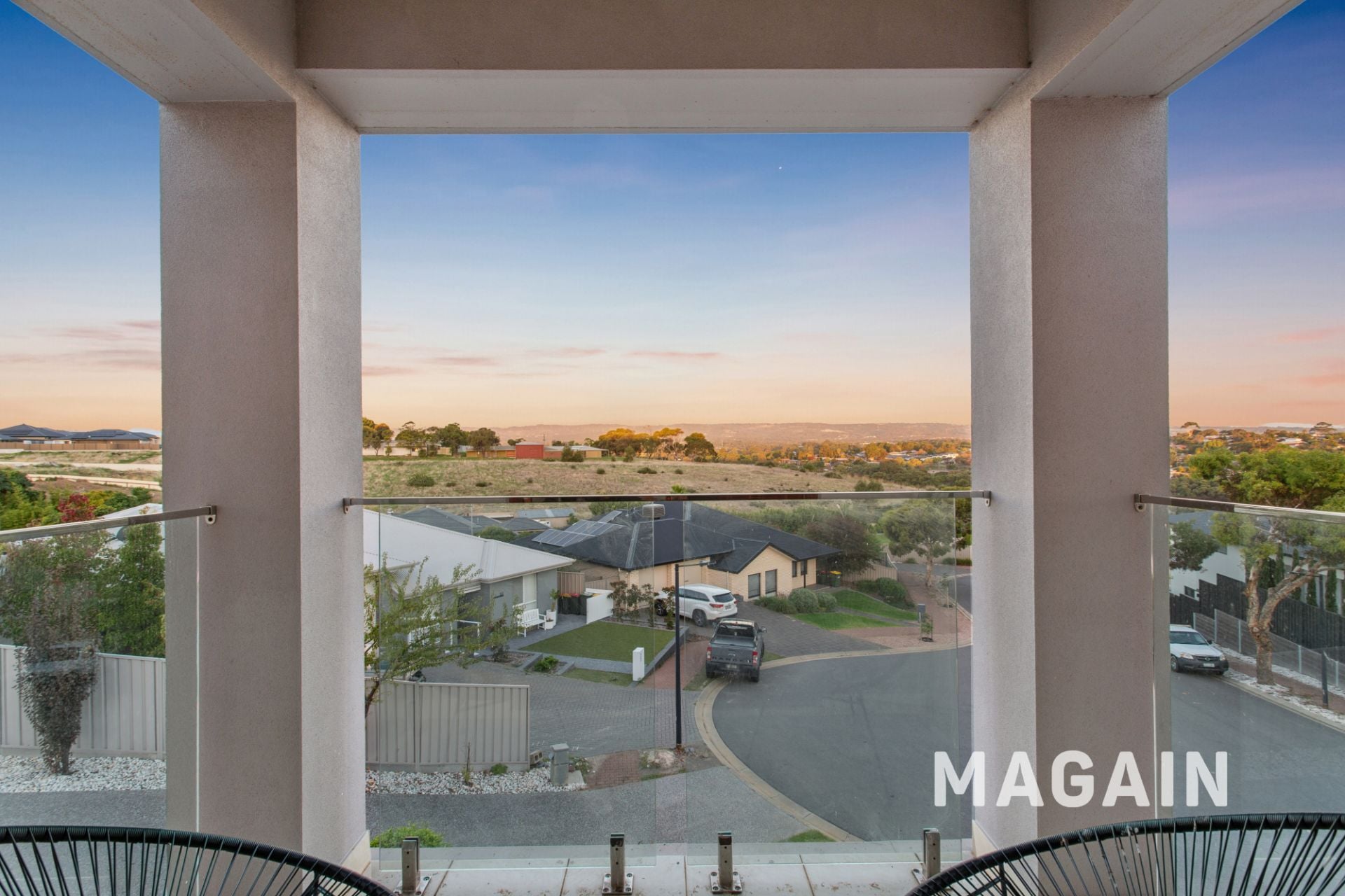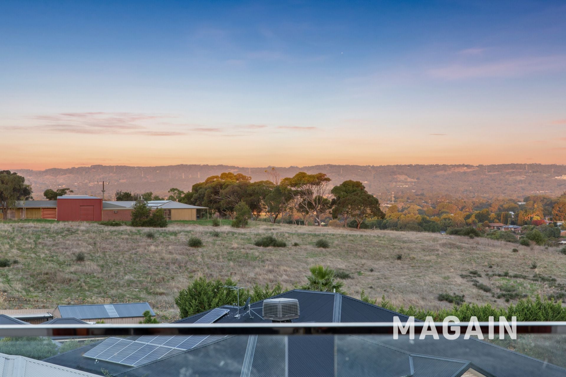 A staircase from the open-plan living area leads to the second level, where bedrooms two and three await, along with access to a stylish three-way bathroom featuring stone benchtops and floor-to-ceiling tiles. The master suite on this level boasts a spacious ensuite and a walk-through his and hers closet, complemented by its own private balcony offering breathtaking views across the hills and valleys of Sheidow Park. Ample storage solutions are provided, including a dedicated storage room.